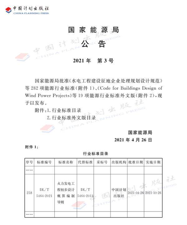 | 公 告 | 国家能源局 公告 2021年第3号 国家能源局批准《水电工程建设征地企业处理规划设计规范》等282项能源行业标准(附件1)、《Code for Buildings Design of Wind Power Projects》等19项能源行业标准外文版(附件2),现予以发布。 附件:1.行业标准目录 2.行业标准外文版目录 国家能源局 2021年4月26日 |