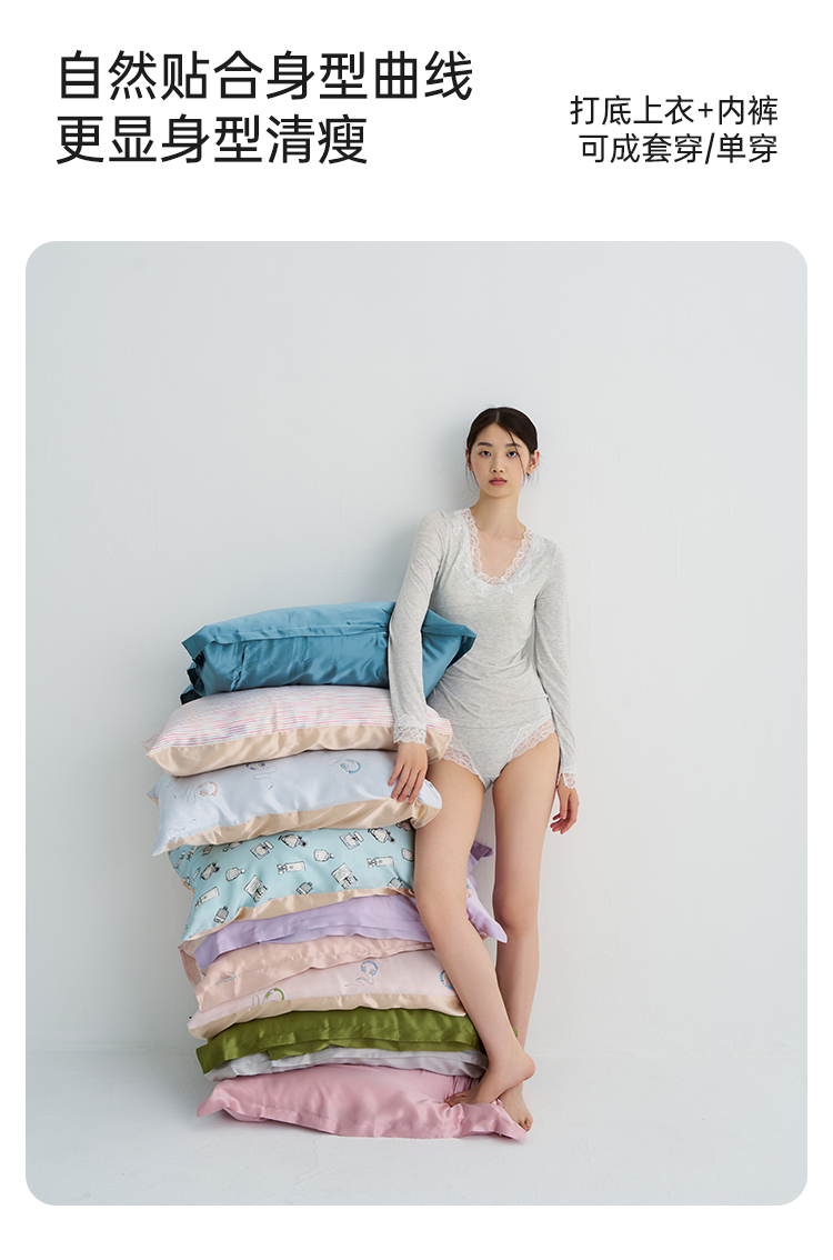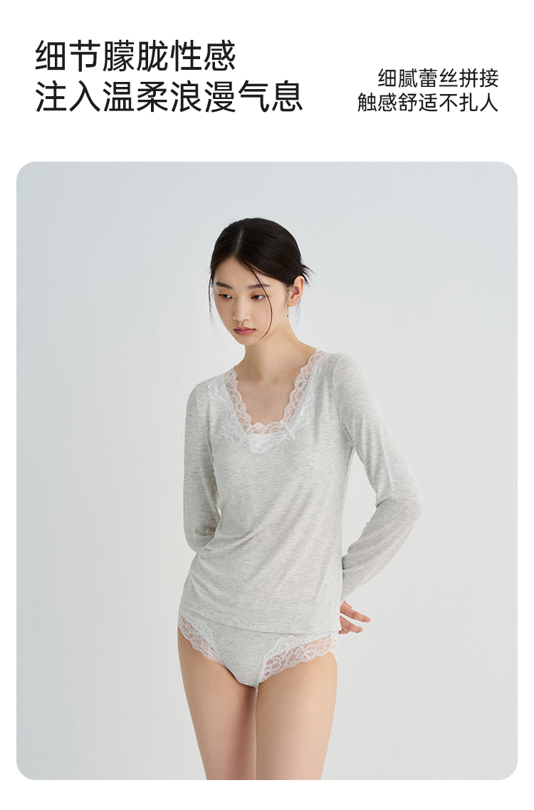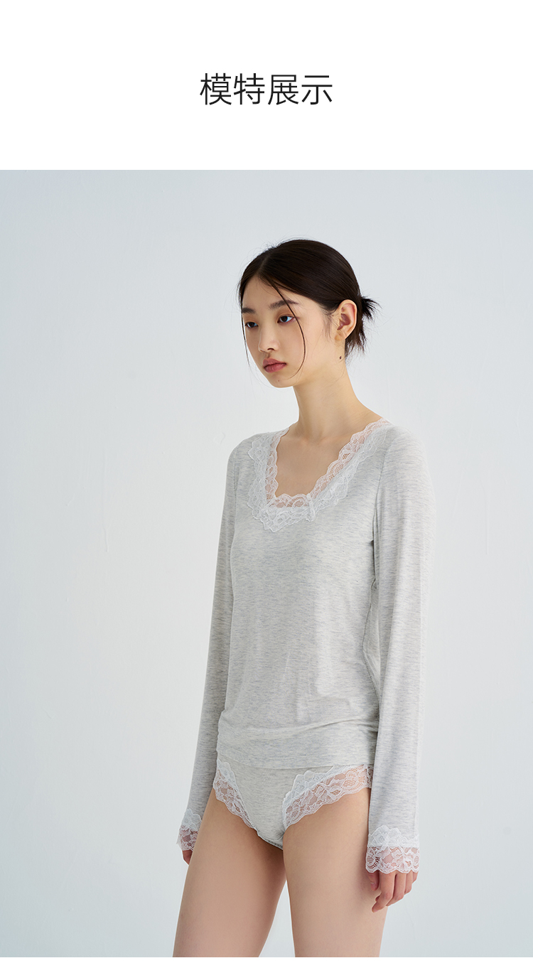 贴身裸感』桑罗长袖短裤无痕打底套装防凸点免穿文胸蕾丝拼接设计