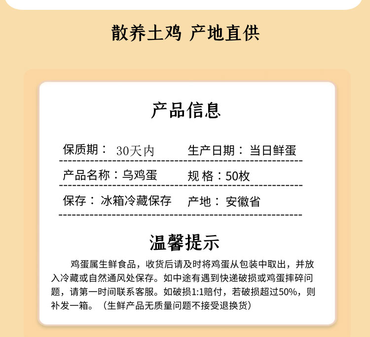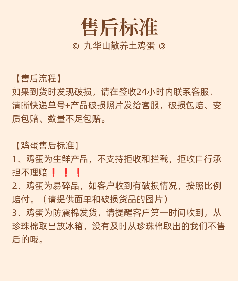 【品名】九华山 富硒土鸡蛋/散养绿壳乌鸡蛋 营养美味 产地直采 顺丰发货 【规格】 土鸡蛋30枚*1箱(净重1150-1250g) 土鸡蛋60枚*1箱(净重2300-2400g) 乌鸡蛋50枚*1箱(净重1850—1950g) 【产地】国内 【发货包装】独立包装 【发货地】安徽 【发货快递】顺丰 【不发货区域】西藏、新疆、内蒙、宁夏、甘肃、海南、青海、黑龙江、吉林、港澳台、四川(甘孜、阿坝、凉山)、云南(昆明) 【发货时效】48-72小时,周末节假日顺延 【售后说明】生鲜产品不支持拦截/七天无理由退货! |