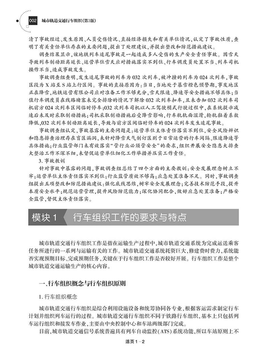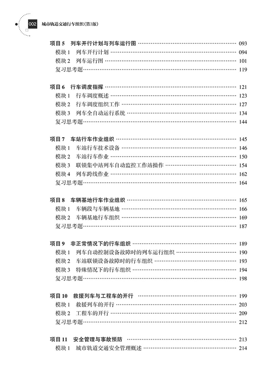 本书是;十四五职业教育国家规划教材。全书主要内容包括行车组织工作概述、行车基础设施设备、信号系统、行车闭塞法、列车开行计划与列车运行图、行车调度指挥、车站行车作业组织、车辆基地行车作业组织、非正常情况下的行车组织、救援列车与工程车的开行、安全管理与事故预防共11个项目,每个项目包括若干模块,采用活页式装订。本书可供职业院校城市轨道交通类专业及相关专业教学选用,亦可供行业相关培训使用。