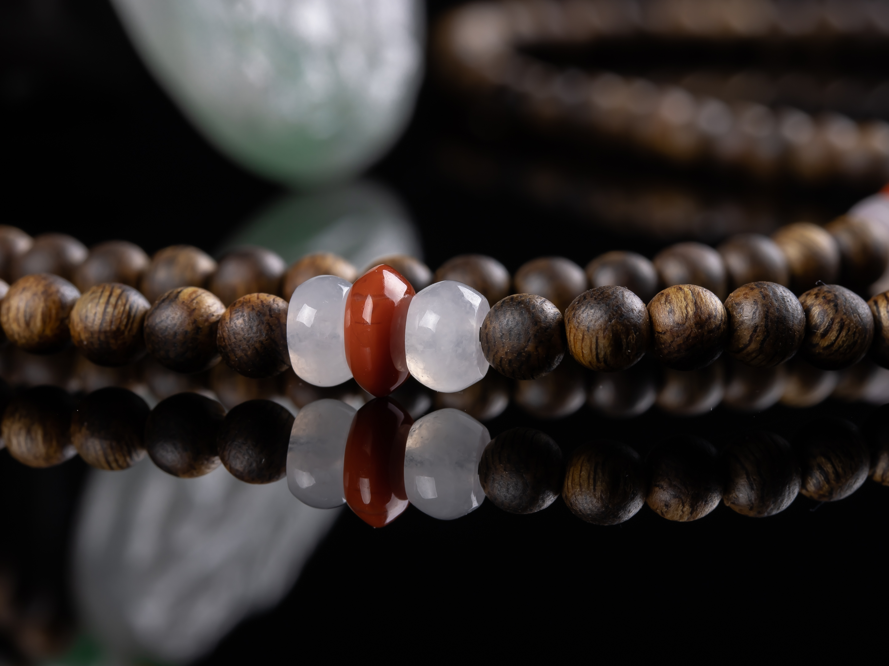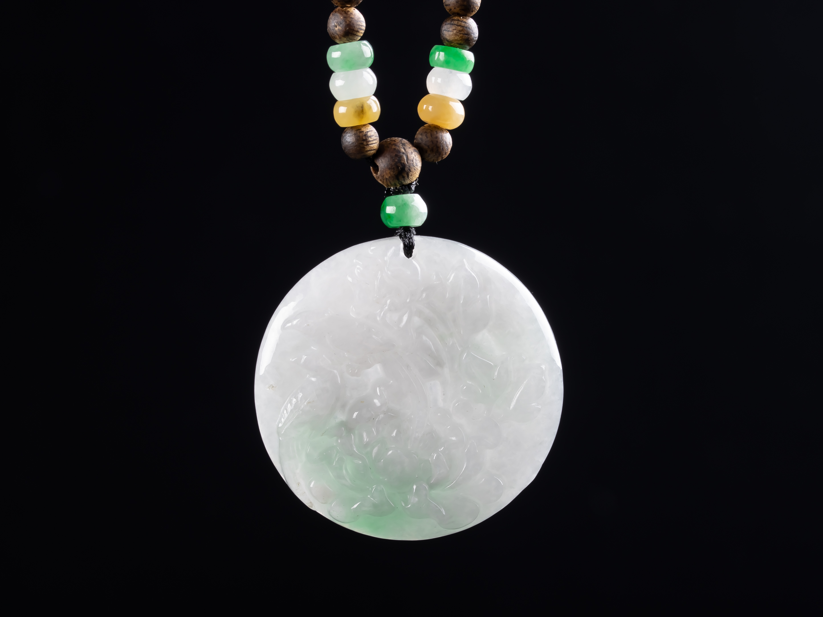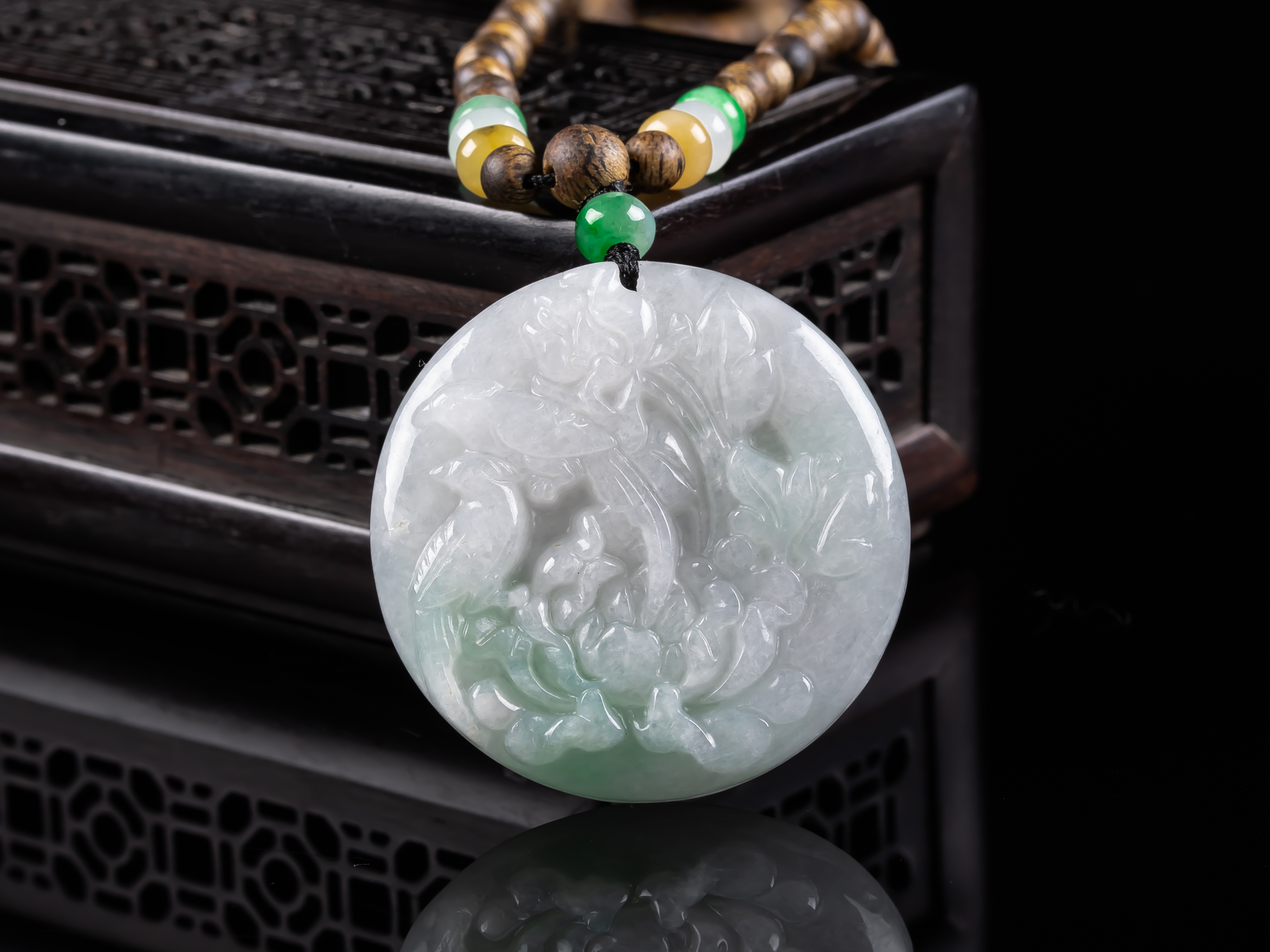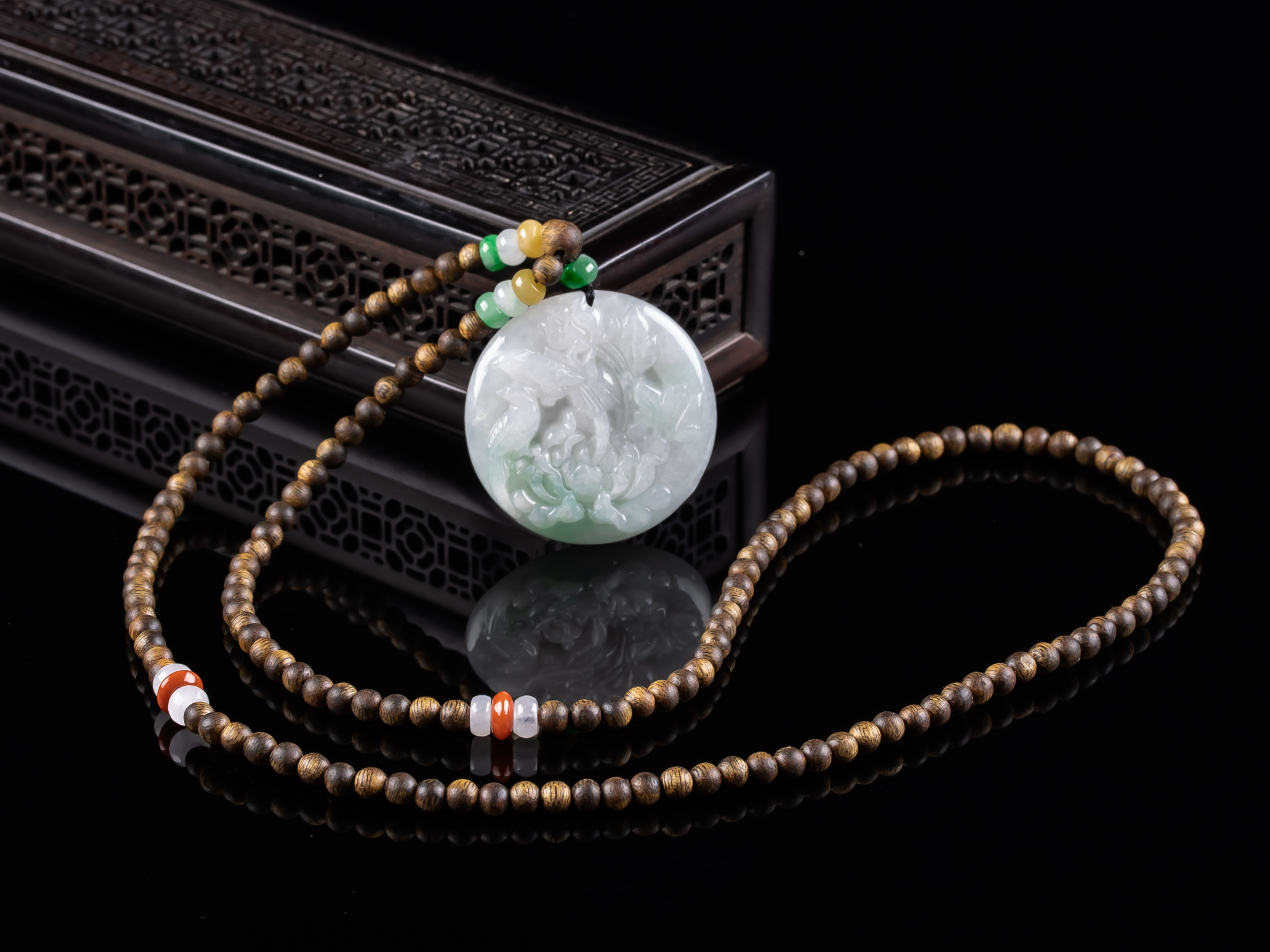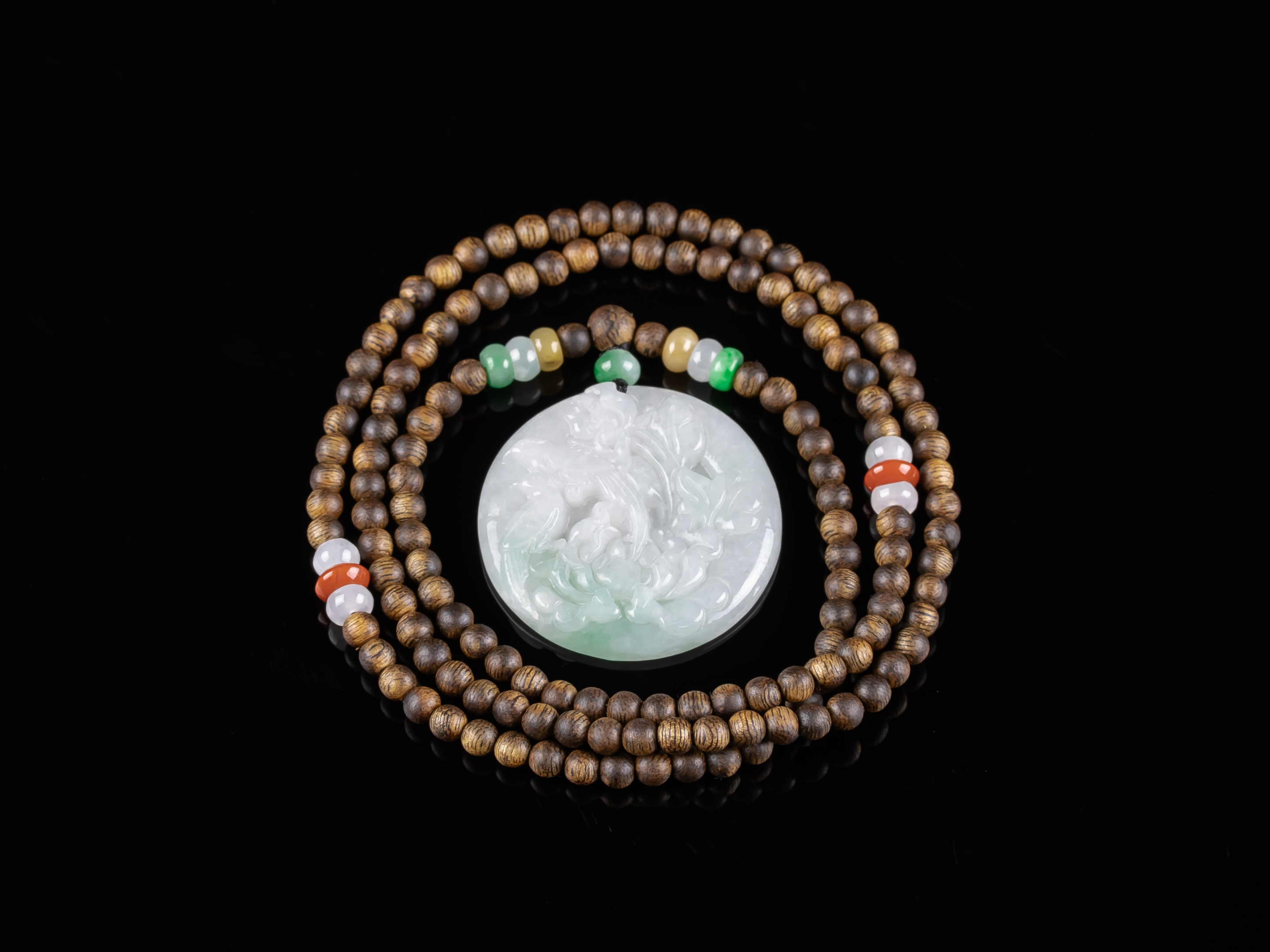 沉香+翡翠花开富贵喜上眉梢挂件,天然沉香圆珠4.8mm,原色原味,香味清甜自然,配件:翡翠、南红。糯底飘色翡翠圆牌,40.5*5.5mm,花开富贵,喜上眉梢,雕刻精细,完美无纹裂。款式简约中国风,时尚百搭。