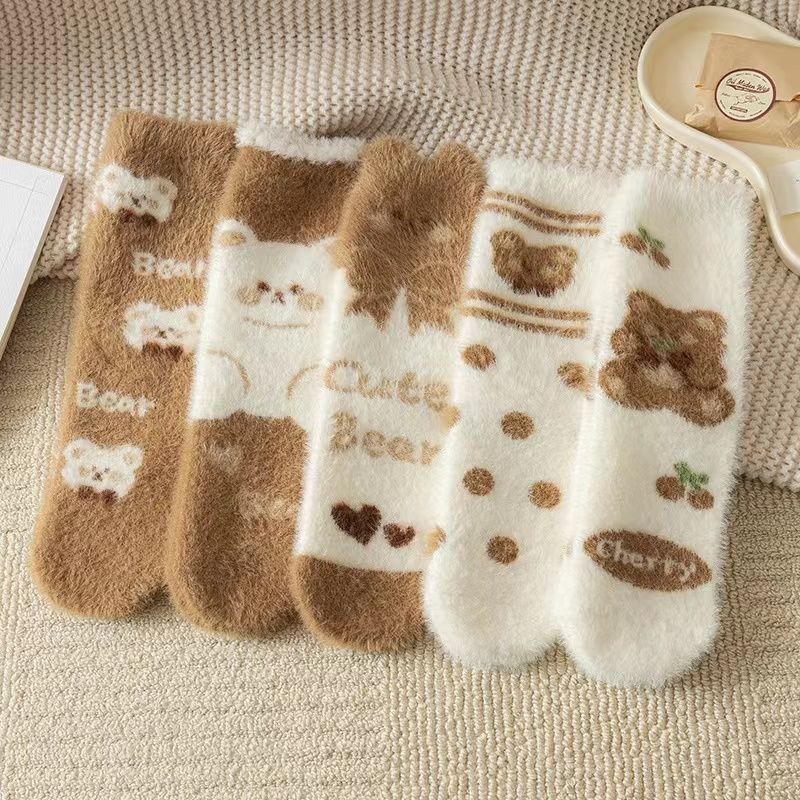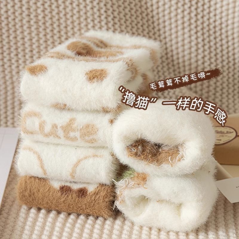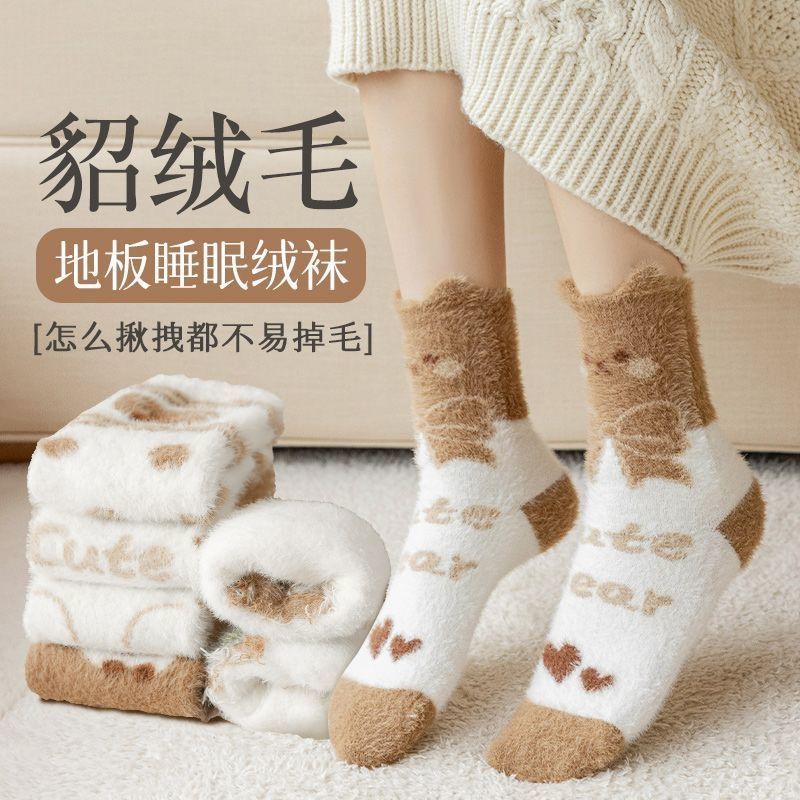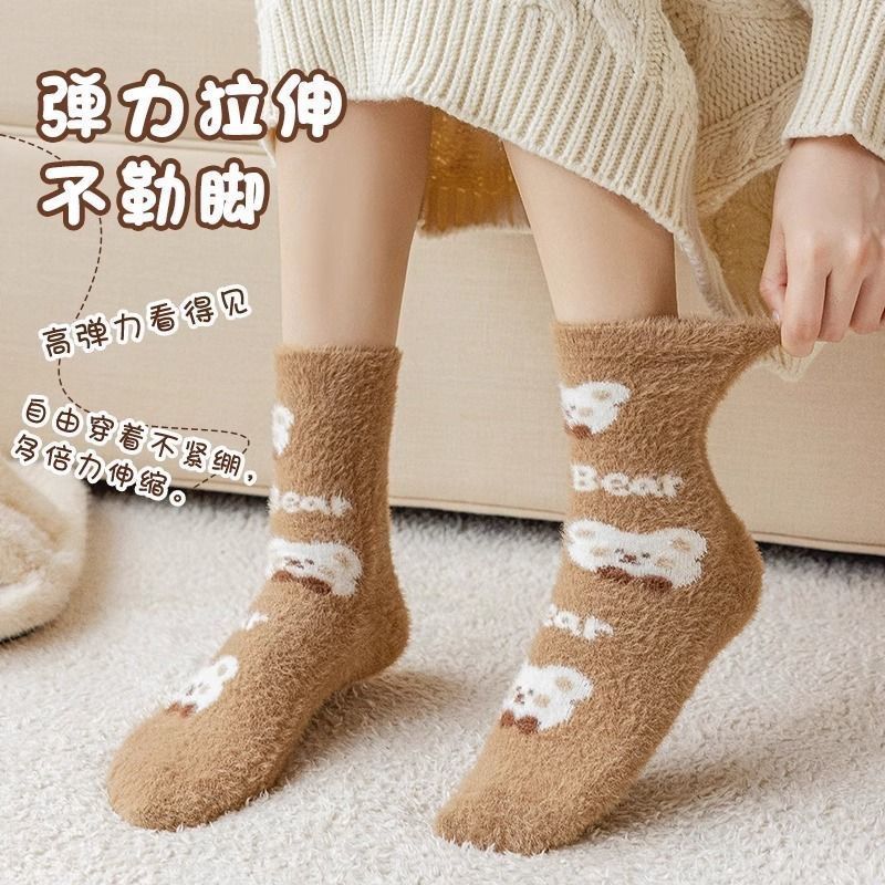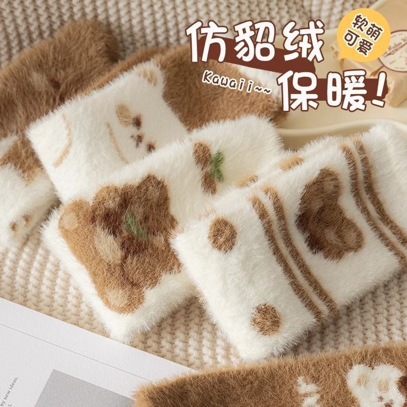 限时抢❗️19.9秒3双【保暖锁温❗️软fufu | 可爱萌趣 | 干爽亲肤】加厚秋冬季女加绒珊瑚绒水貂绒吸汗中筒袜毛茸茸咖色袜子卡通袜子。hb