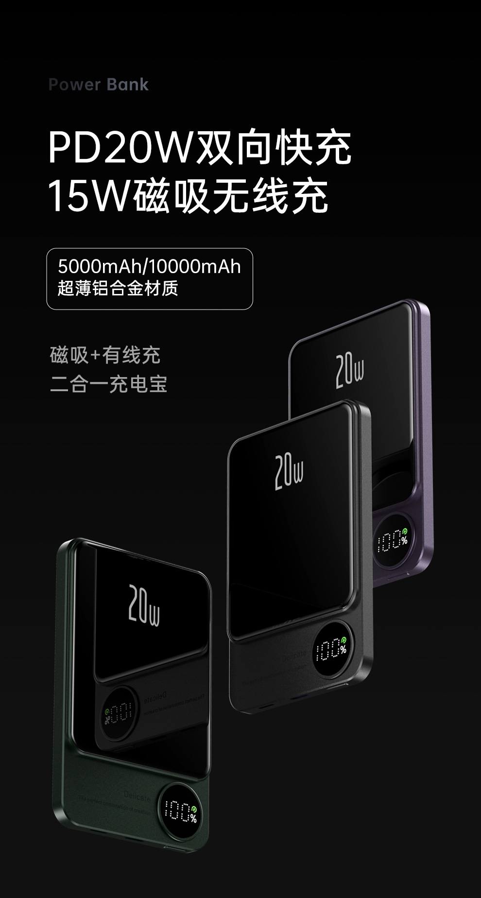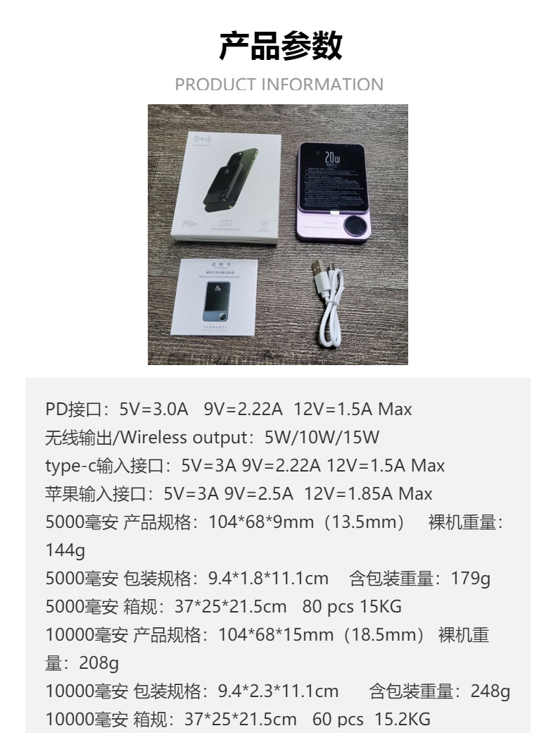 严选充电宝【超薄强磁吸双向无线快充】紫无线有线二合一移动电源20w快充便携10000毫安