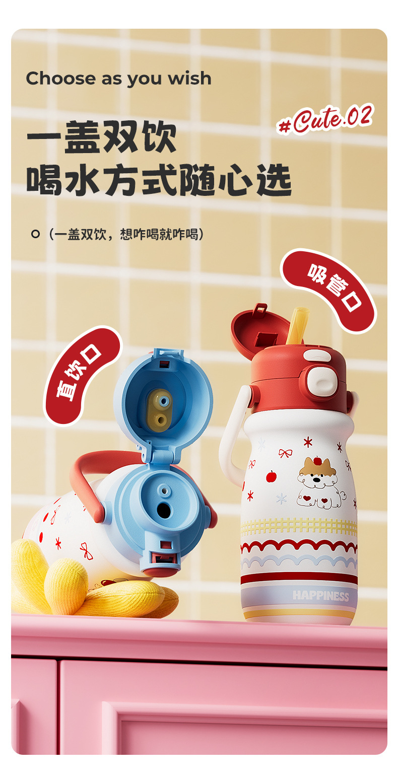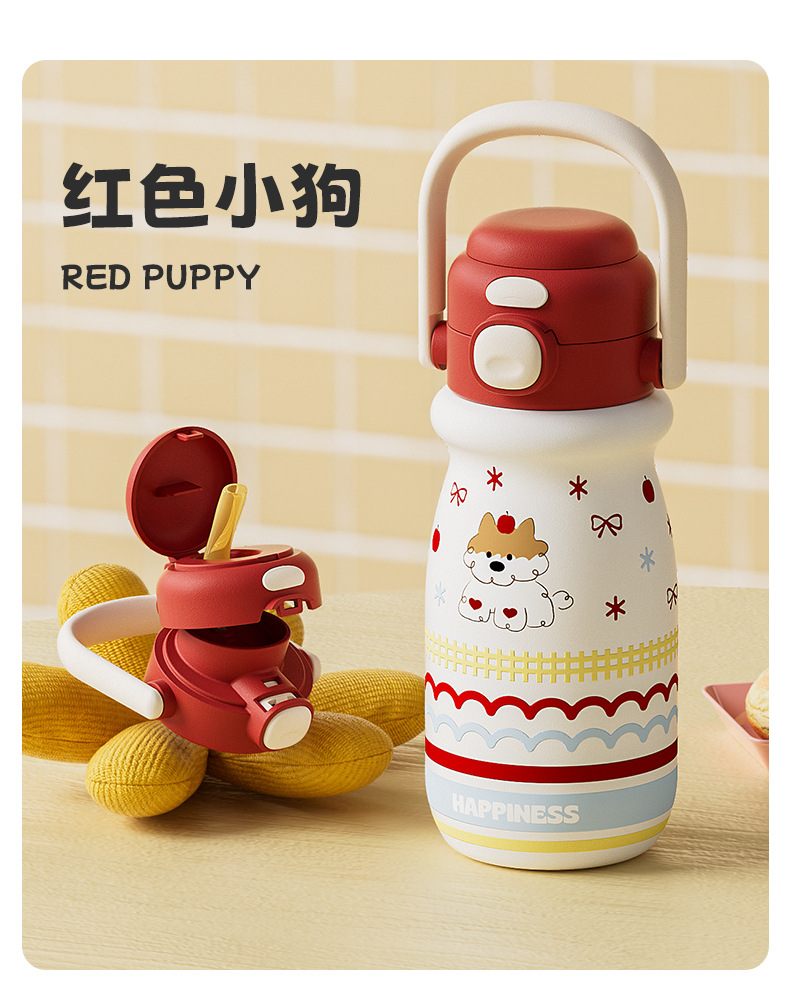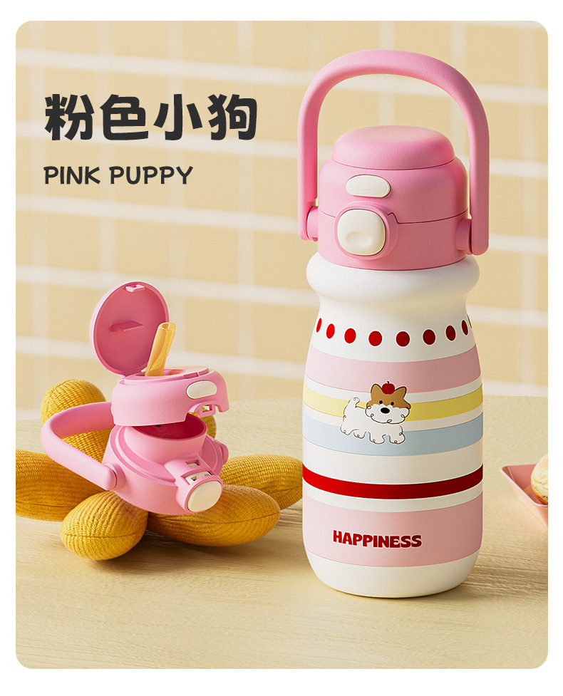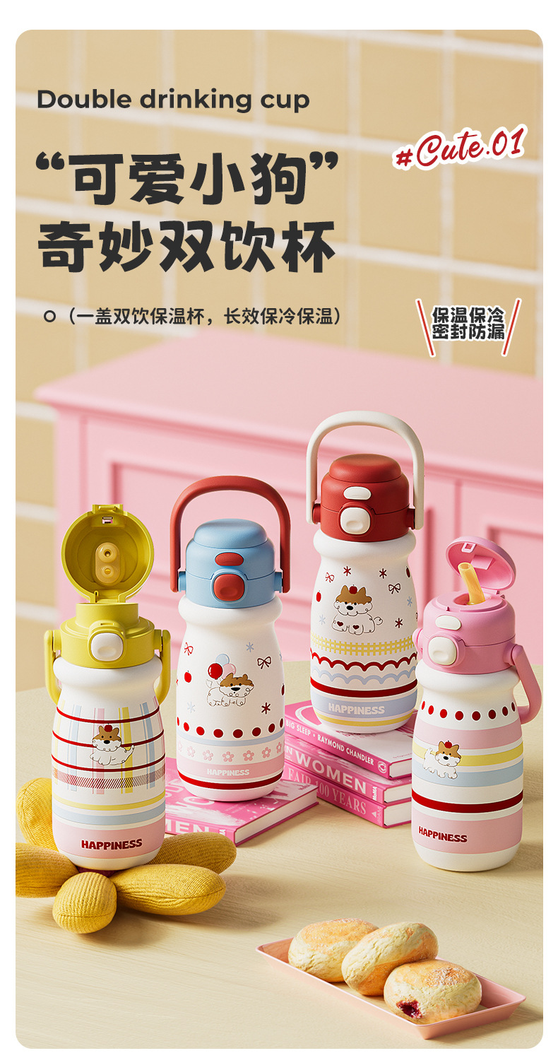 小奶狗卡通儿童双饮弹跳吸管水杯带手柄便携随手杯子不锈钢保温杯