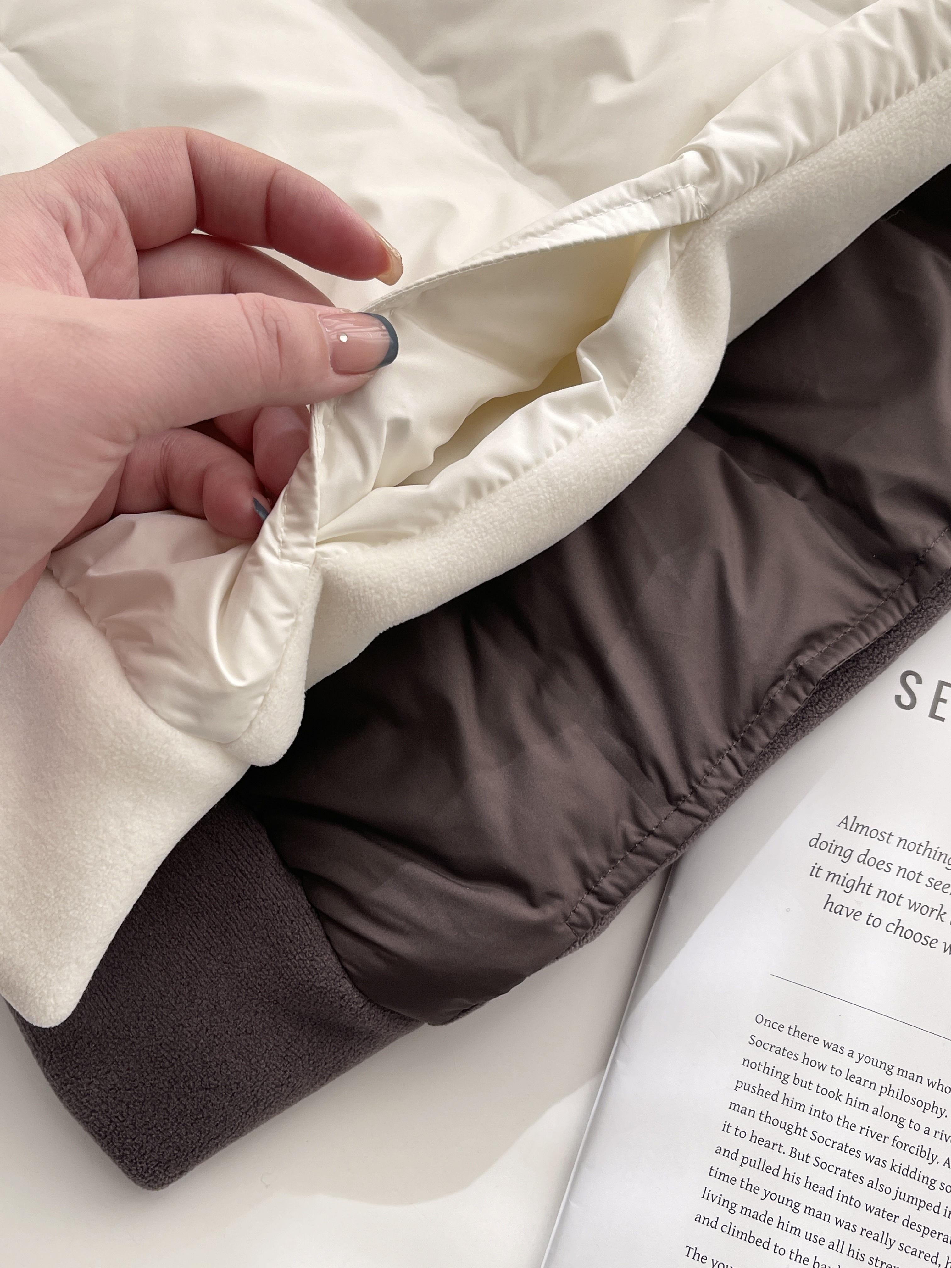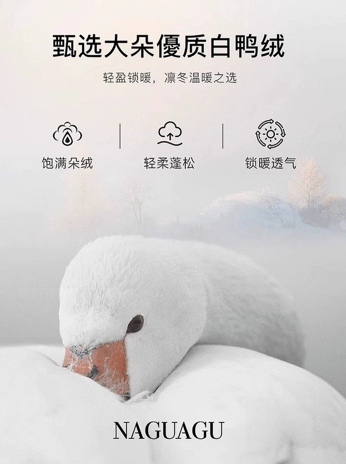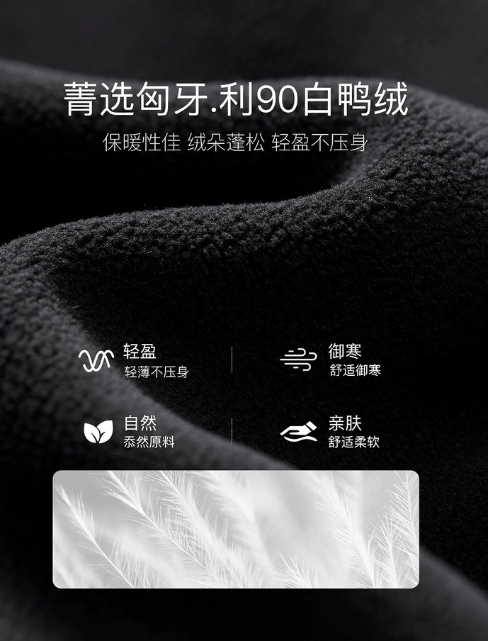 内里鸭绒源自国内最大羽绒供应商。高蓬松无异味,轻得起飞,暖得离谱,0异色0异味0压感。