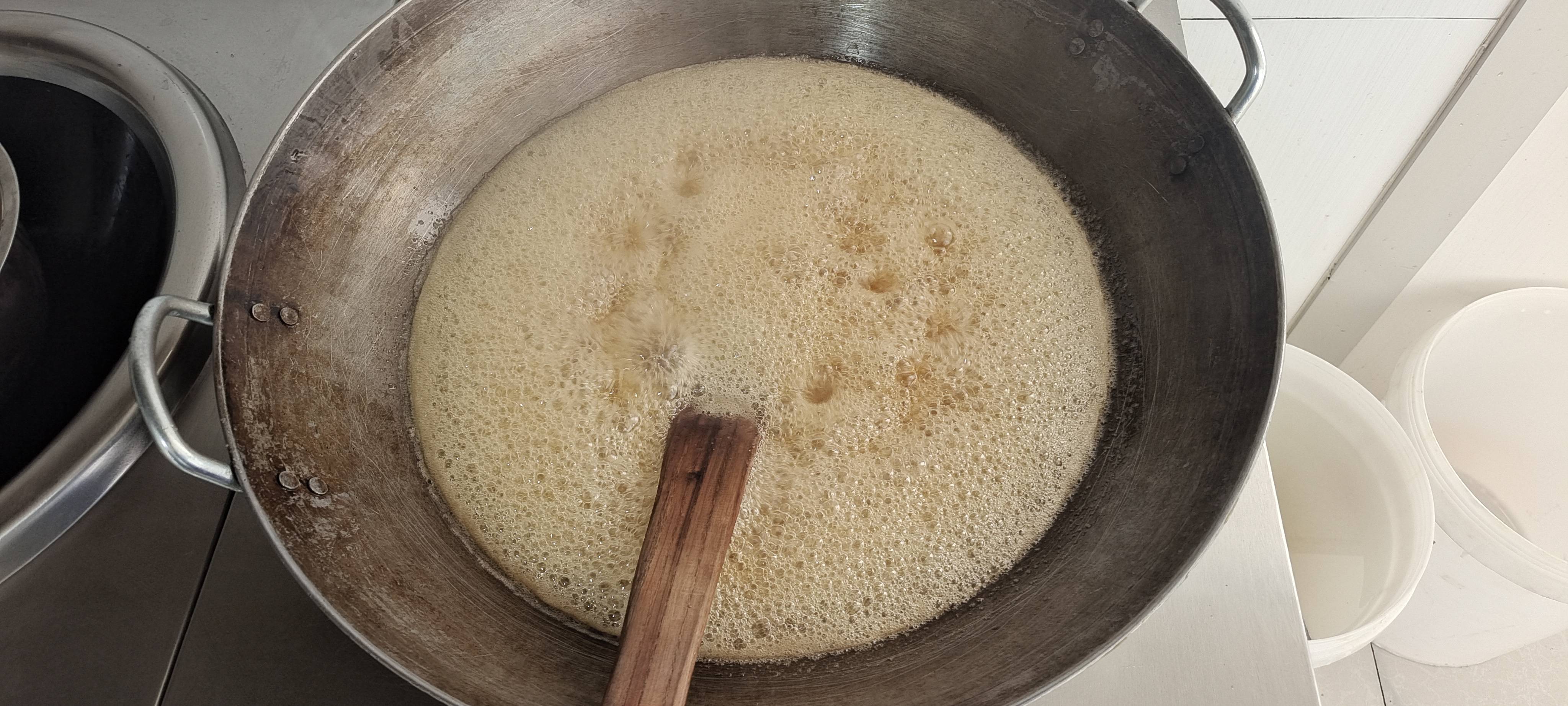 我们一直坚持小锅熬浆,也可以叫做熬糖
