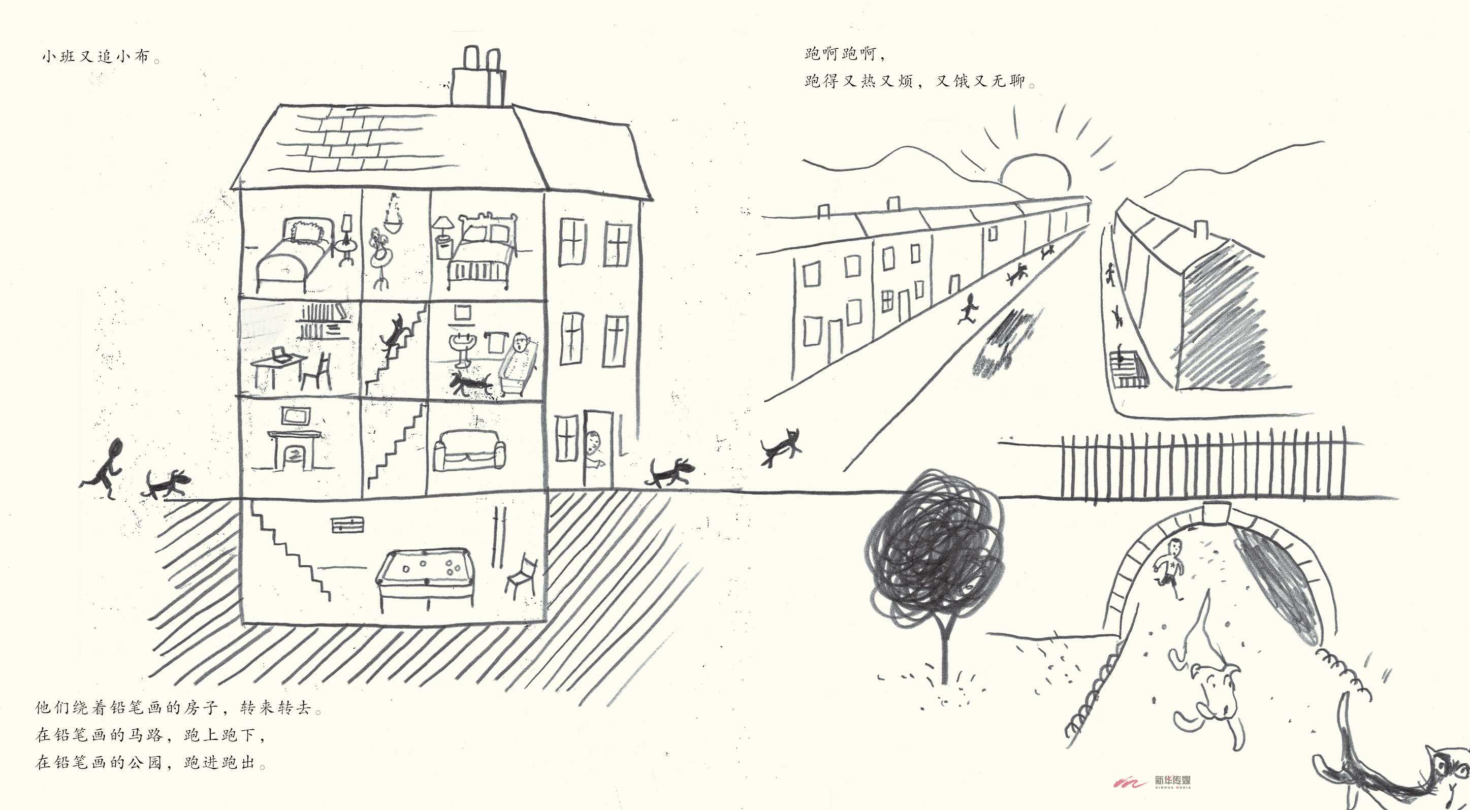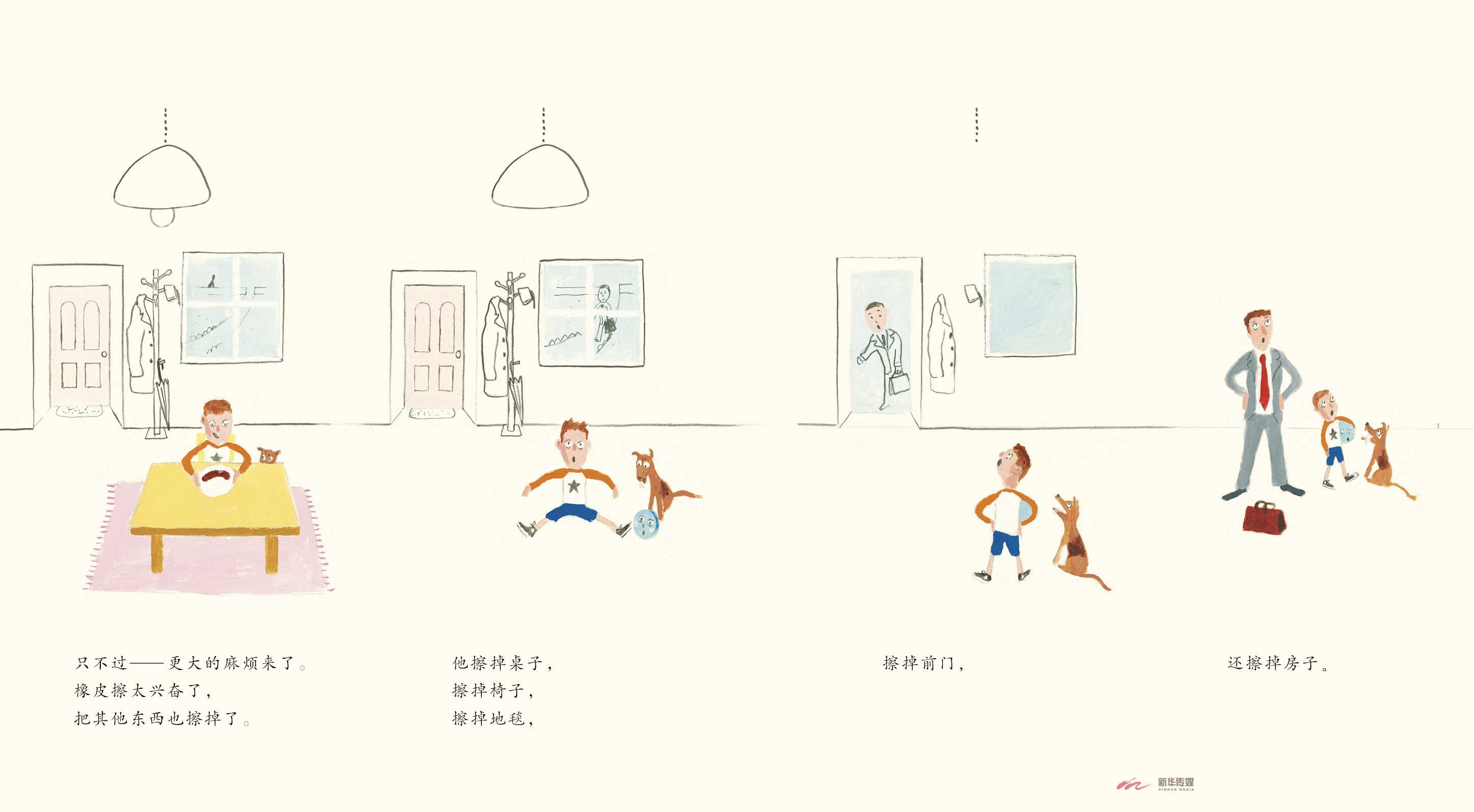 这本图画书保留了铅笔特有的笔触质感,线条中带有着细小的颗粒。头发、大树、阴影用笔看似犹如乱麻,却饱含涂鸦的韵味。妙的是两块橡皮擦互擦,奔放的铅笔线团漩涡充满整个画面,插画师再用橡皮擦当笔以虚破实,两块橡皮擦的脸在漩涡内相互对视着,胶着战斗的气势扑面而来。全书纤细的人物形象,始终如一的稳定的水平构图,柔和的色彩合成了内敛的画风,用孩童涂鸦般的绘画表现风格为我们描绘了一个个清新自然的画面。