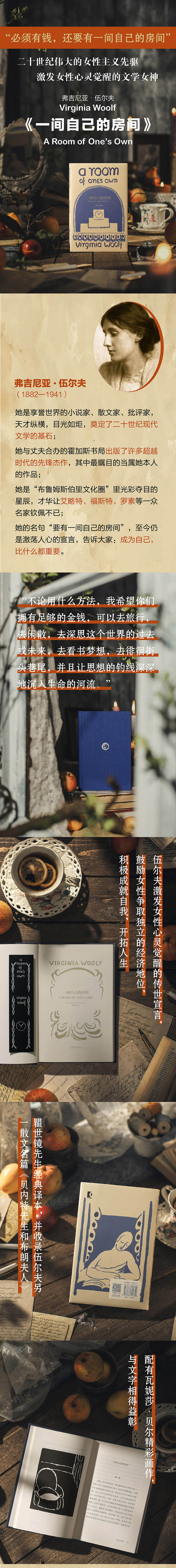 1928年10月,伍尔夫以“女性与小说”为题,在剑桥大学的两个女子学院做了两次演讲。第二年,她将演讲内容整合成《女性与小说》一文发表,后来又将其大幅修改和扩充,最终写出了传世名作《一间自己的房间》。这篇长文细腻风趣,充满想象力,处处闪烁着睿智的光芒,讲述了在一个男性占统治地位的社会里,女性生存的困境、历史对女性的偏见、女性贫困对创作的影响等问题,鼓励女性争取独立的经济地位,积极成就自我,开拓人生。