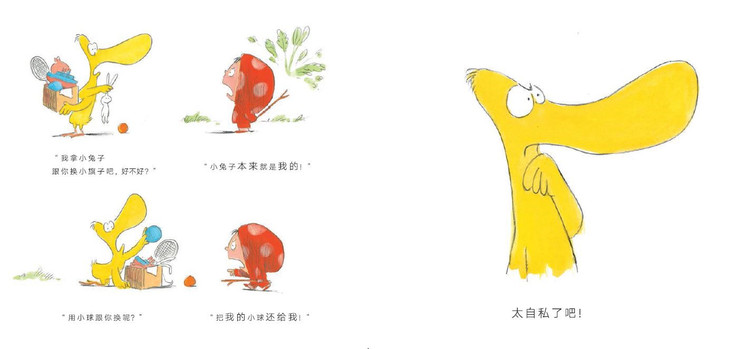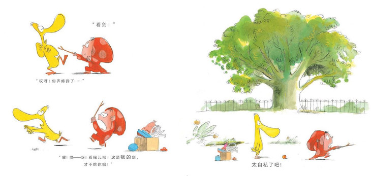 鸭鸭和点点发现了一根小木棍, 点点想用它做一把剑,可鸭鸭想做一杆旗子, 点点怎么都不肯和鸭鸭分享这个新玩具……哎呀呀,太自私了吧! 你猜,鸭鸭会怎么办呢?