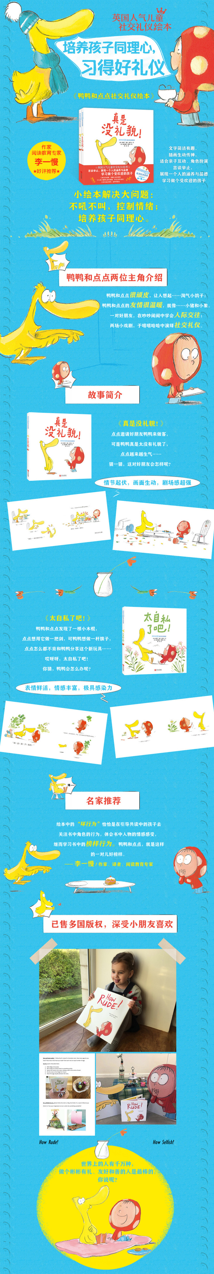 《鸭鸭和点点社交礼仪绘本》是一套英国人气儿童社交礼仪绘本。鸭鸭和点点,就像开巴士的小鸽子和小鸭子,又像小猪和小象。文字简洁有趣,插画生动传神,场景表现充满张力, 可以提高小读者的读图能力。
