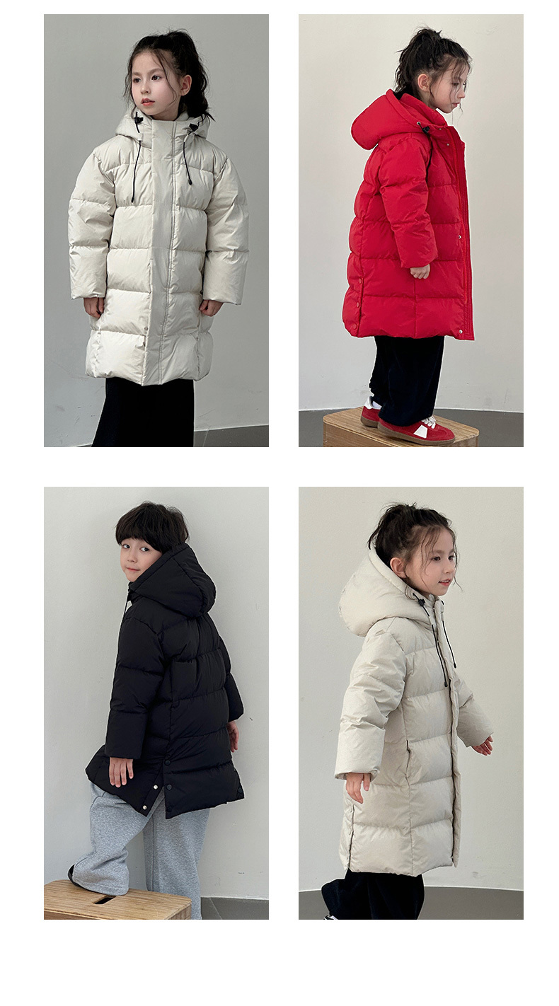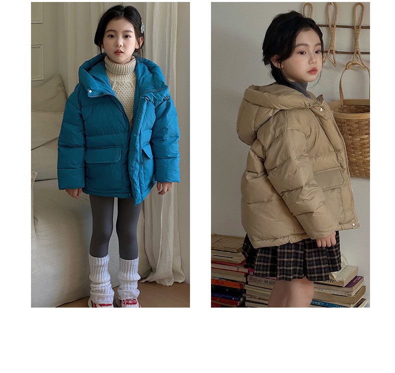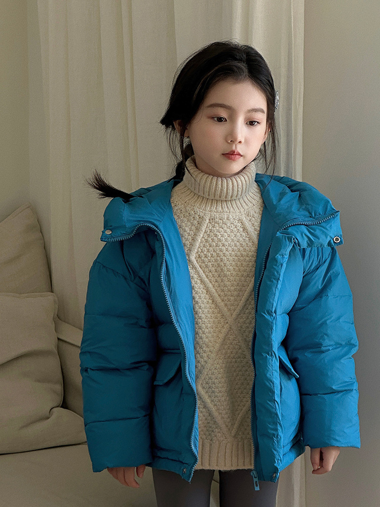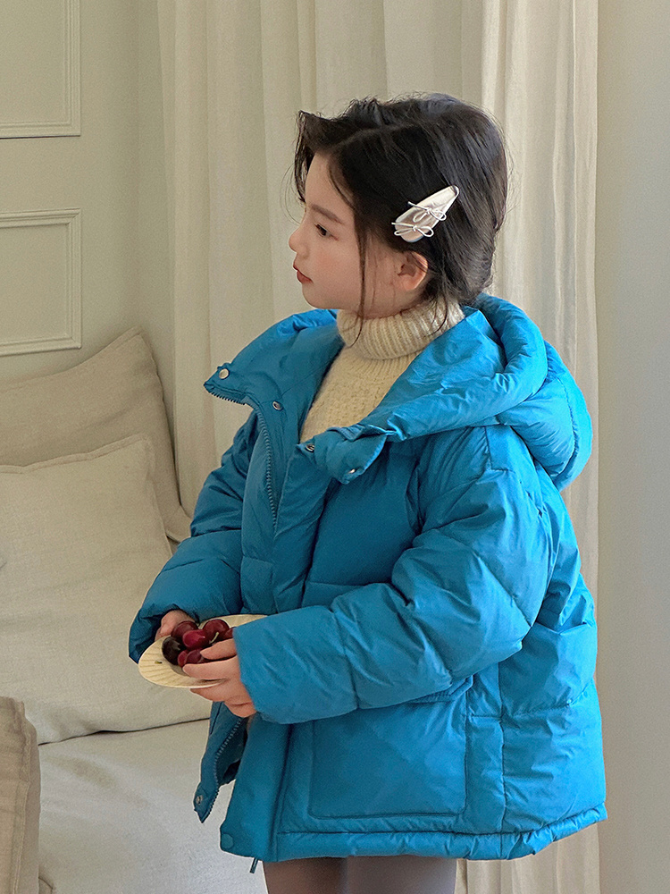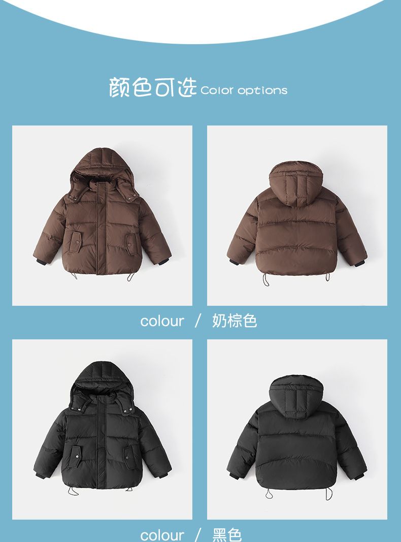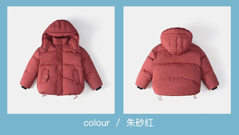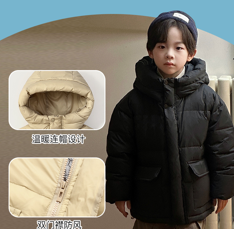 采用连帽设计,帽子用的是圆帽包边,更加保护孩子冬季不受冷风侵袭