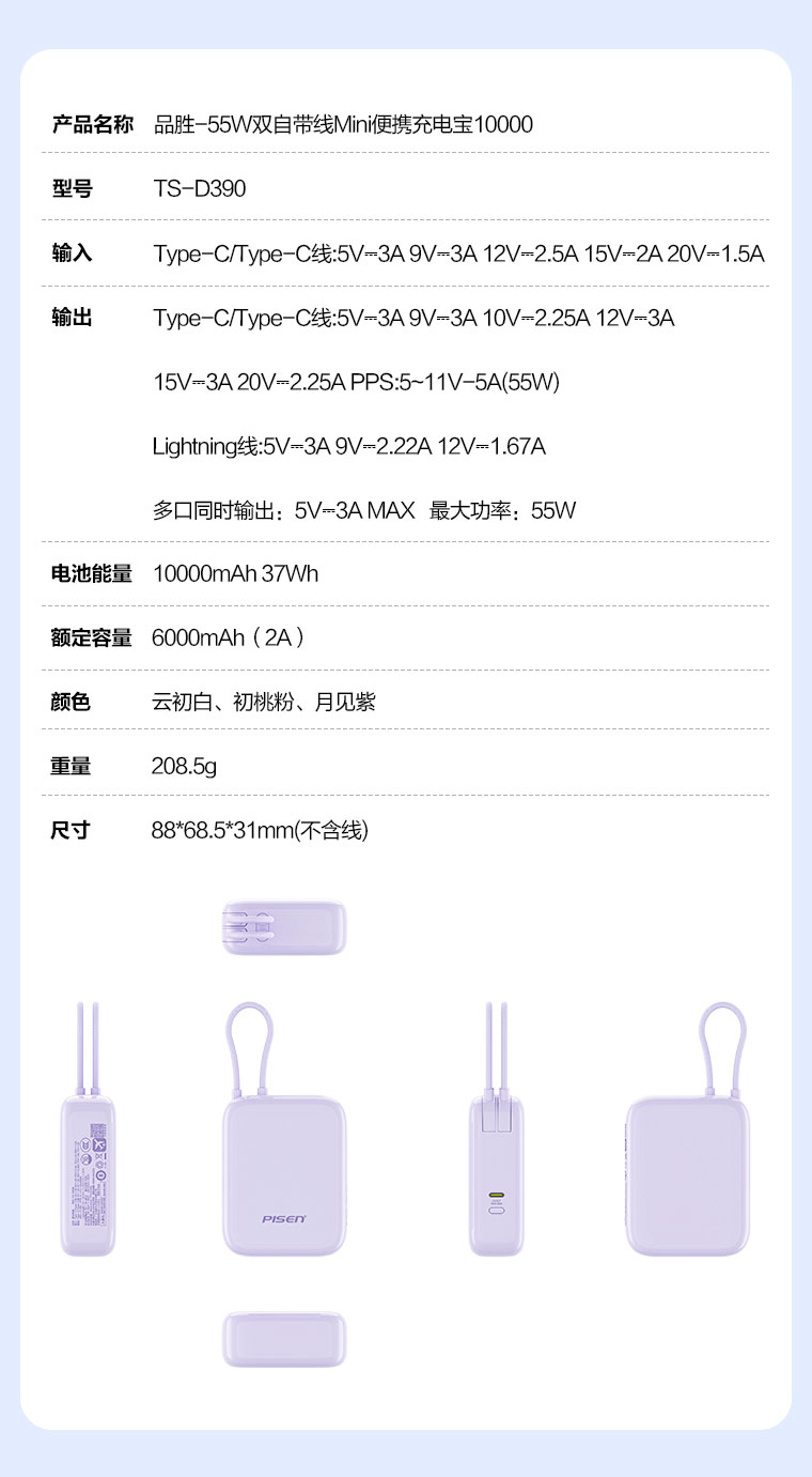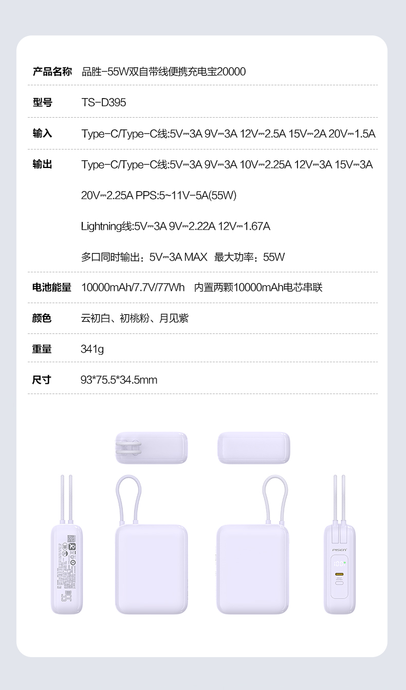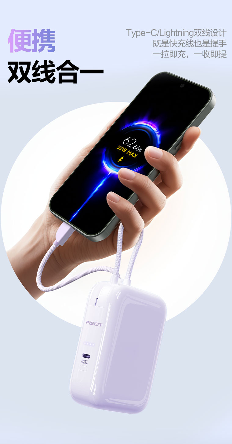 品胜 55W双自带线Mini便携充电宝10000毫安 自带Type-C/Lightning双线输出移动电源