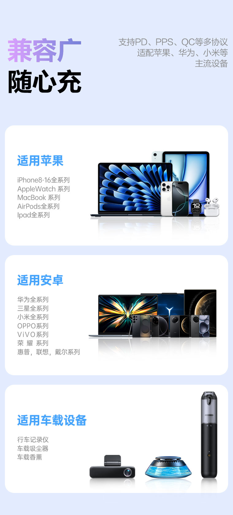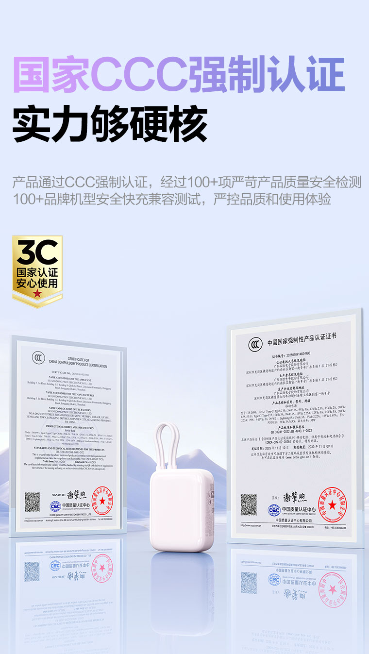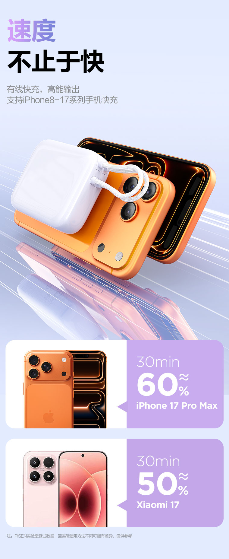 品胜 55W双自带线Mini便携充电宝10000毫安 自带Type-C/Lightning双线输出移动电源
