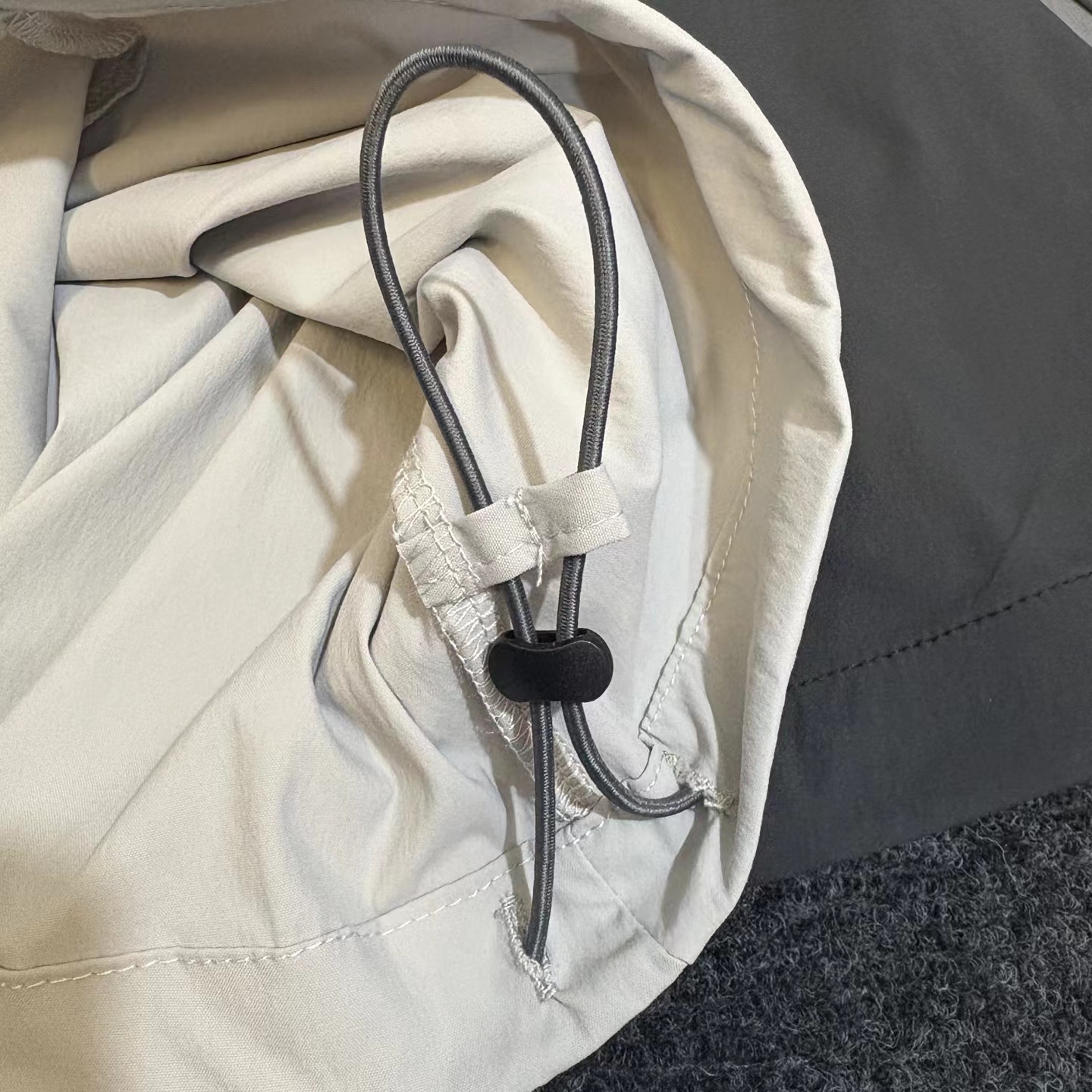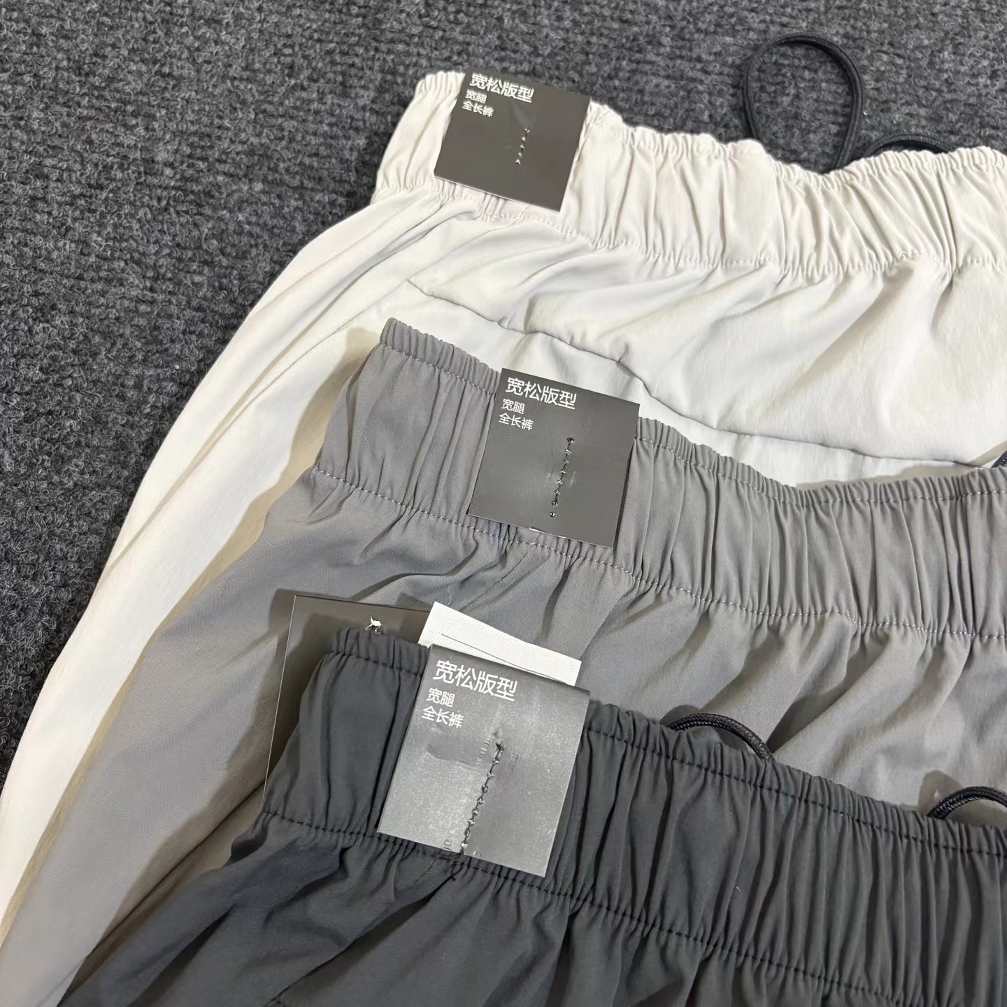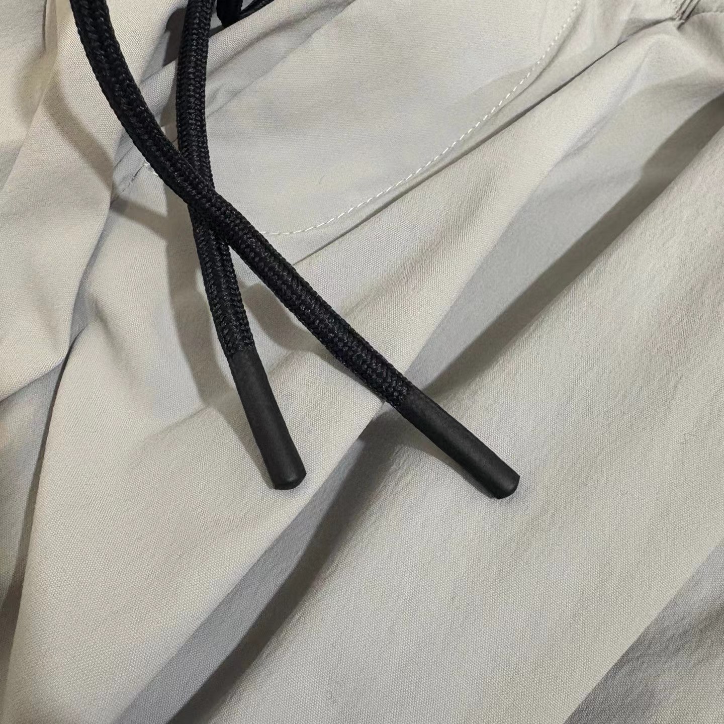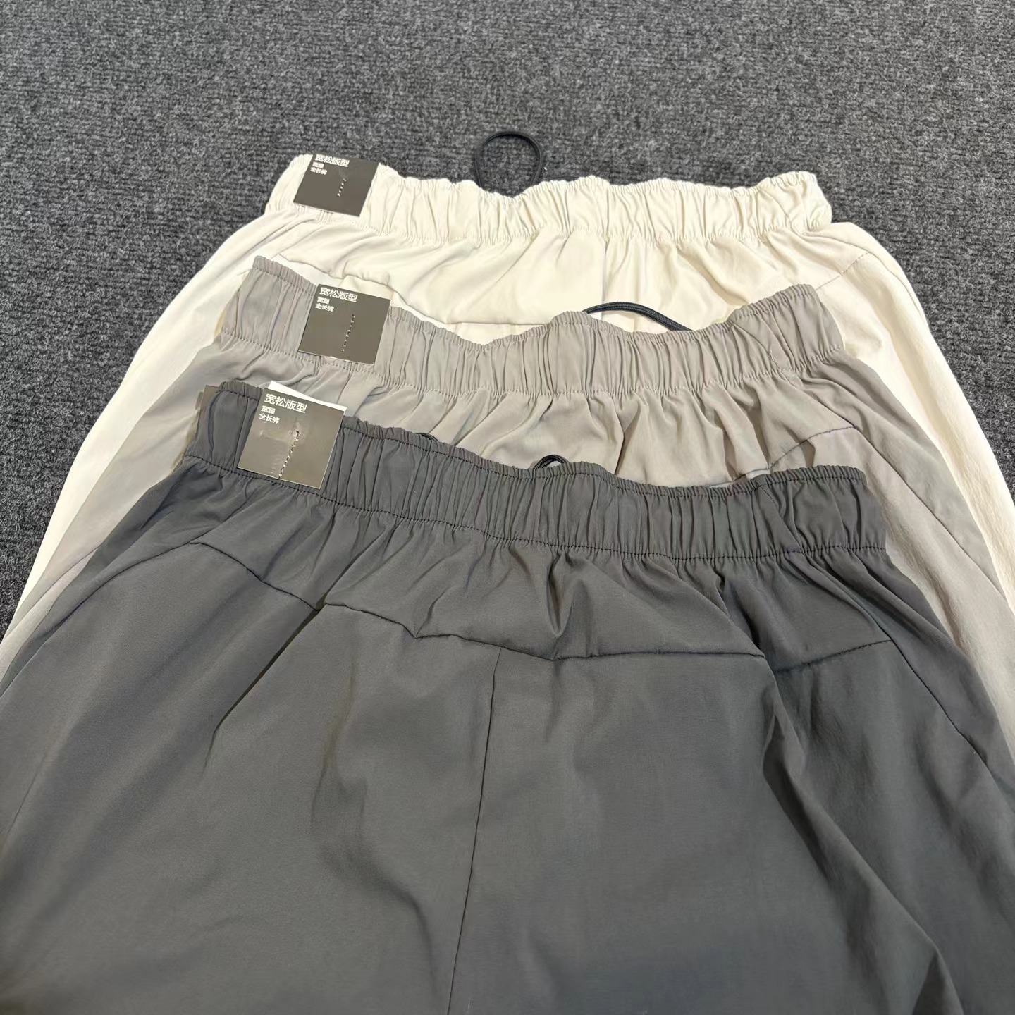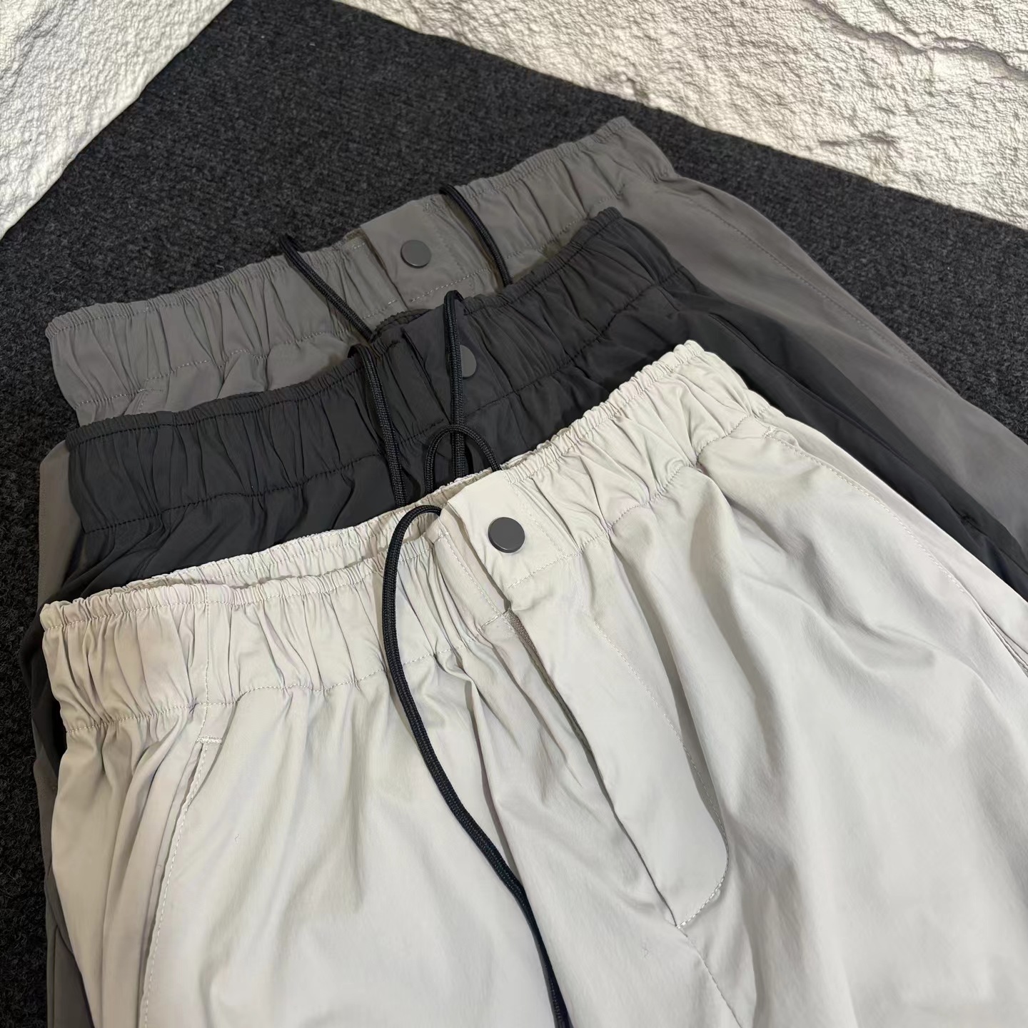 夏日轻薄机能防晒空调裤 97%再生锦纶 3%氨纶的防泼水工艺面料 (氨纶是很高档的面料造价不菲)上身巨好看百搭 g重145 夏天穿也不热还有型 、这款原版购入了三个色,它有一个很特别的点就是腰绳三色都是黑色,脚口松紧都是深灰色!枣结白色和灰色是深灰色 黑色是黑色