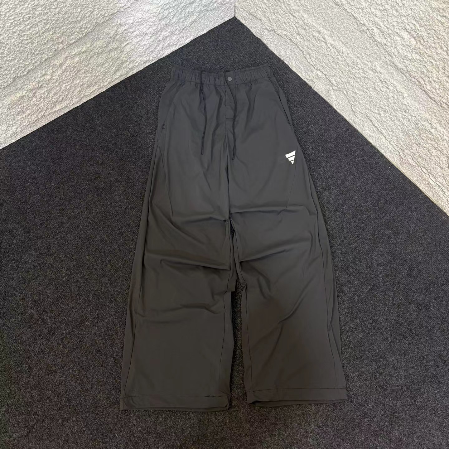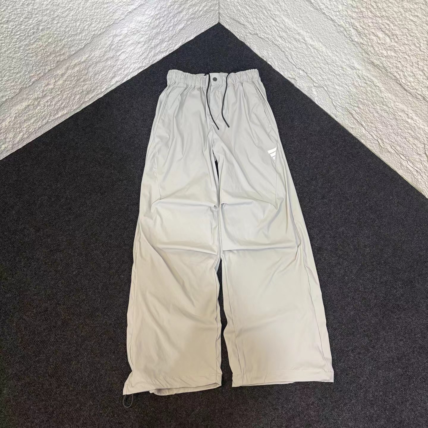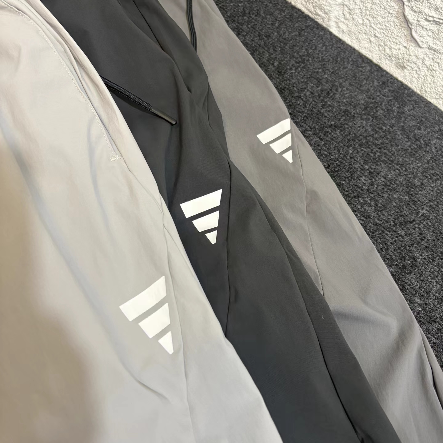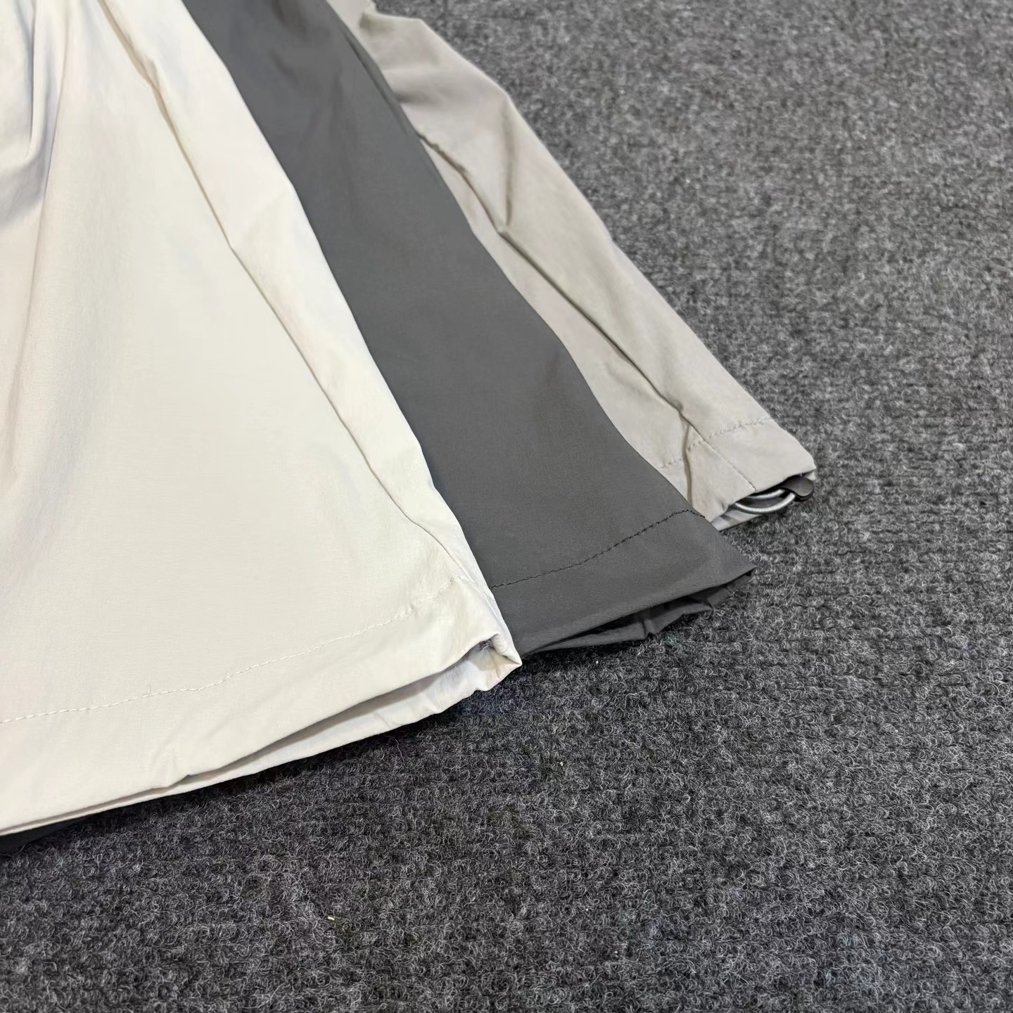 夏日轻薄机能防晒空调裤 97%再生锦纶 3%氨纶的防泼水工艺面料 (氨纶是很高档的面料造价不菲)上身巨好看百搭 g重145 夏天穿也不热还有型 、这款原版购入了三个色,它有一个很特别的点就是腰绳三色都是黑色,脚口松紧都是深灰色!枣结白色和灰色是深灰色 黑色是黑色