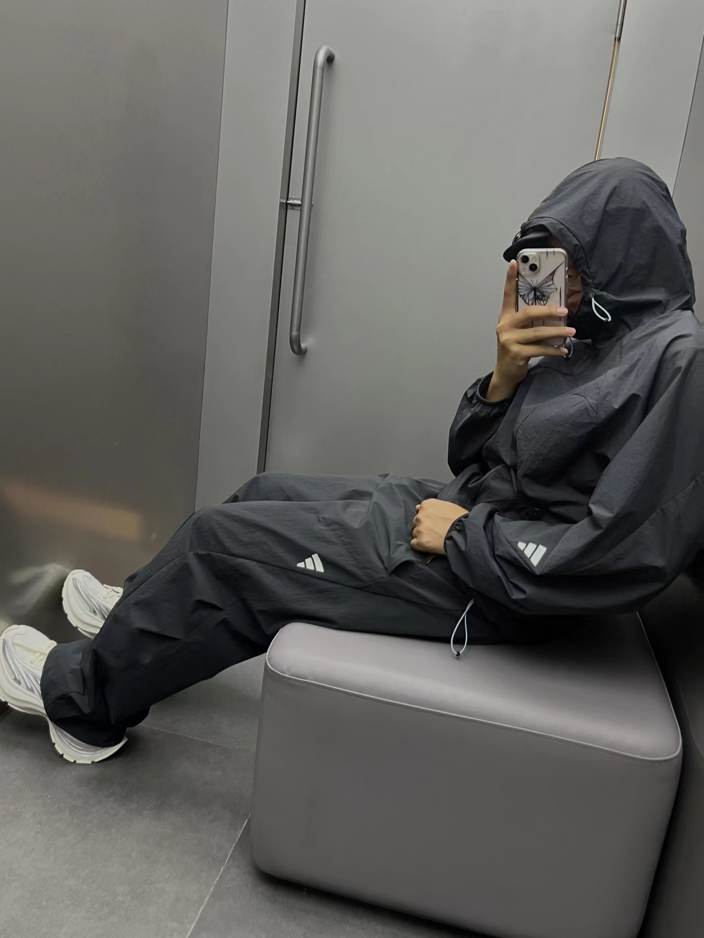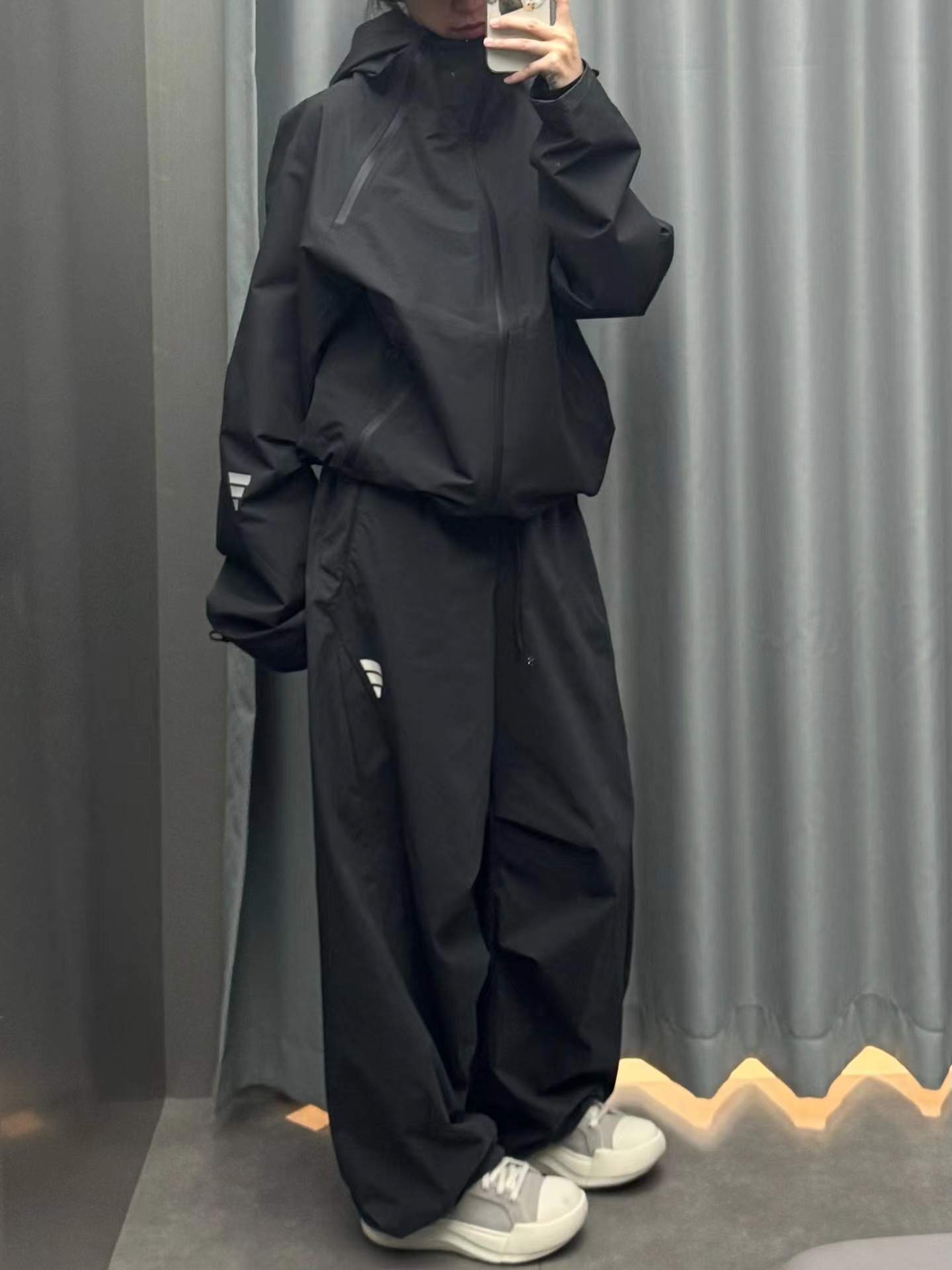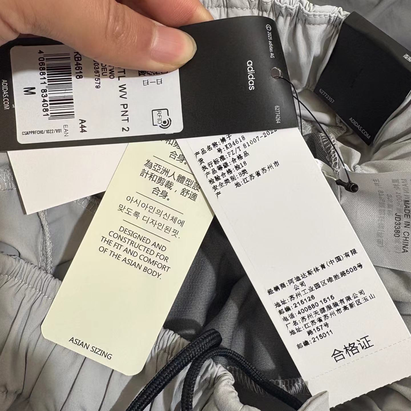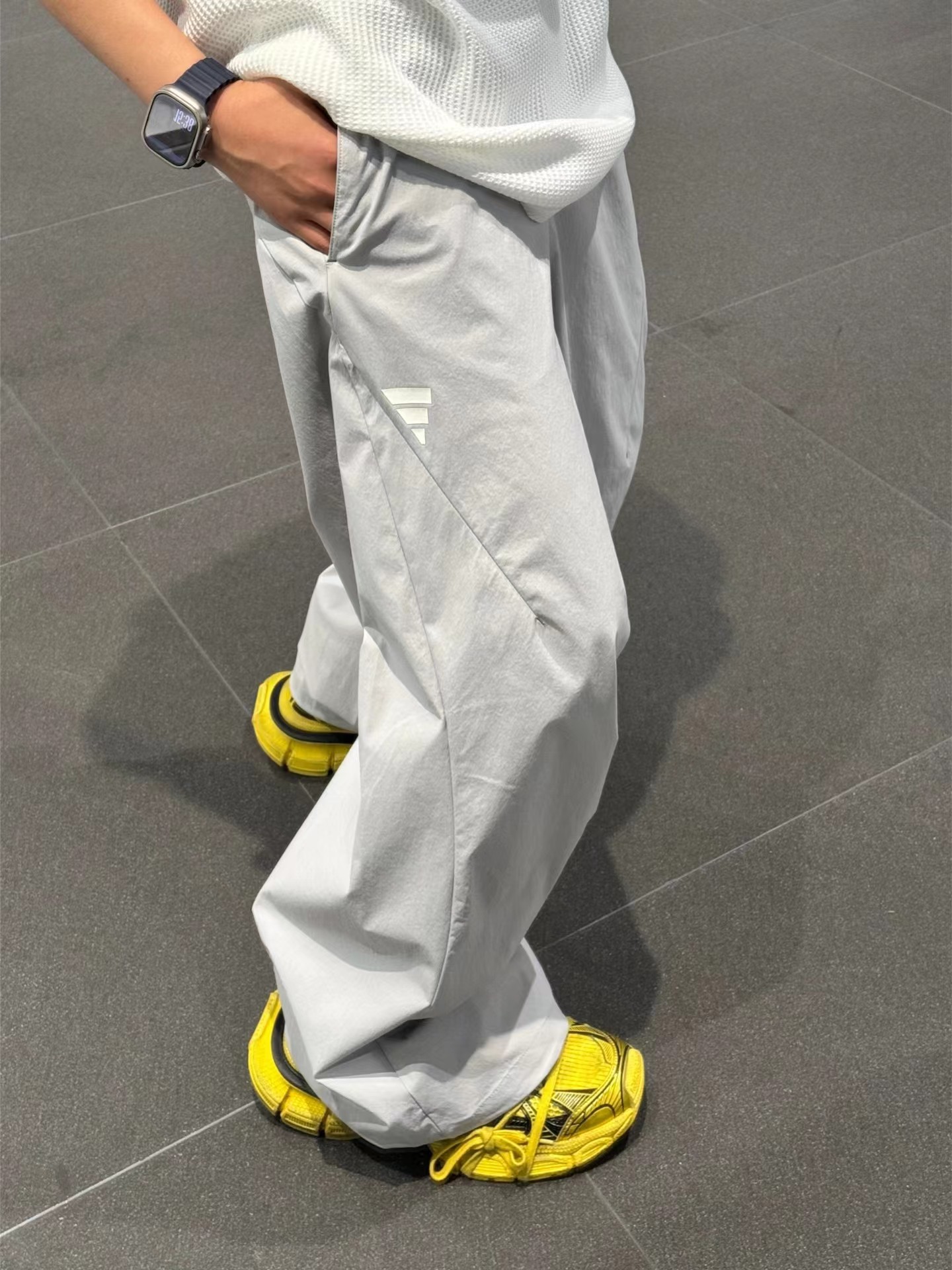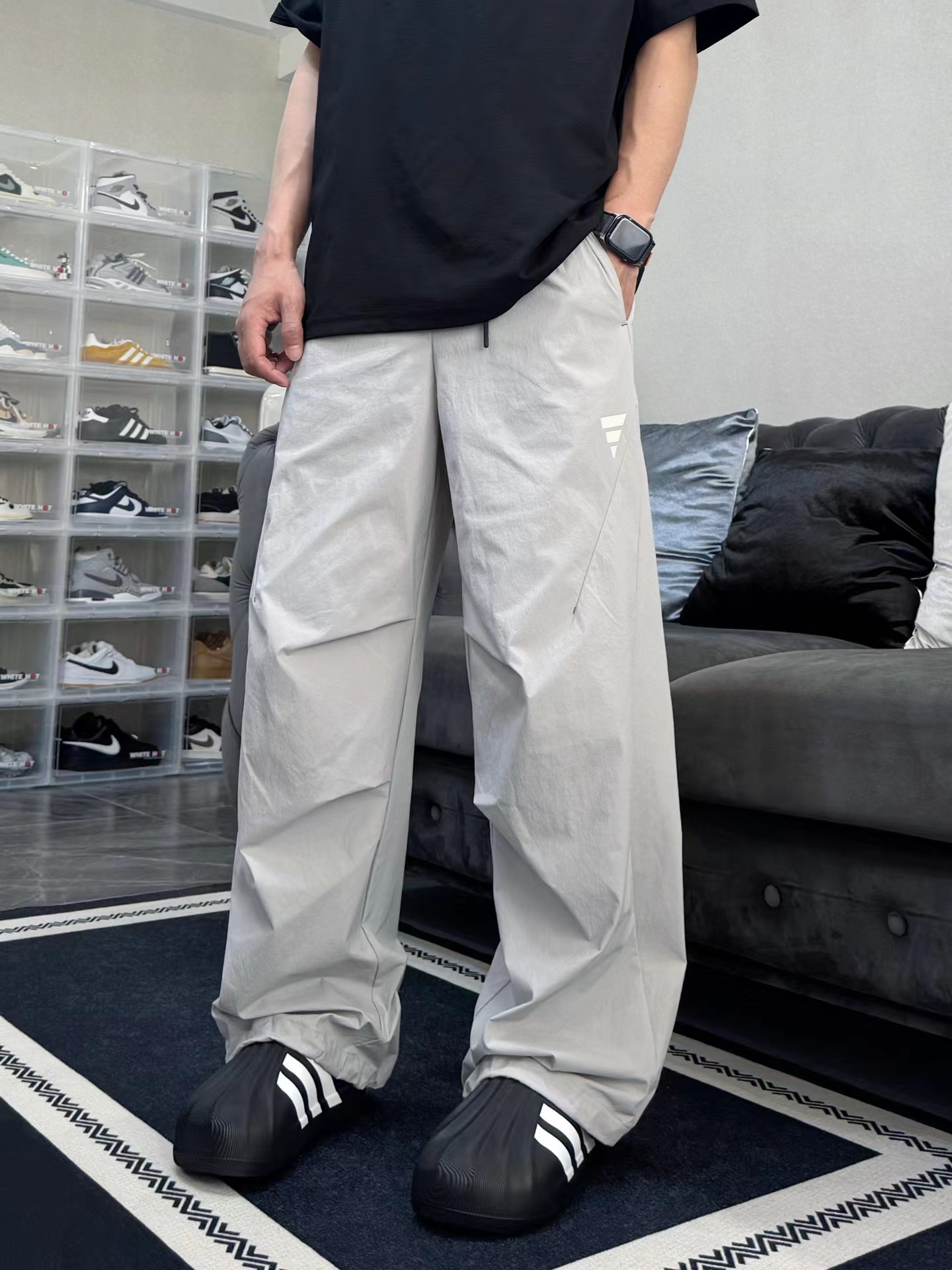 夏日轻薄机能防晒空调裤 97%再生锦纶 3%氨纶的防泼水工艺面料 (氨纶是很高档的面料造价不菲)上身巨好看百搭 g重145 夏天穿也不热还有型 、这款原版购入了三个色,它有一个很特别的点就是腰绳三色都是黑色,脚口松紧都是深灰色!枣结白色和灰色是深灰色 黑色是黑色