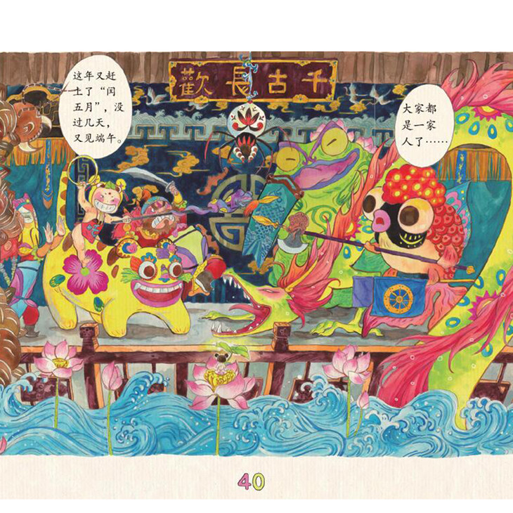 2、全彩手绘,富有传统中国风味的民俗童画。作者用画绘本的手法做多格漫画,水墨画一样的晕染结合了年画一样的浓烈色彩,绚烂又别致。
