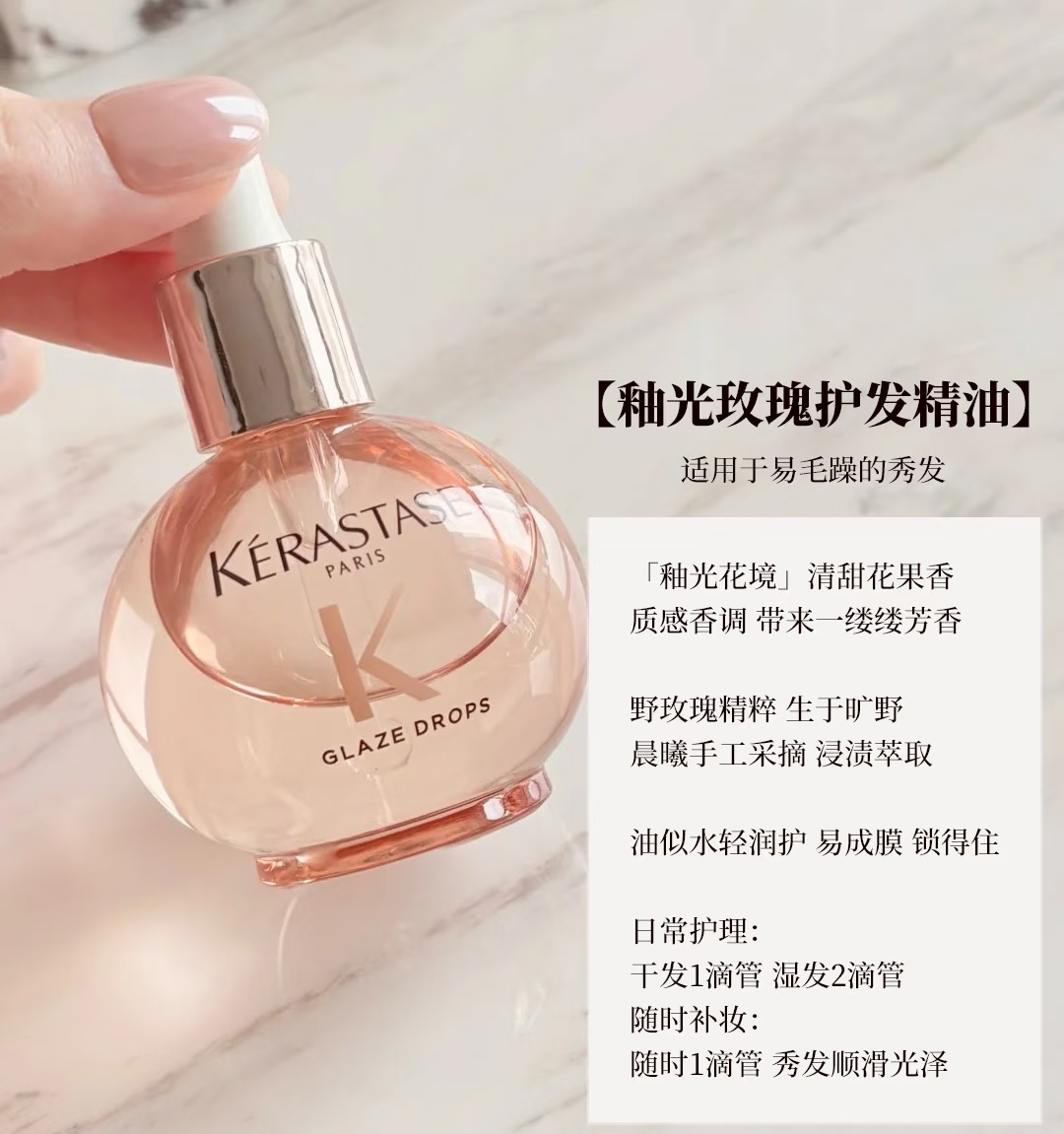 用法:干发 1 滴管 / 湿发 2 滴管,随时补涂 1 滴管,发丝变顺滑有光泽。