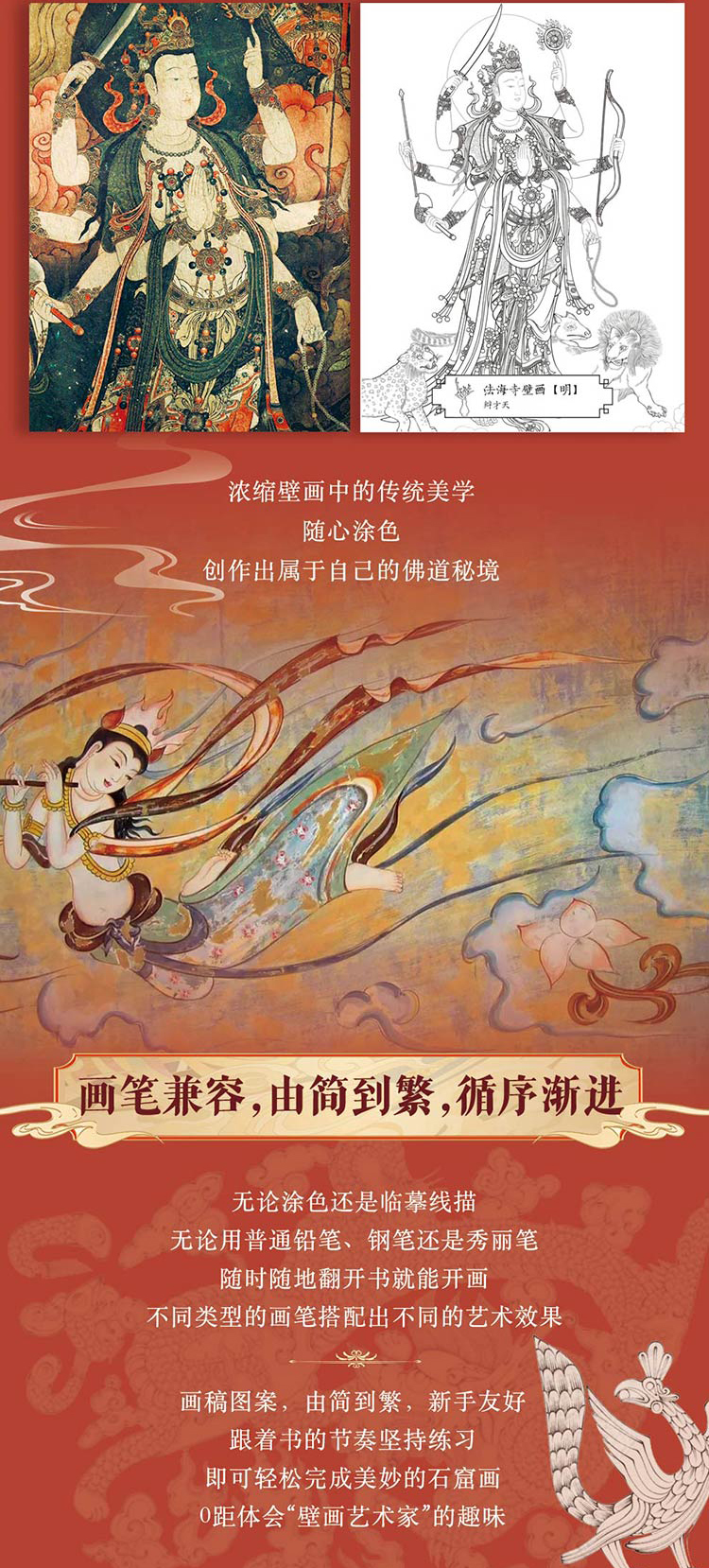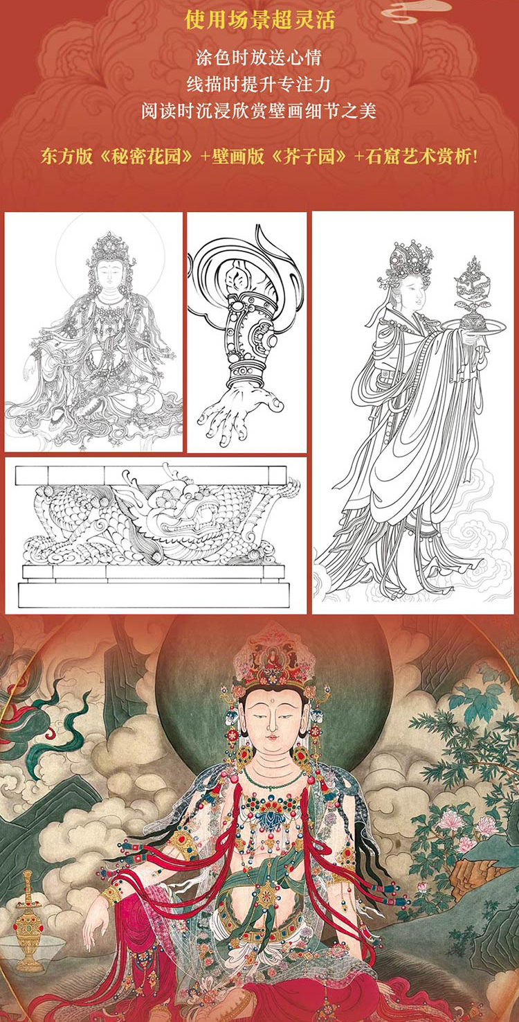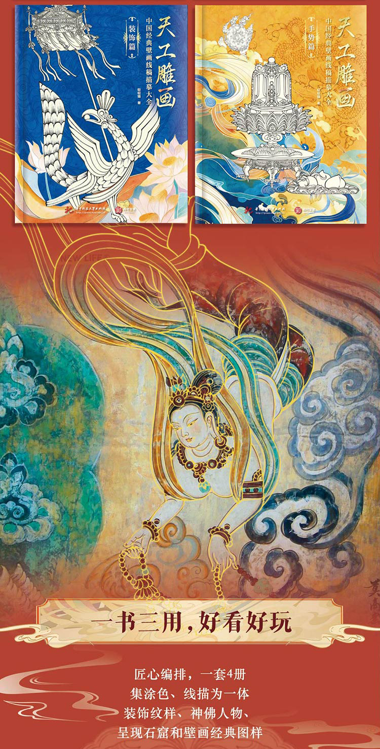 《天工雕画》(全4册) | 能描线涂色的石窟壁画书!一书三用,能玩能看,更懂东方审美的佛系减压书!赠檀香型描金笔+10支笔芯