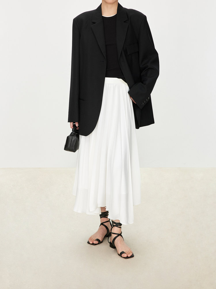 立裁A字裙型一件,隐匿下半身不足,整体裙型采用高定立裁的剪裁方式,既能展现褶皱流动的美,亦能呈现贴合身材的轮廓。