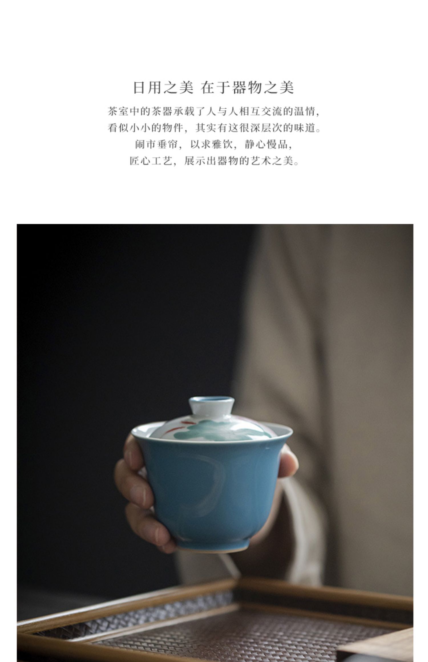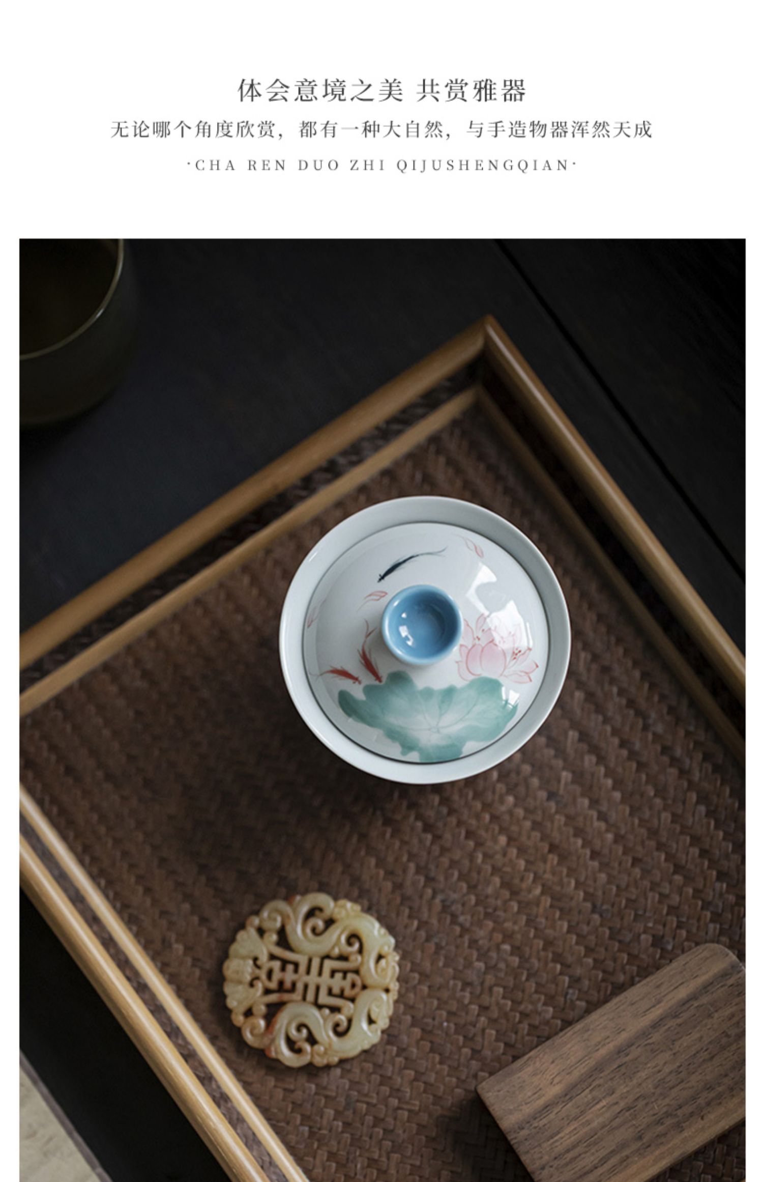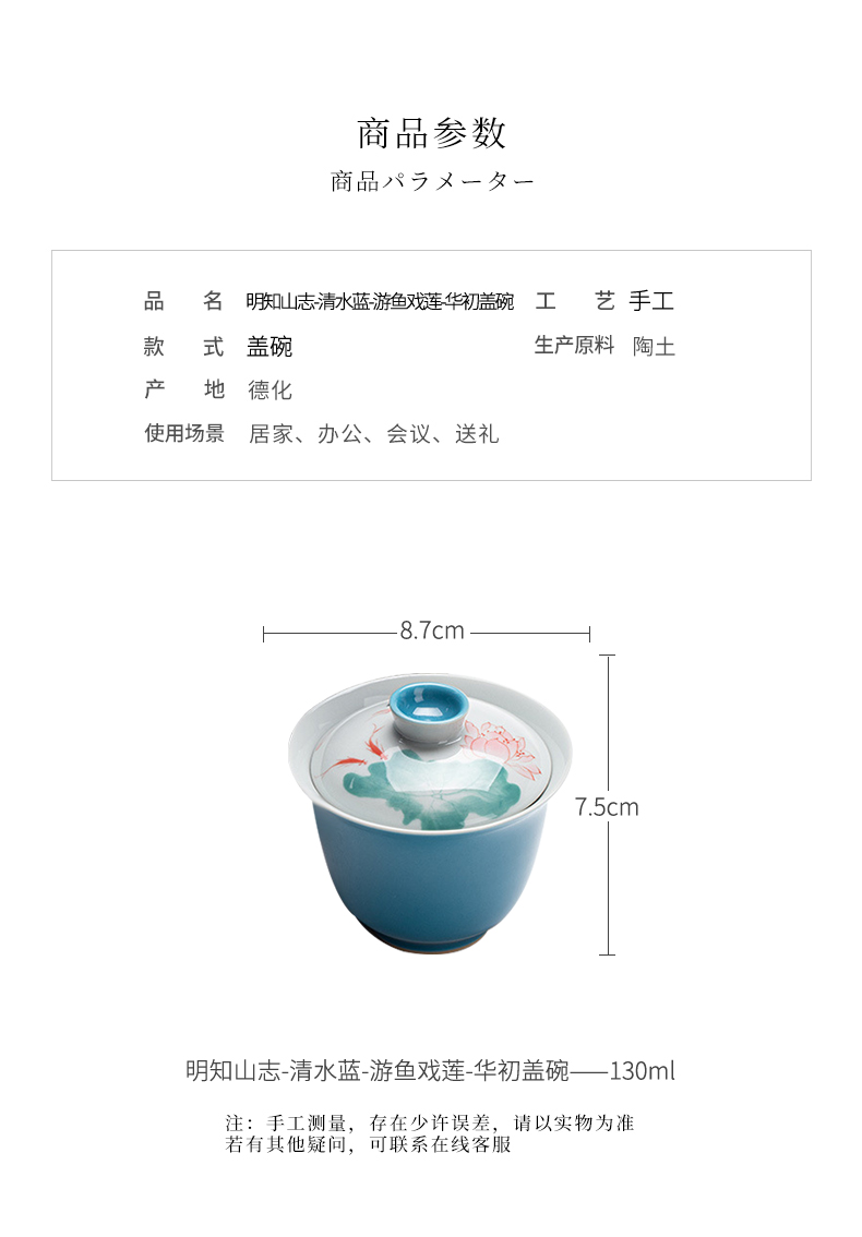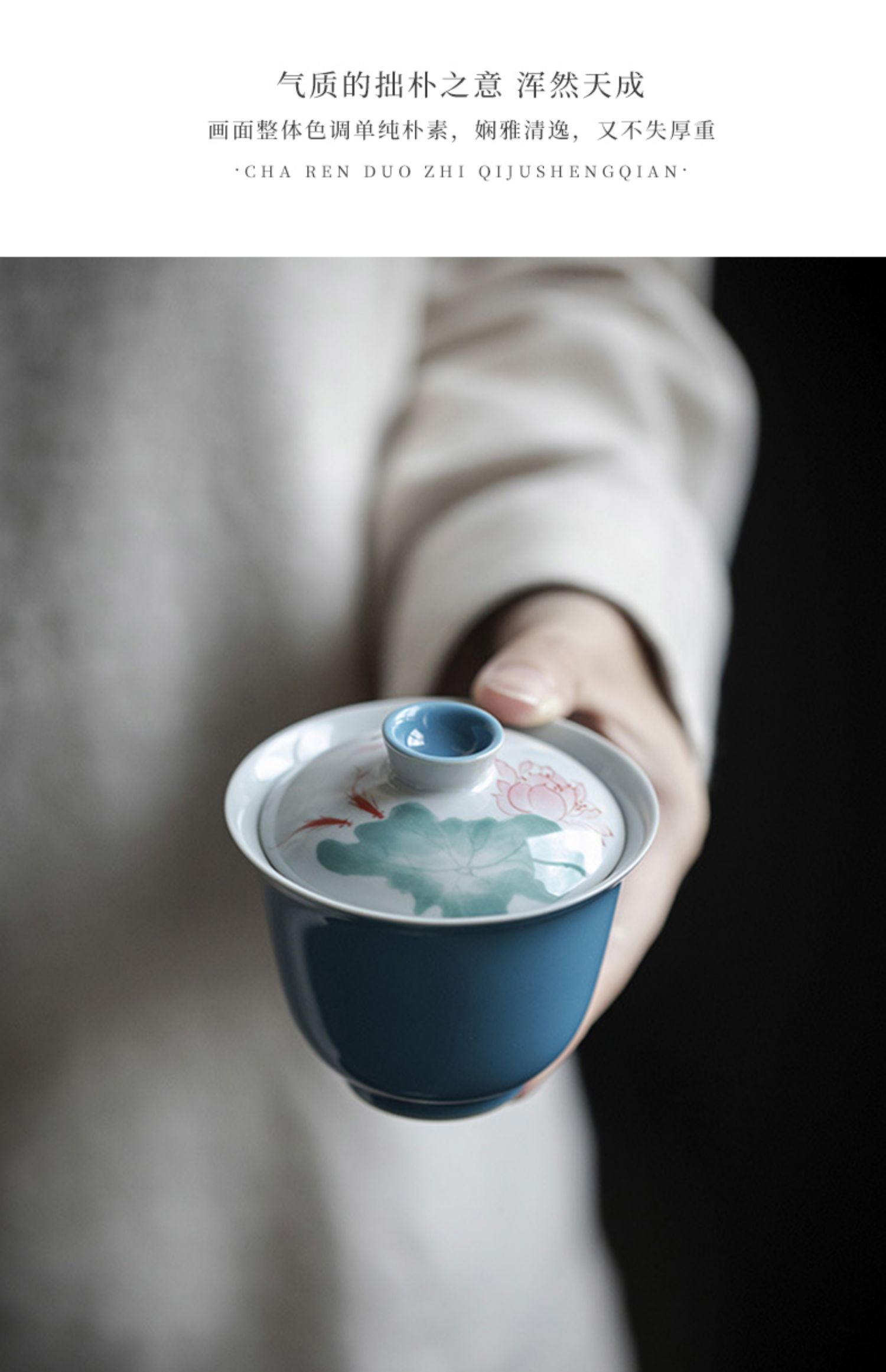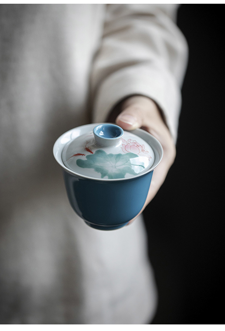 永利汇手绘游鱼盖碗清水蓝色陶瓷茶碗 莲花元素文人器泡茶碗