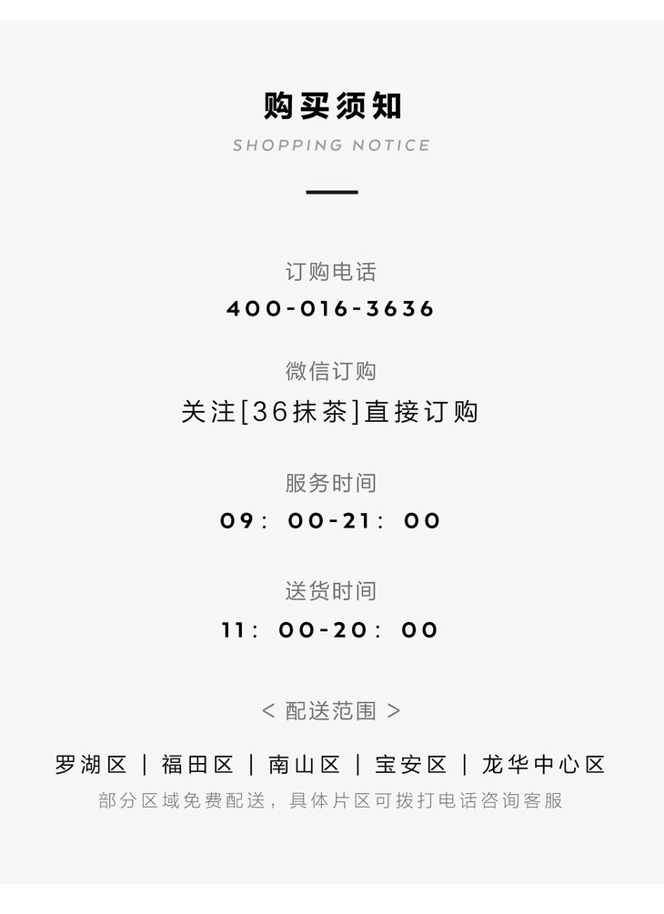我们目前拥有36MATCHART和36cake两个品牌,主营抹茶甜品与新鲜蛋糕,深受数百万抹茶控和甜品控的拥趸。好吃安心,奶油只选法国铁塔。全城3小时免 费速达。客服热线400-016-3636