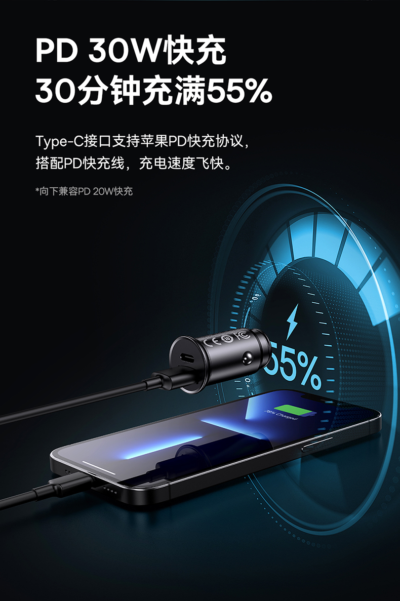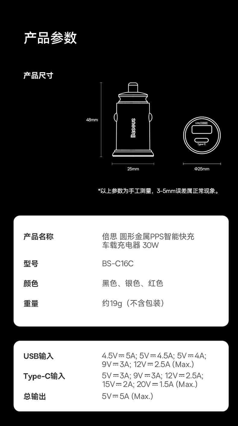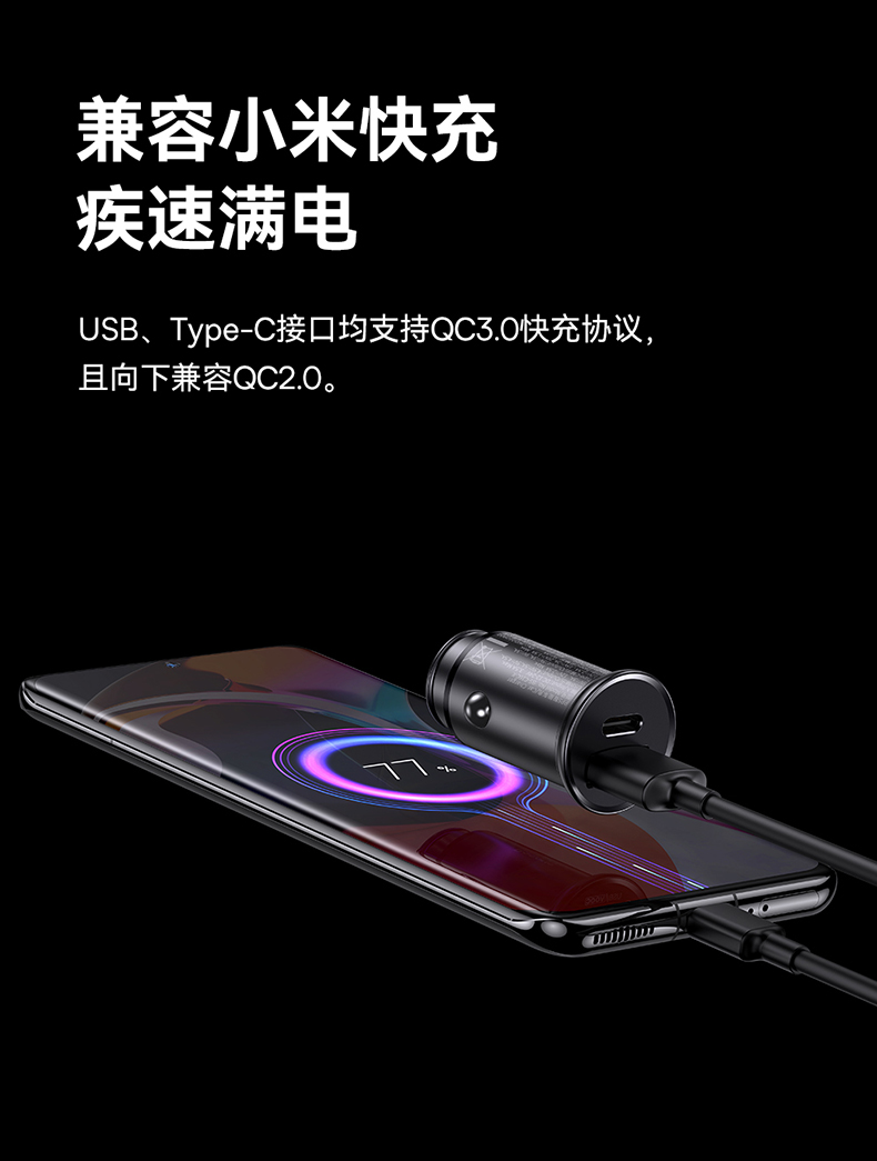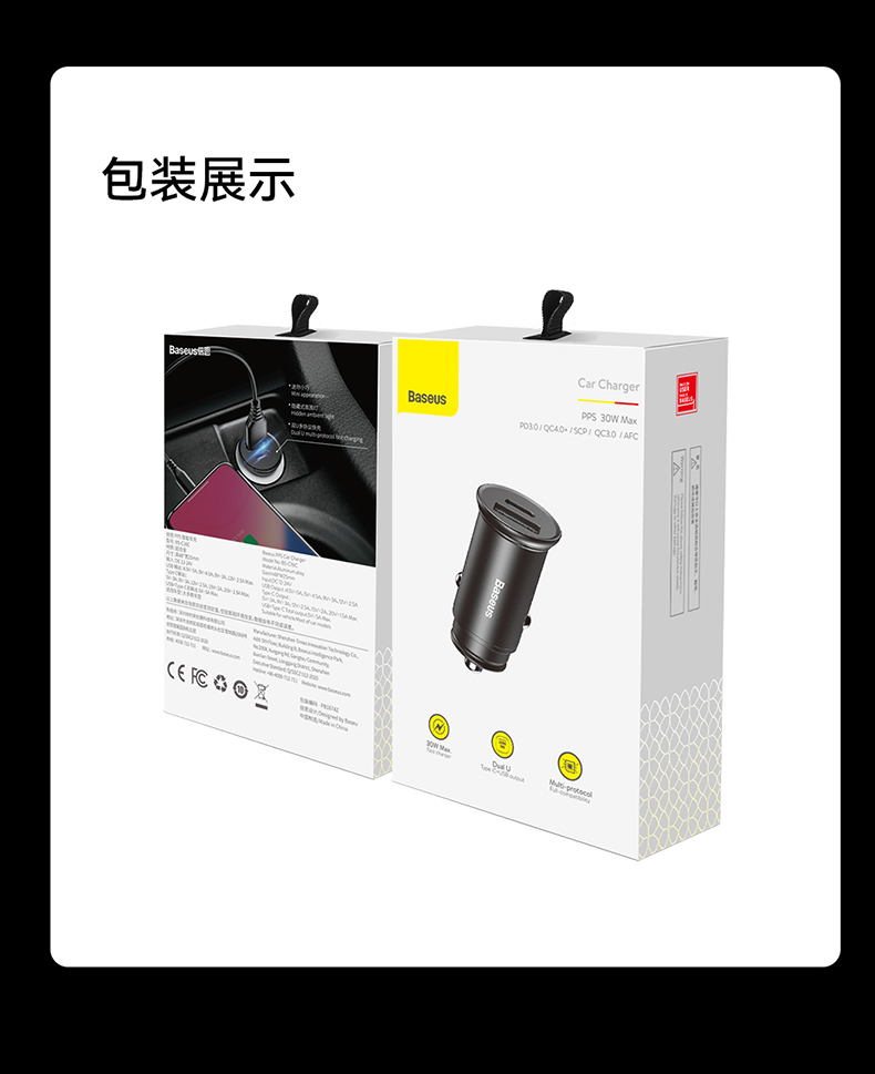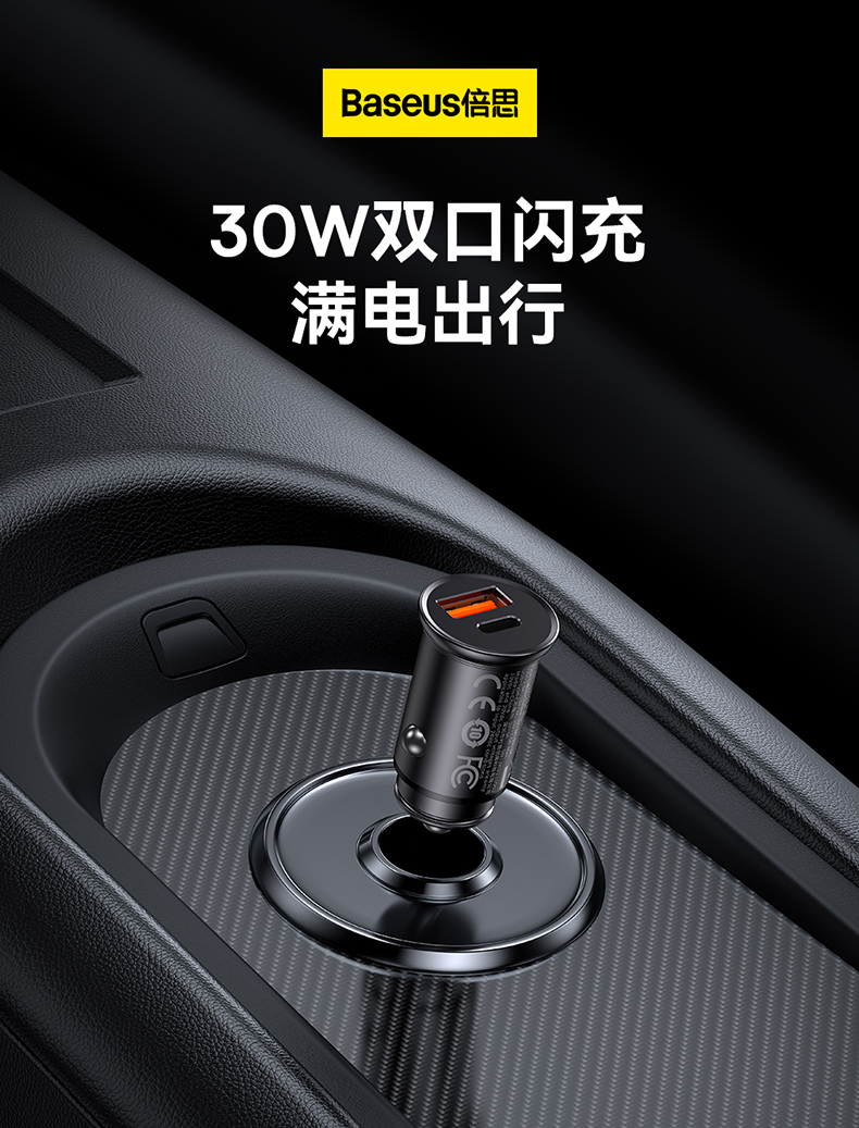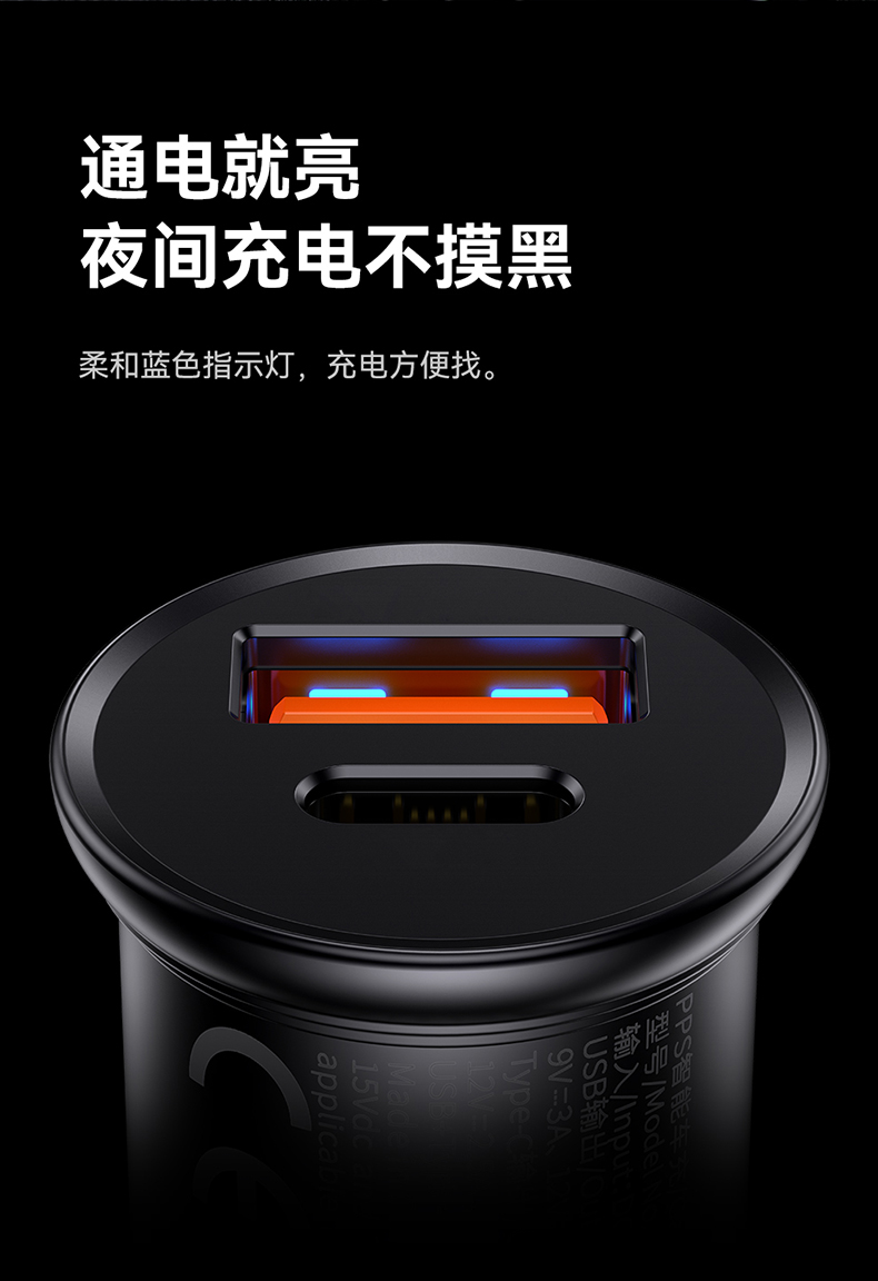 倍思 圆形金属 A+C 30W PPS版 智能快充 车载充电器(支持PD3.0、QC4.0+SCP、AFC)