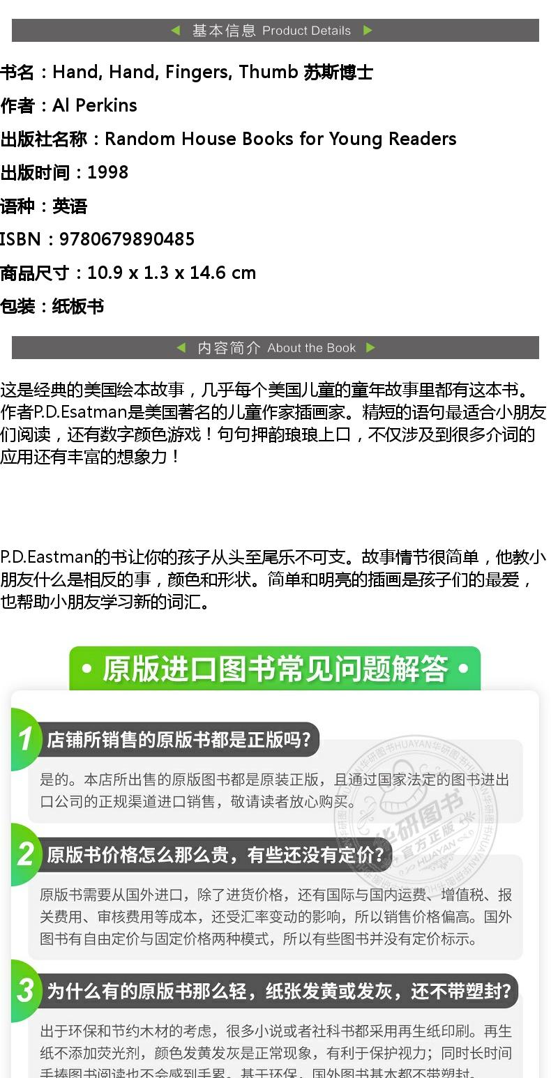 英文原版 Hand, Hand, Fingers, Thumb 儿童认知纸板书 Dr. Seuss苏斯博士 幼儿基础感官 英文版 进口英语书籍