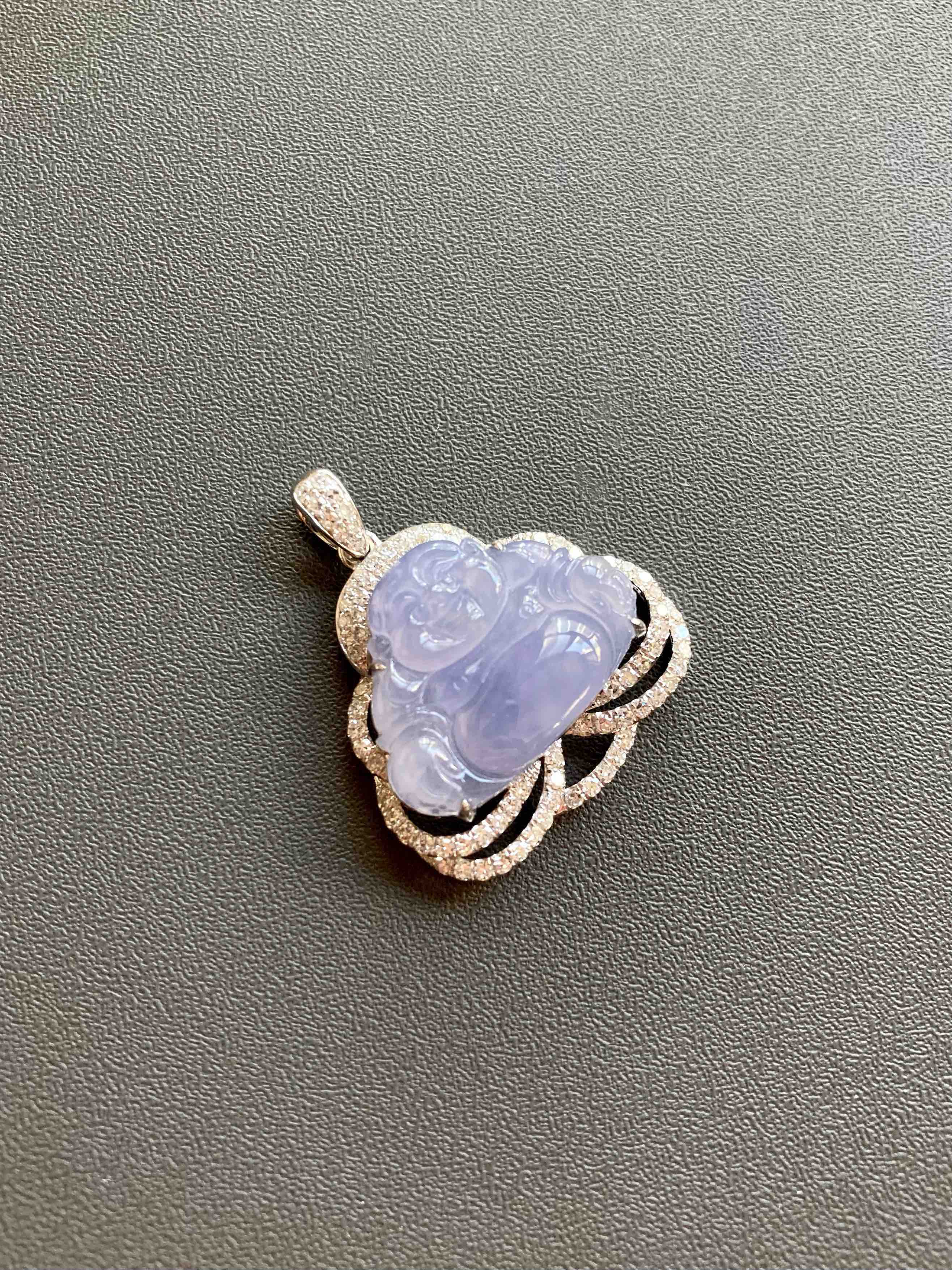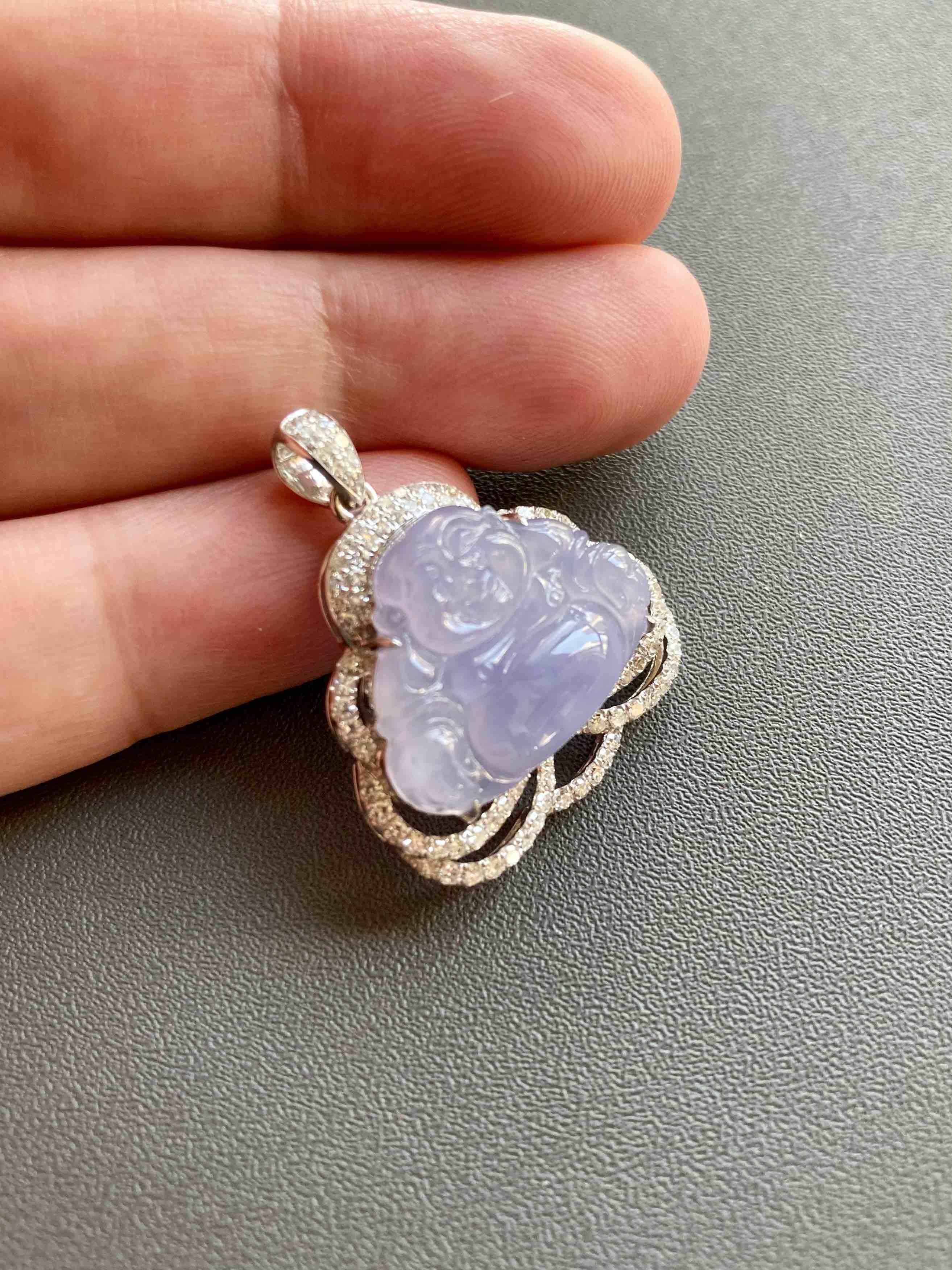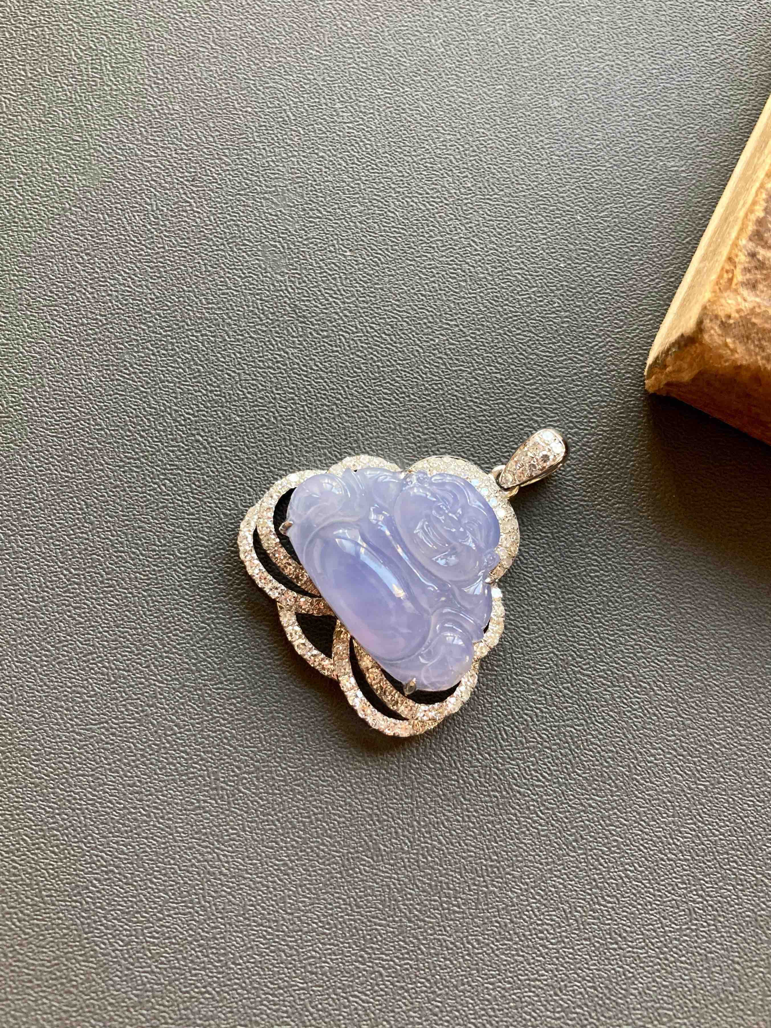 梦幻冰种紫罗兰佛公,保平安之物,玩紫罗兰都知道十春九木,网上那些PS出来的仙图实物能气晕你,这又冰又紫的可就太难得了,种水晶莹剔透,透光果冻般细腻柔滑,纯天然,自然光手机拍,实物就这么紫这么美,好物要用好镶嵌,18k白金钻石镶嵌,收藏级的好东西。佛19.6×14.8×3.8mm,镶嵌后27.9×23.1×7.3mm