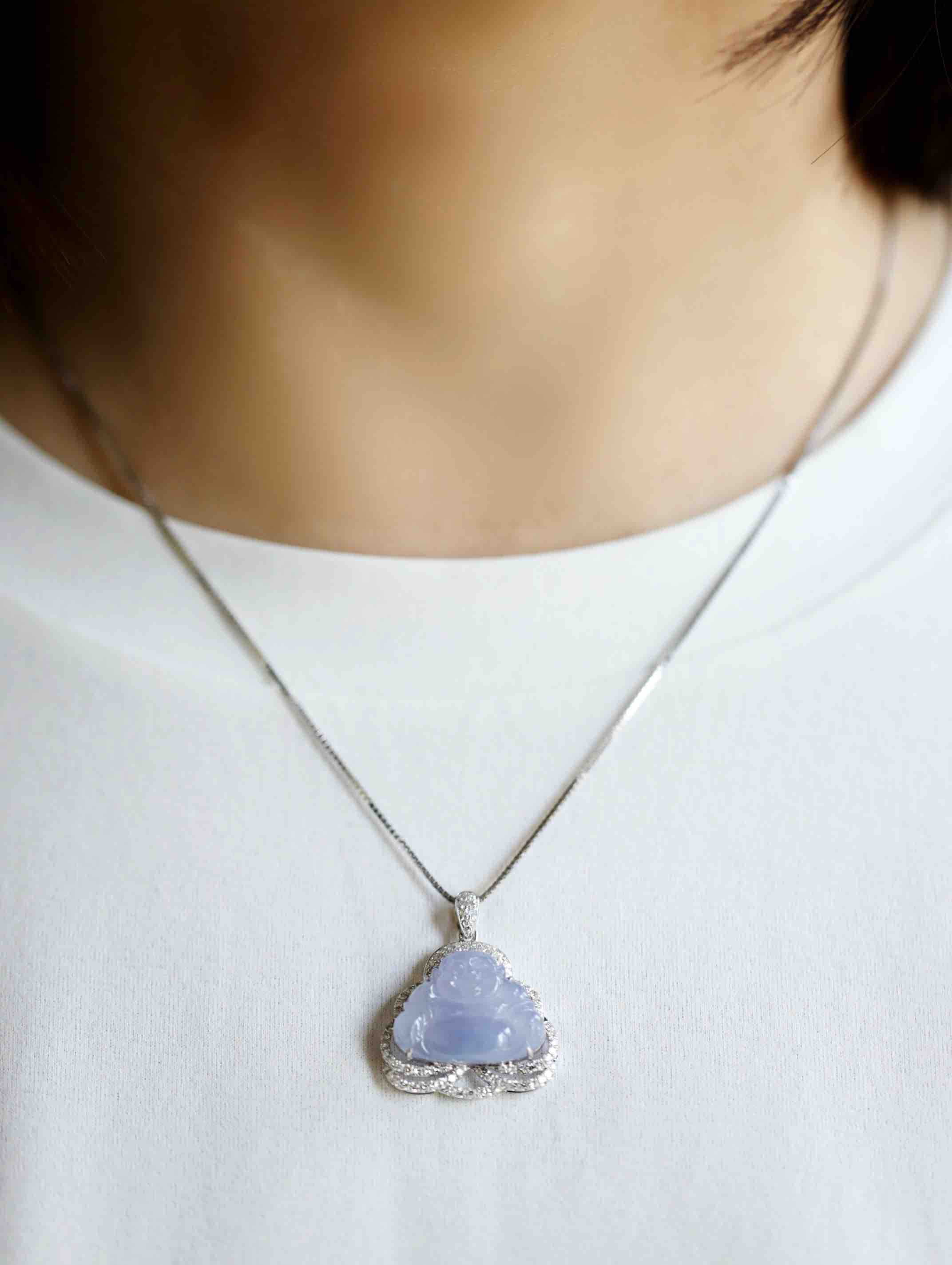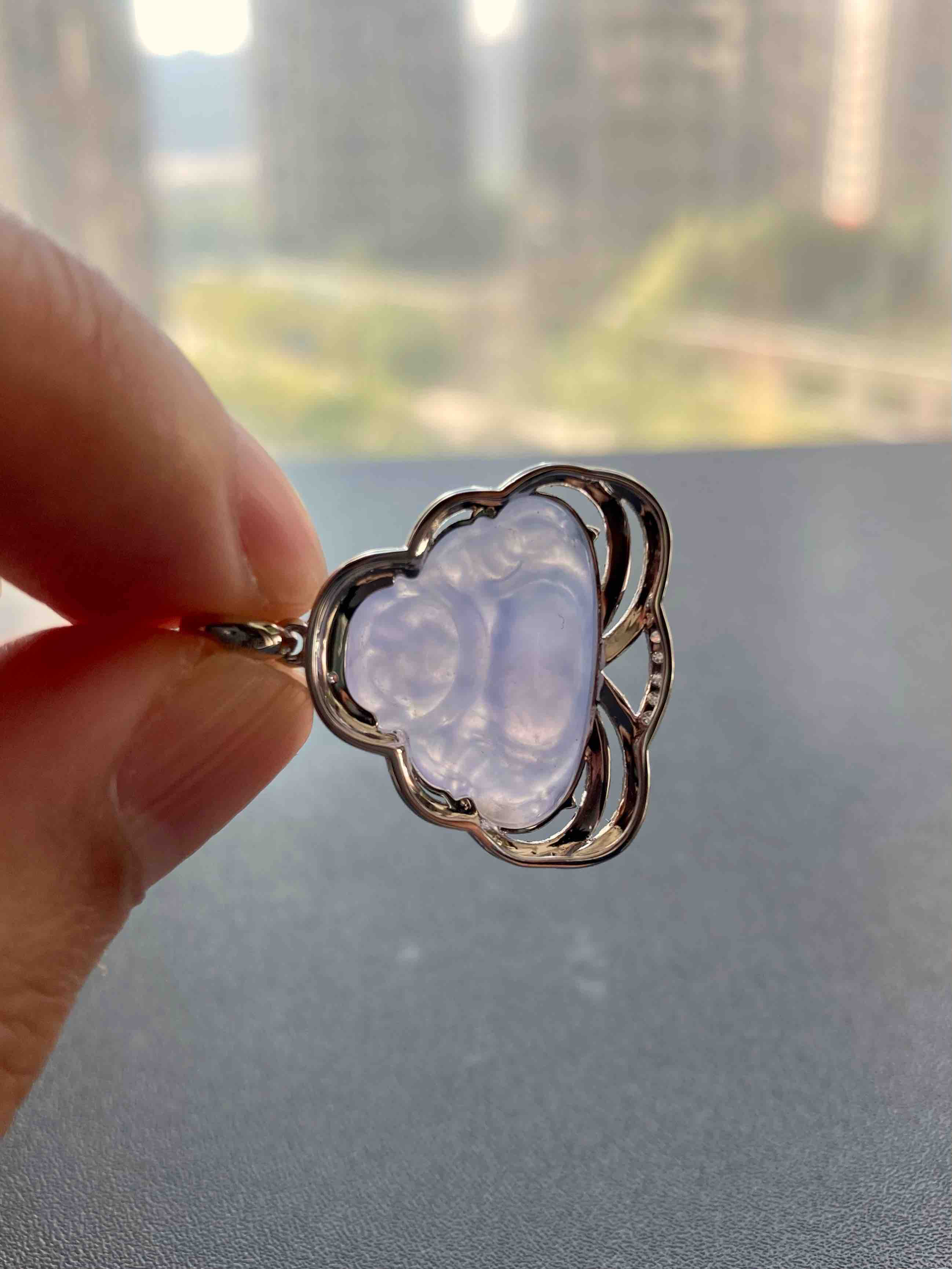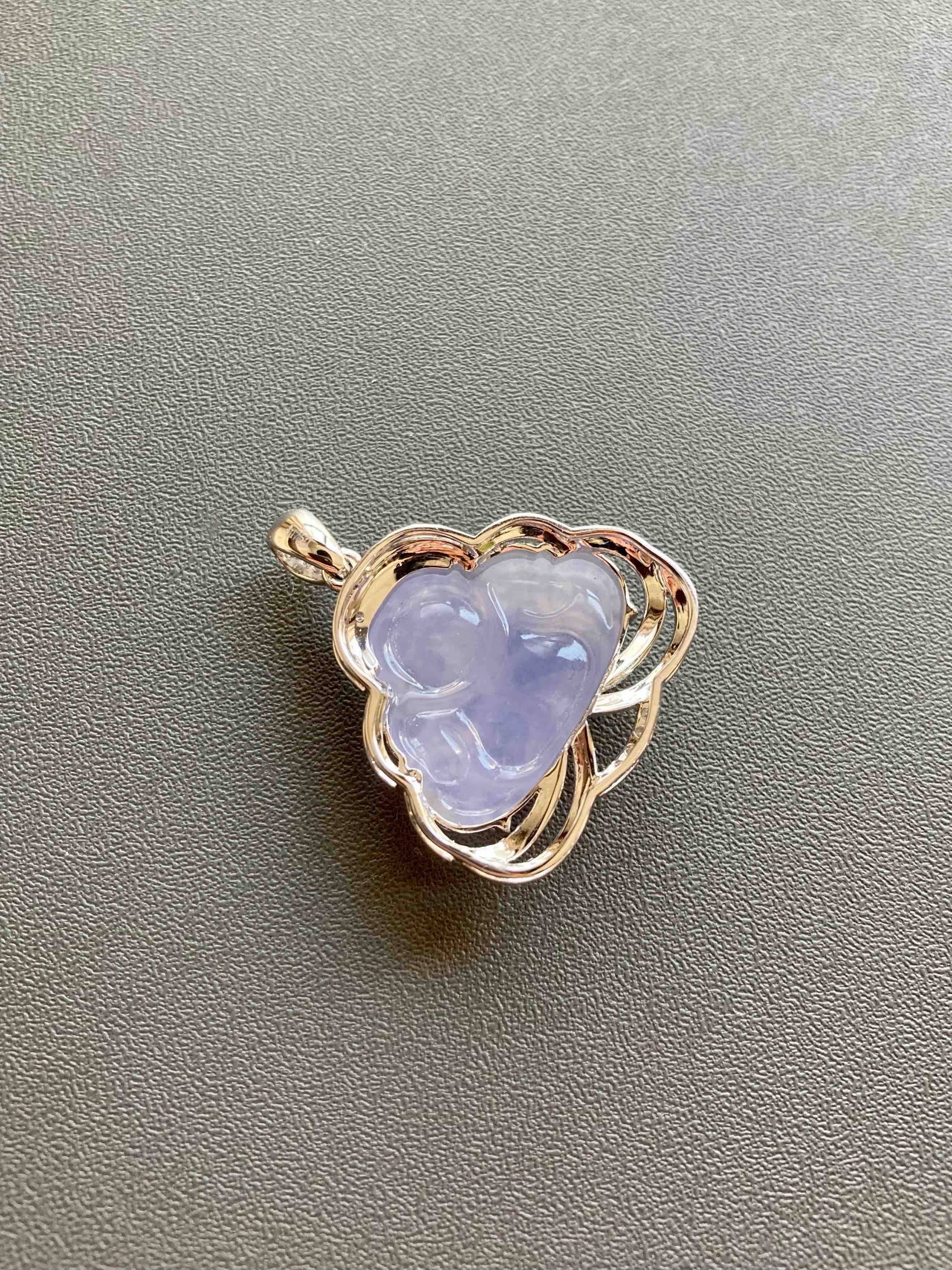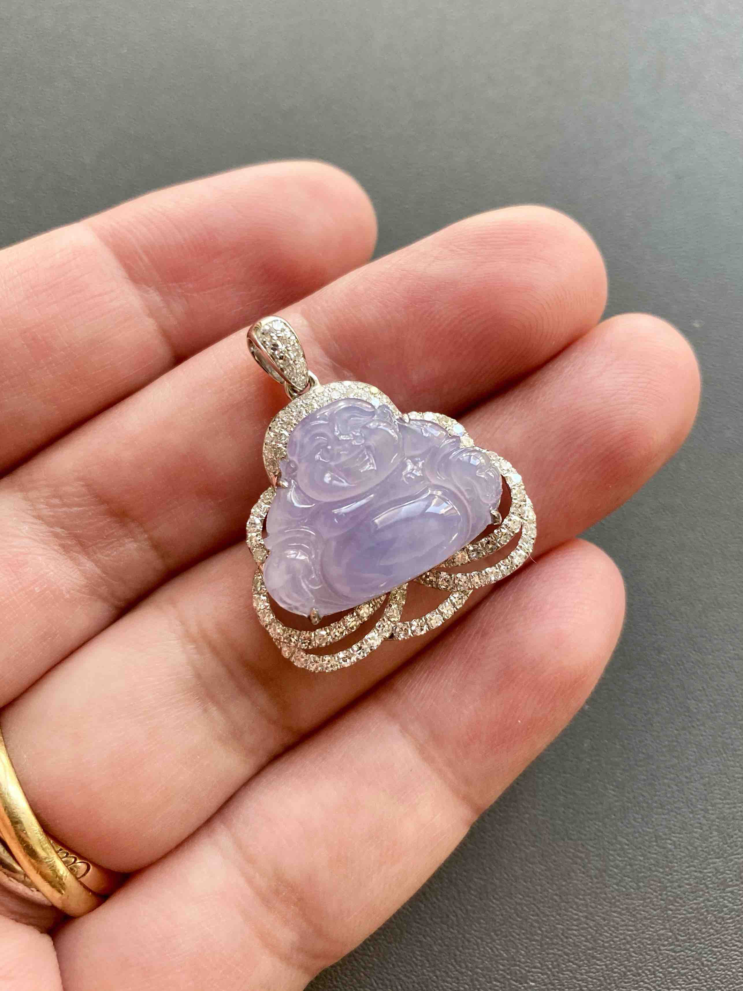 梦幻冰种紫罗兰佛公,保平安之物,玩紫罗兰都知道十春九木,网上那些PS出来的仙图实物能气晕你,这又冰又紫的可就太难得了,种水晶莹剔透,透光果冻般细腻柔滑,纯天然,自然光手机拍,实物就这么紫这么美,好物要用好镶嵌,18k白金钻石镶嵌,收藏级的好东西。佛19.6×14.8×3.8mm,镶嵌后27.9×23.1×7.3mm