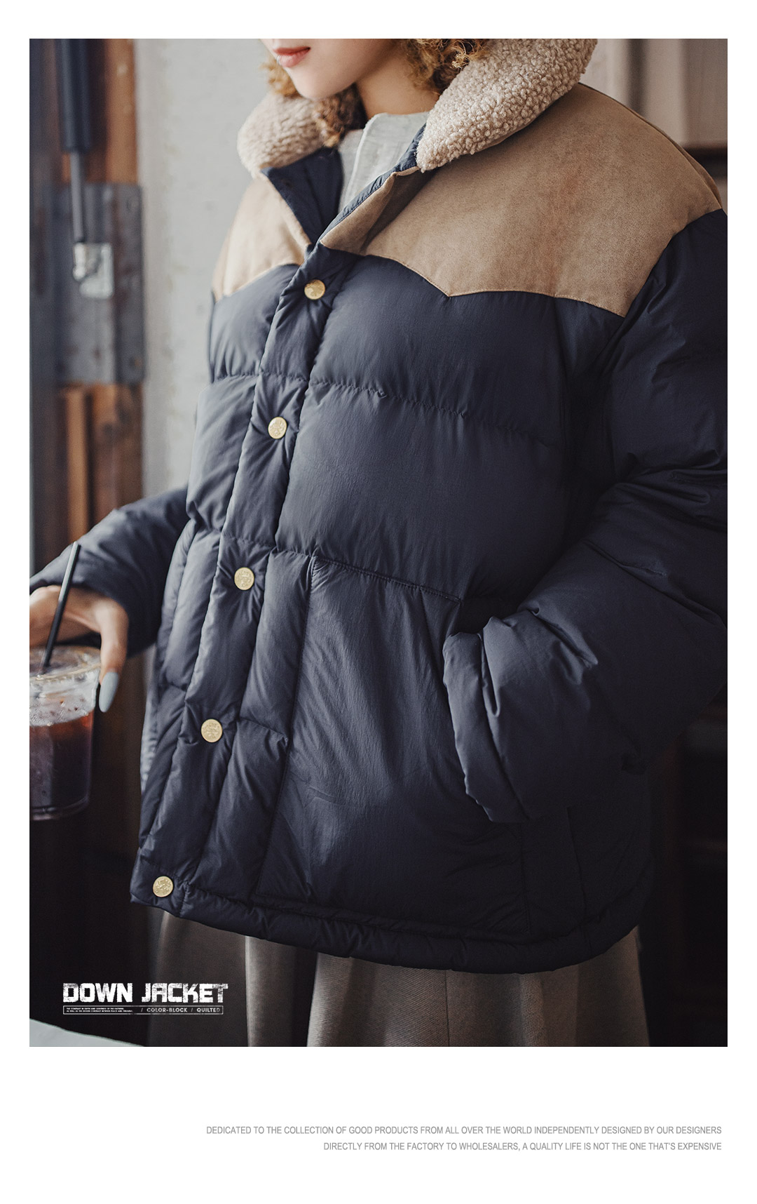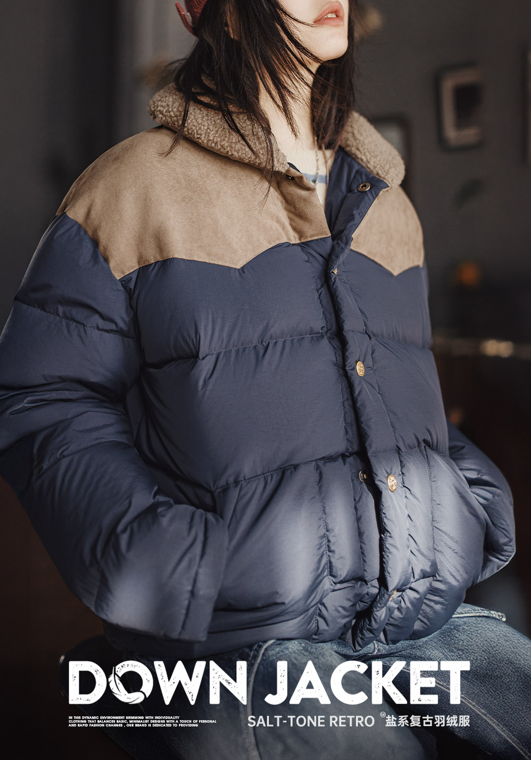 马登90白鸭绒撞色麂皮拼接翻领加厚保暖工装羽绒服夹克外套女冬季