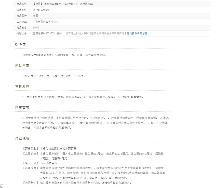 南国 复合维生素B片 100片 B族维生素缺乏营养不良厌食脚气并糙皮