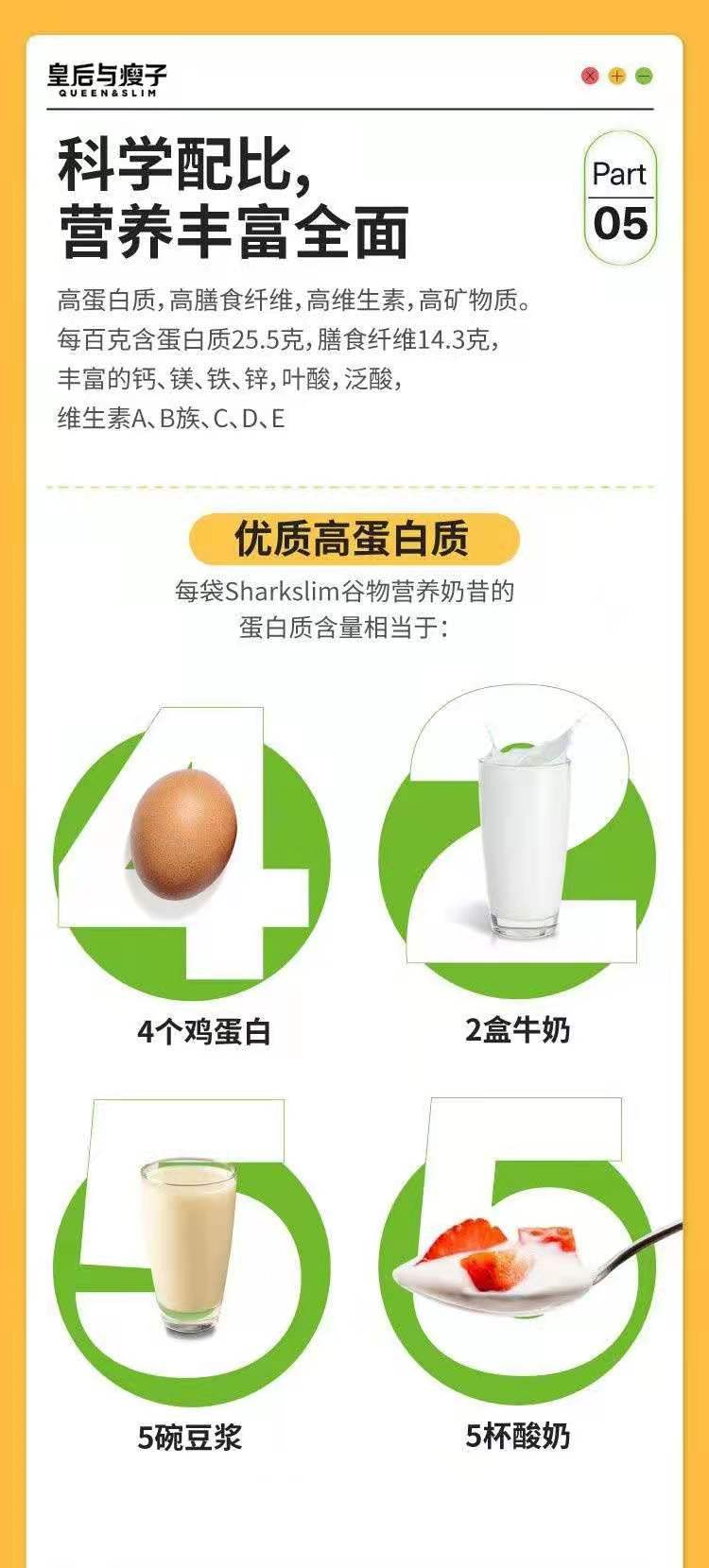 营养全面,配比科学:奶昔口感,好吃不腻,营养堪比大餐。高蛋白,高膳食纤维,高维生素,高矿物质,低热量,低脂,低钠,低GI