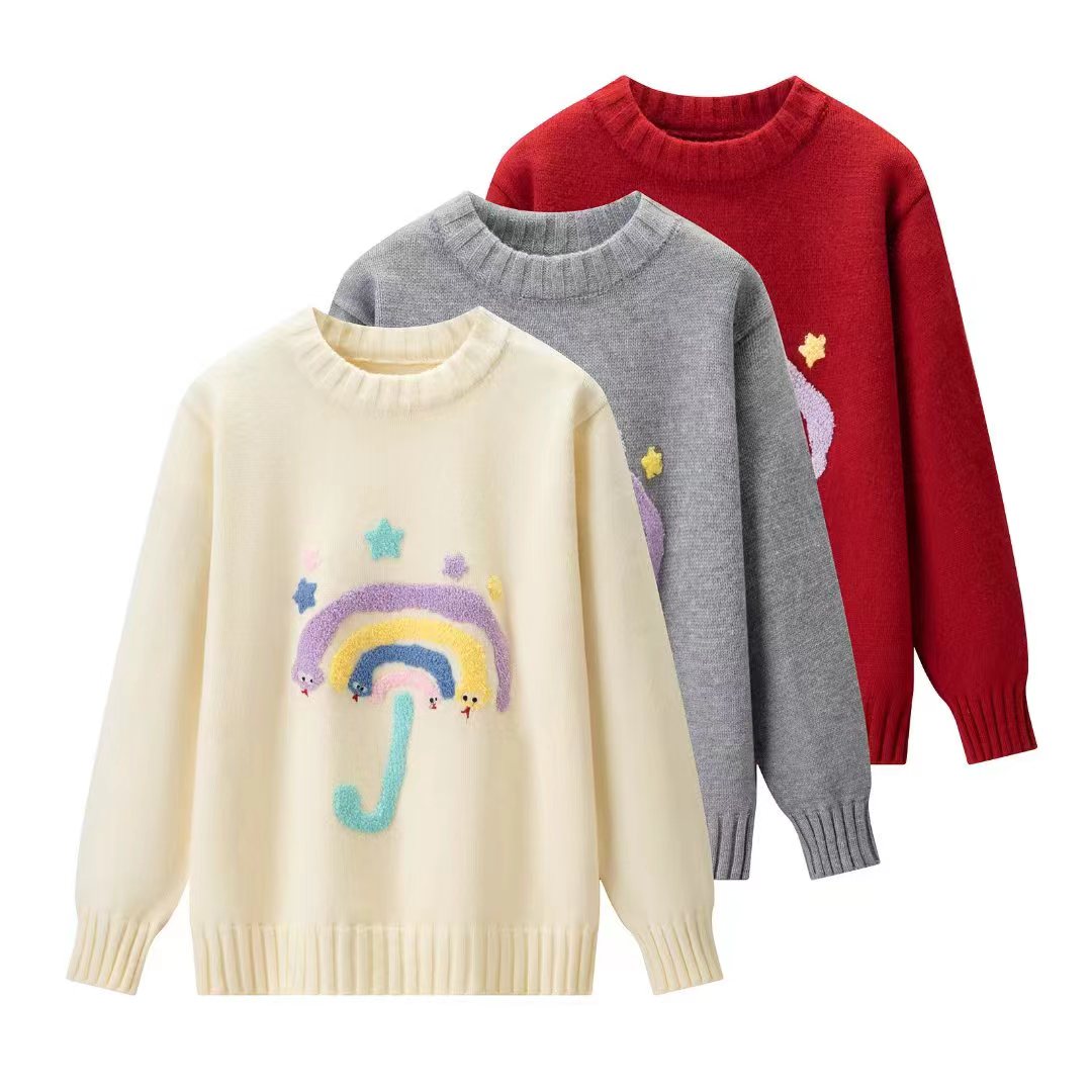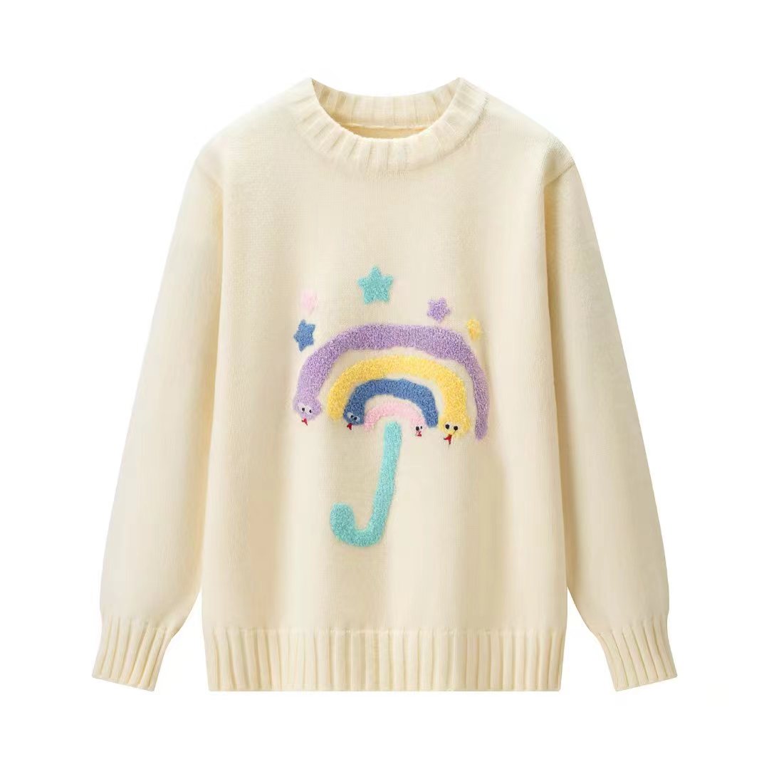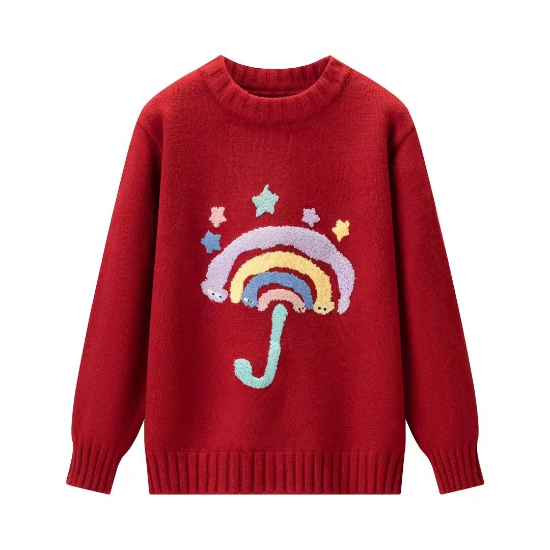 圆领卡通毛巾绣针织毛衣,圣诞新年红七色彩虹圆领针织衫女冬季新款法式小香风长袖加厚保暖毛衣,【软萌彩虹伞!把童话穿在身上】谁能拒绝这件会“冒可爱”的毛衣啊!圆领+软糯针织,贴肤暖乎乎的像抱了团云朵,胸前的彩虹伞立体刺绣太戳心啦——彩色伞面+星星点缀,还有小眼睛偷偷露出来,奶黄温柔、灰调百搭、酒红显白,穿在身上自带软萌滤镜,秋冬不管搭牛仔裤还是小裙子都超甜!