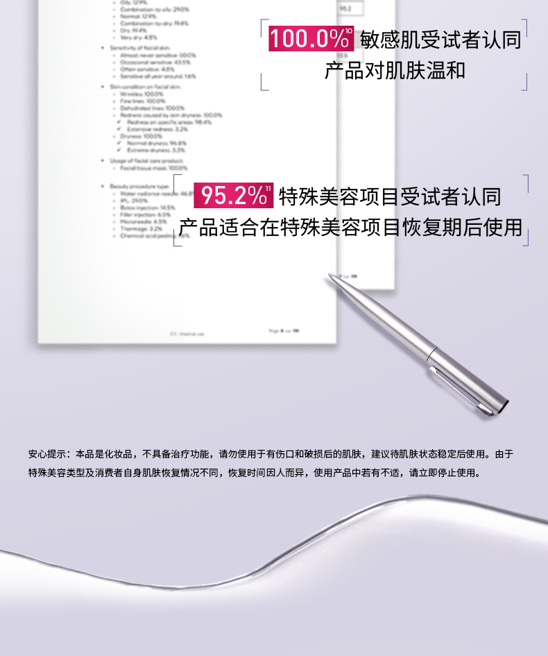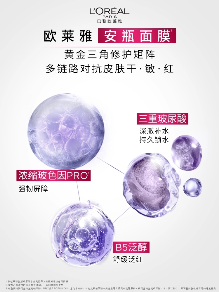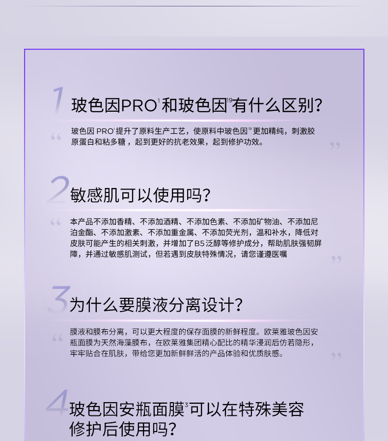| 产品介绍:创新设计膜液分区,鲜注面膜可以最大程度保持面膜的新鲜度,没有与膜布接触的精华更能保持他的活性,密封的分离式包装,也保证了无菌、卫生的储存环境;相比较旧版本面膜,这款新版的无香型浓缩玻色因PRO精华面膜在微分子玻尿酸+大分子玻尿酸的基础上又添加了长效玻尿酸,三层玻尿酸配方层层渗透,把补水保湿这块拿捏了,去掉香精之后,真正做到了0添加无刺激,成分安全,作为基础补水面膜,是再好不过的。 - 主要成分:三重玻尿酸配方-层层渗透,深澈补水; 1.乙酰化玻尿酸-长效抵御透明质酸的降解,持久作用于肌肤; 2.微分子玻尿酸-分子量为普通玻尿酸分子的1/20,深透吸收; 3.大分子玻尿酸-在肌肤表面,形成缩水膜,锁水保水。 - 产品质地:透明啫喱质地,服帖不滴液;轻盈肤感,仿若隐形。 (质地因版本批次不同情况不同会有微小差异,品牌品控和做工问题,这类产品问题各品牌都各有千秋,属正常情况~) - 使用方法:1.将内袋右侧沿虚线向中间折; 2.将内袋左侧向中间折; 3.按压精华液部分使其注入膜布; 4.充分揉捏使精华液被膜布均匀吸收; 5.取出面膜,轻敷于面部,15分钟后取下,轻柔按摩促进成分吸收。 - 注意事项:因个人肤质不同,如有不适,请立即停止使用。使用时避免直接接触眼睛,如不慎入眼,立即用清水冲洗。请置于婴幼儿触及不到之处,请勿于极高温度、极低温度下或日光直射处存放。 |