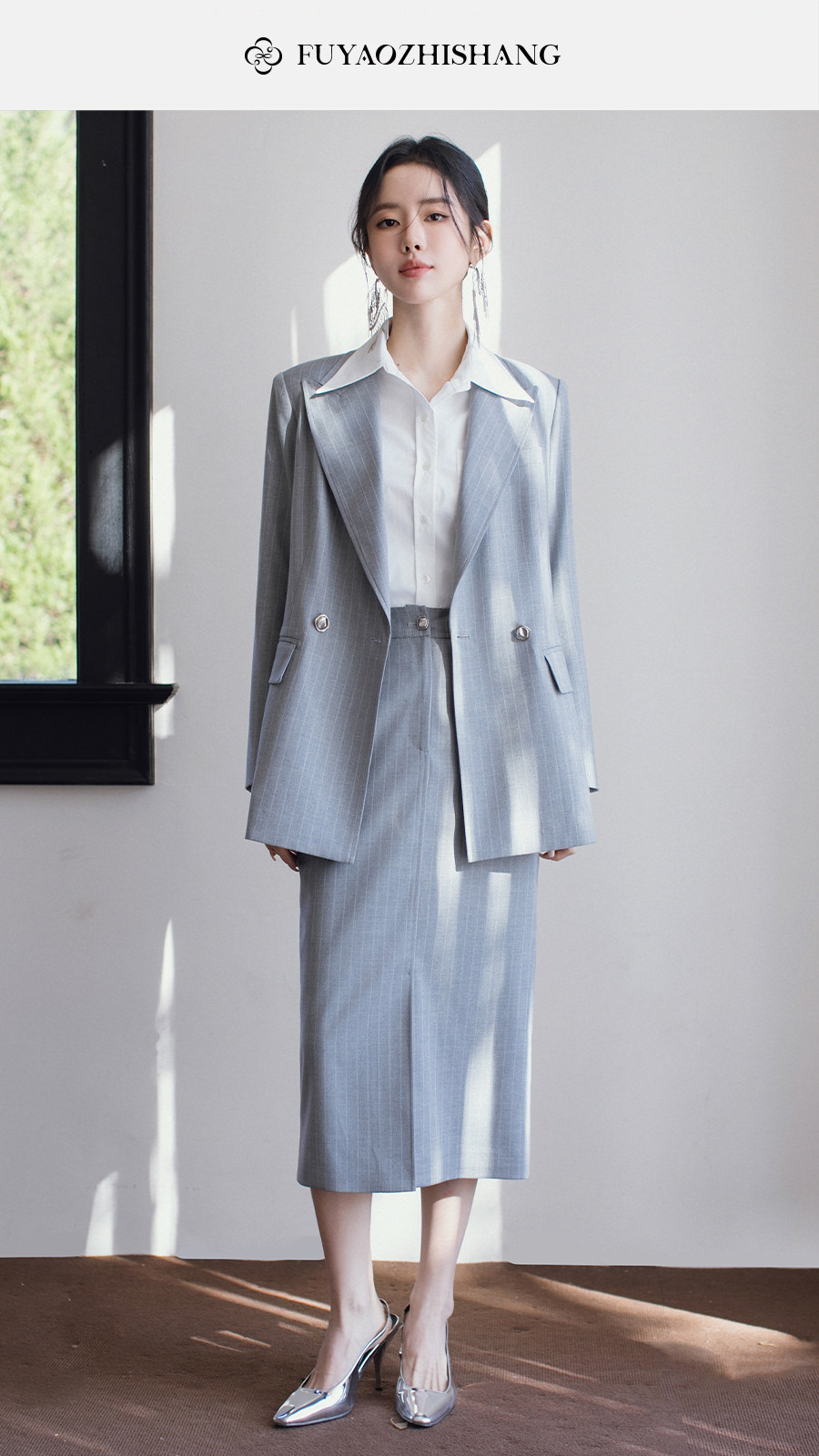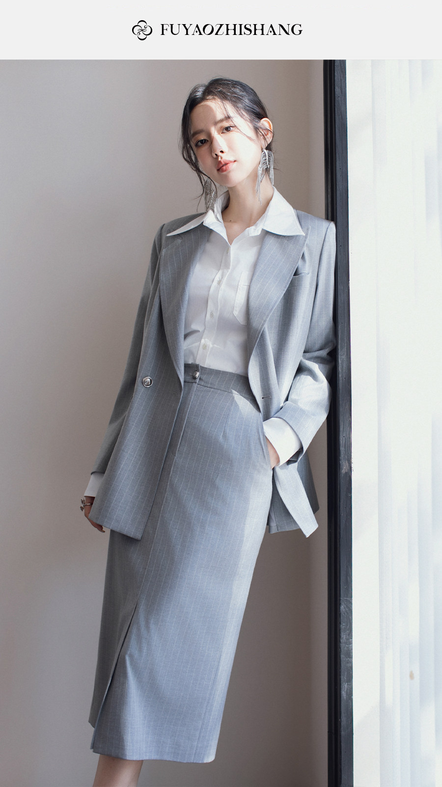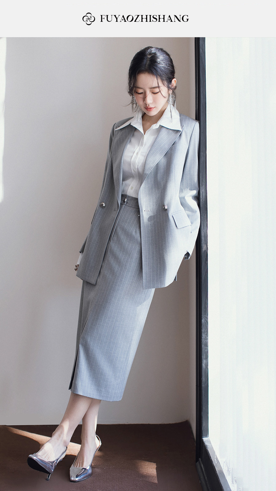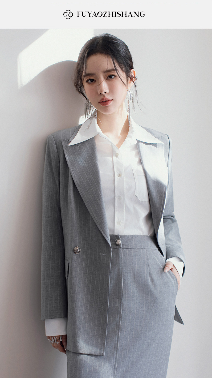 FUYAO扶摇直上 灰色条纹西装套装女春季面试宽松西服半身裙两件套