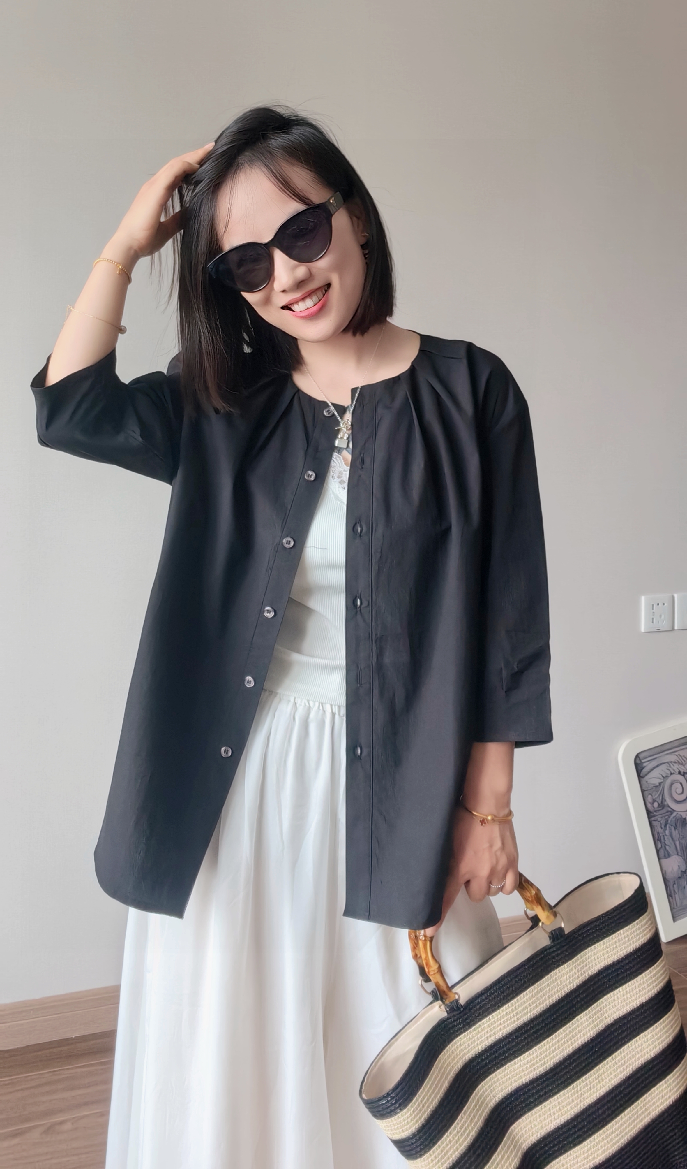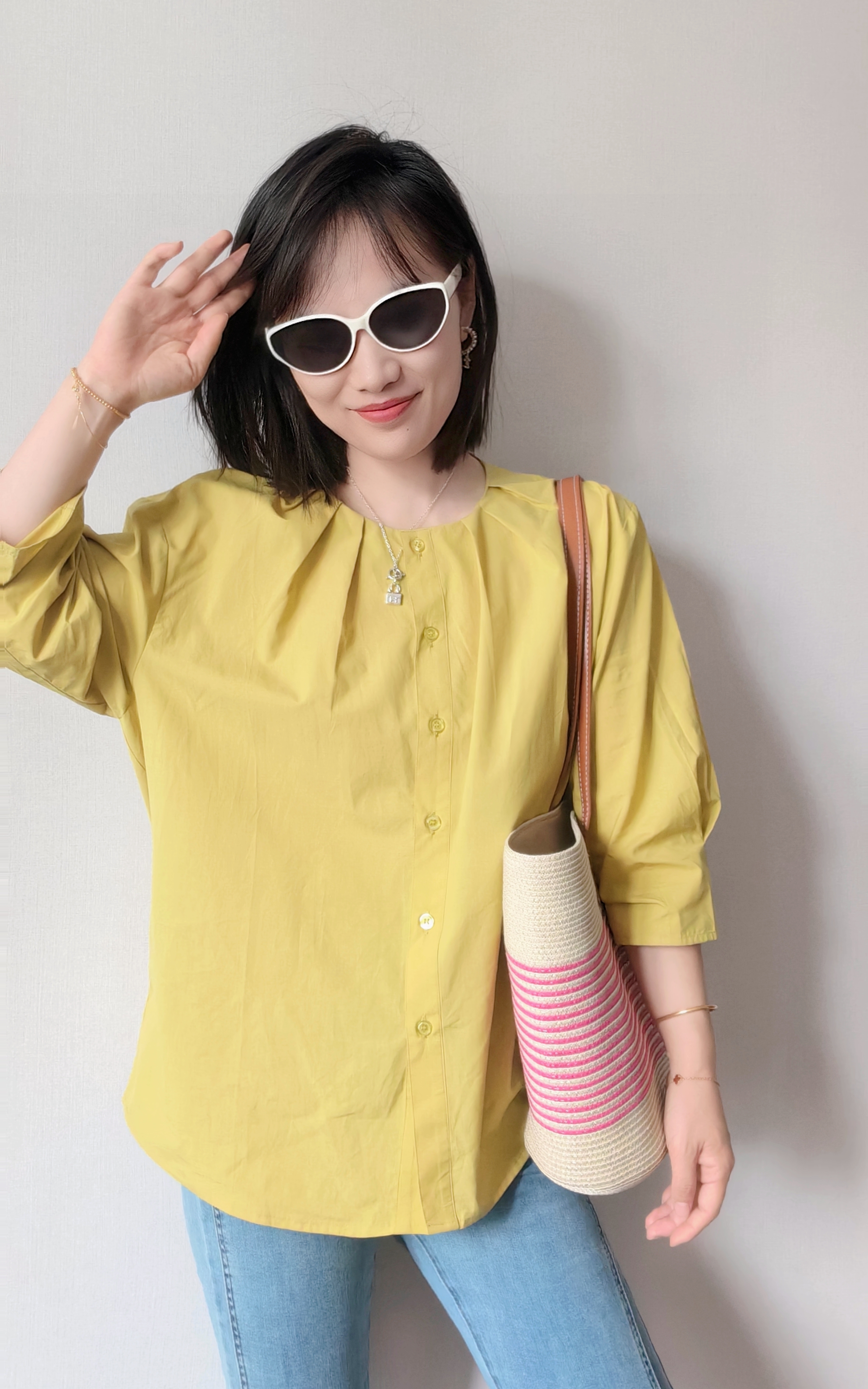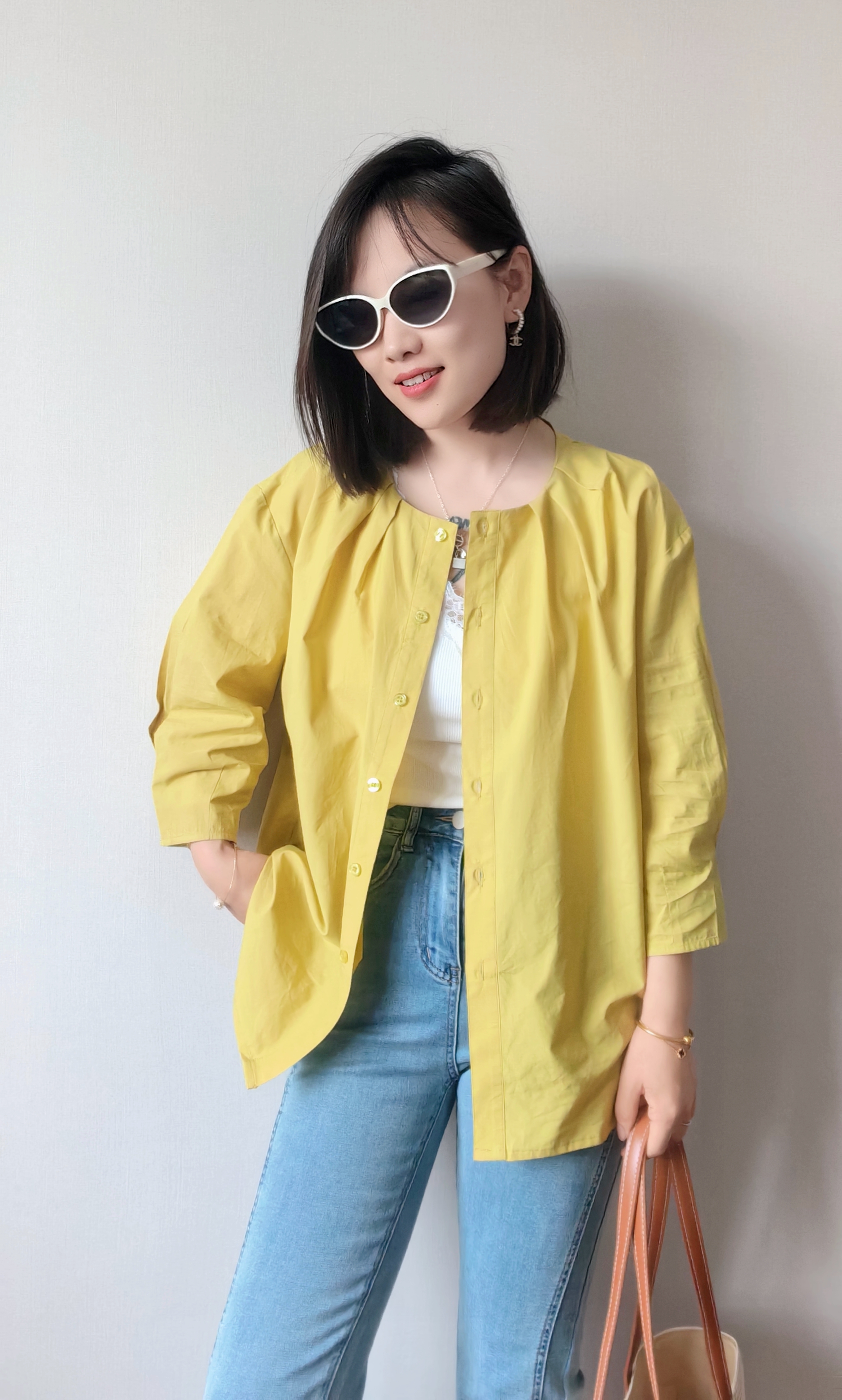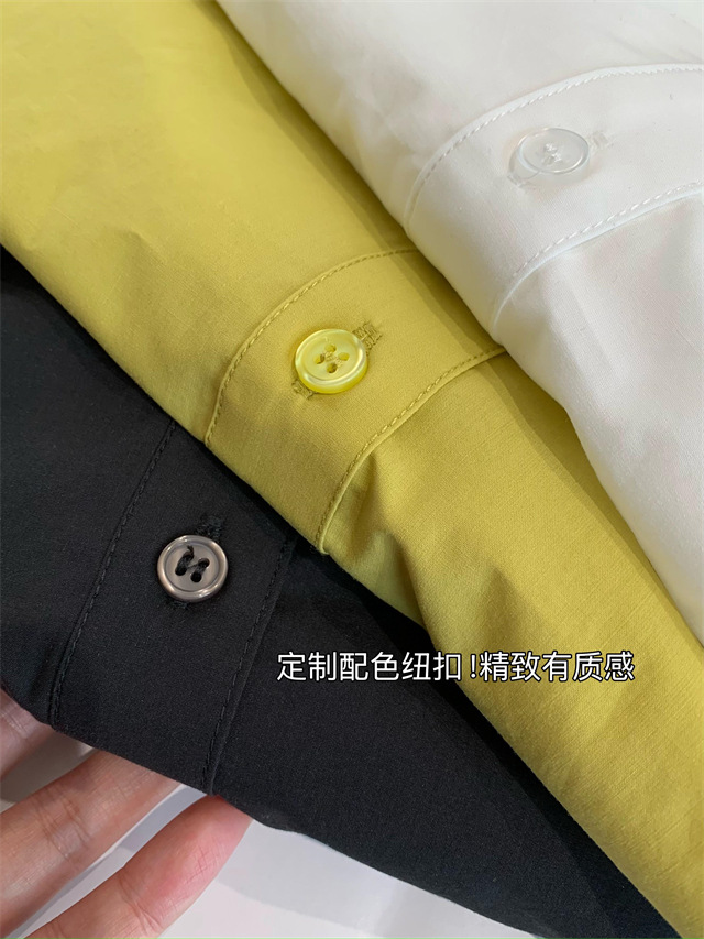 这件衬衫上身薄显瘦的功力菲常棒,下摆是弧形的设计,日常在穿的时候侧面的线条特前好看,