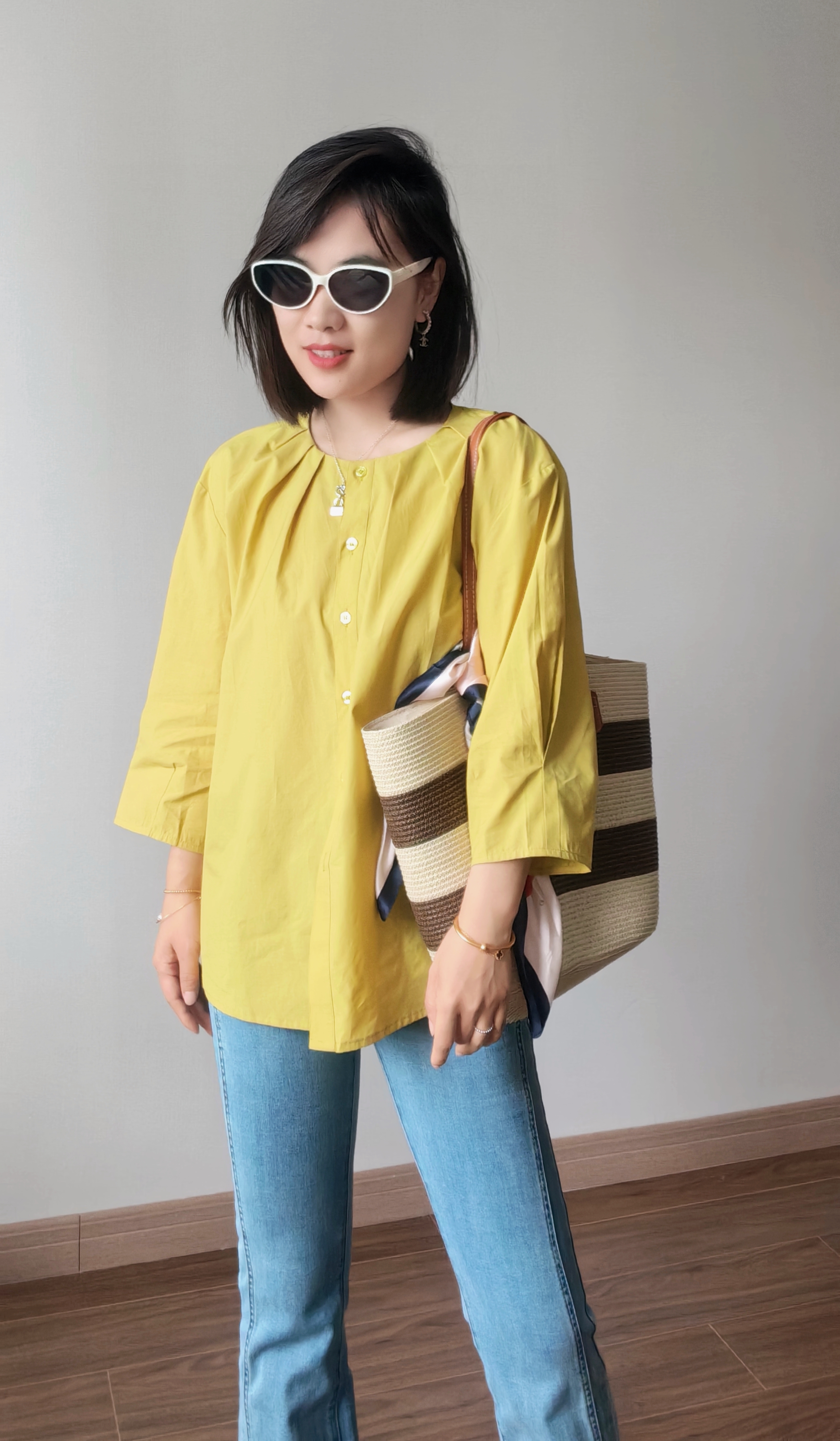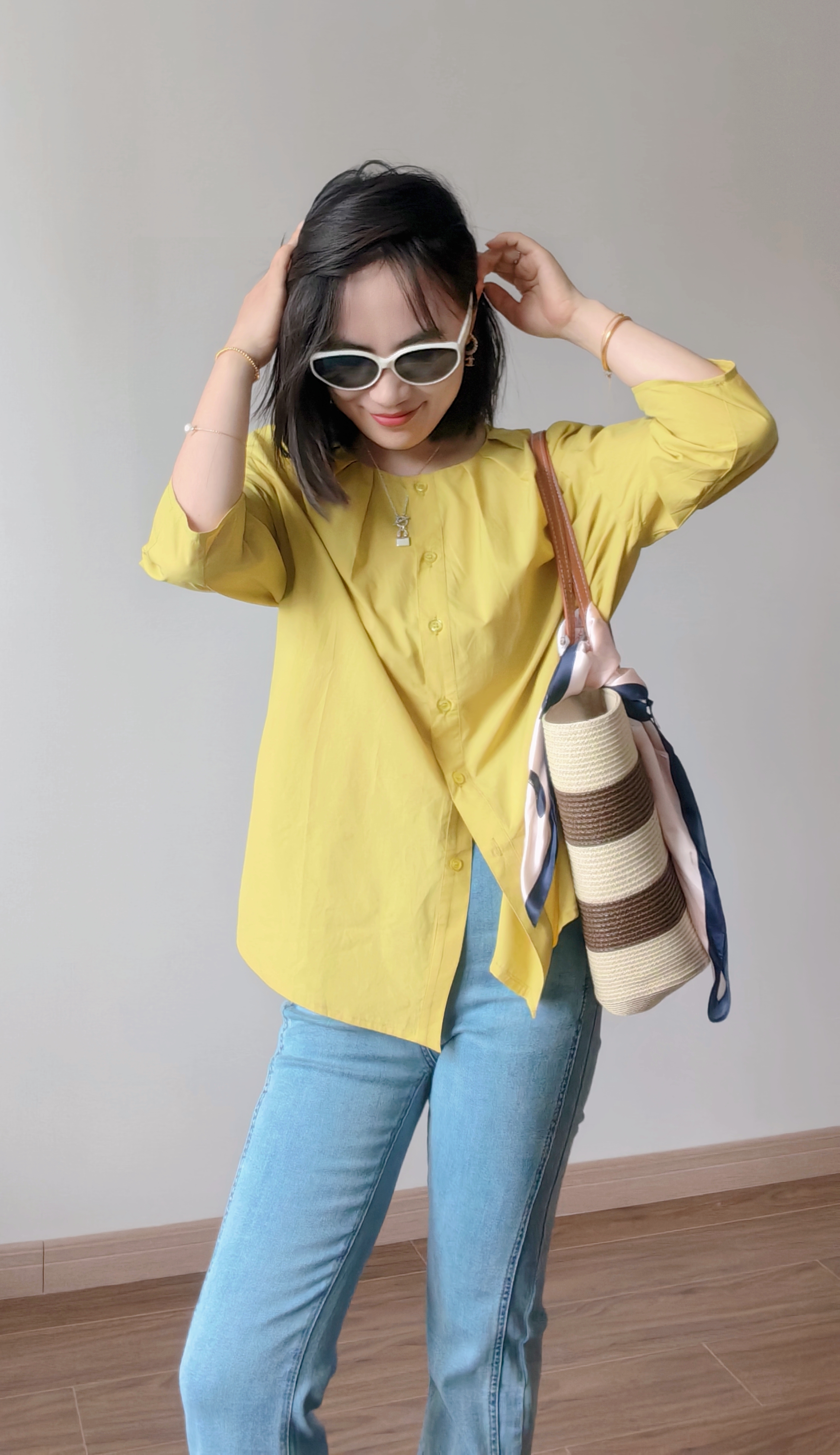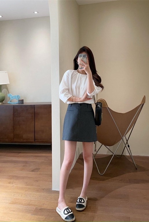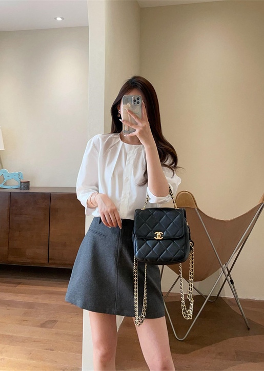 这件衬衫上身薄显瘦的功力菲常棒,下摆是弧形的设计,日常在穿的时候侧面的线条特前好看,
