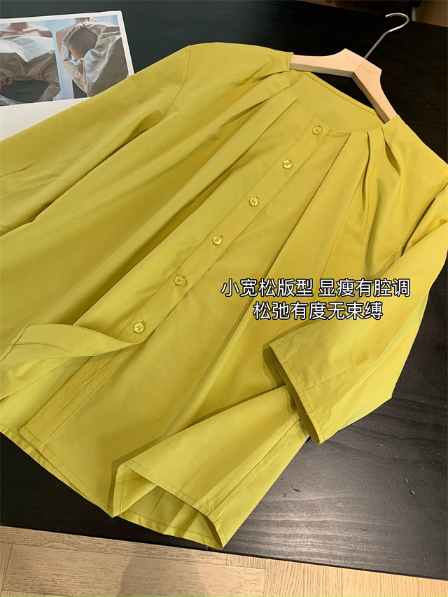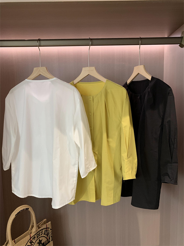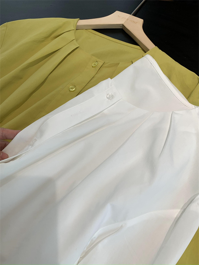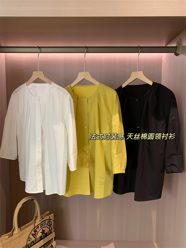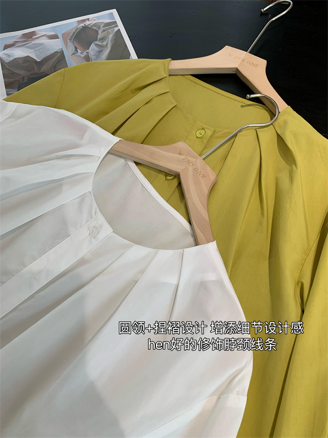 捏褶小圆领显的脸型和脖颈线条很好看,60支100g高密天丝棉面料,视觉上有哑光感低调有质感。