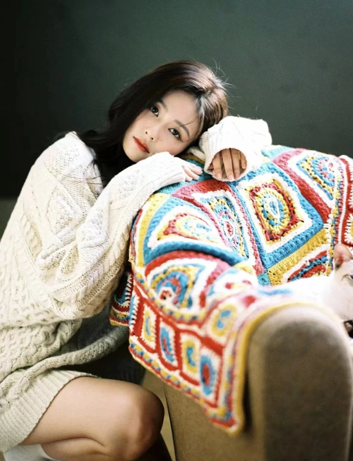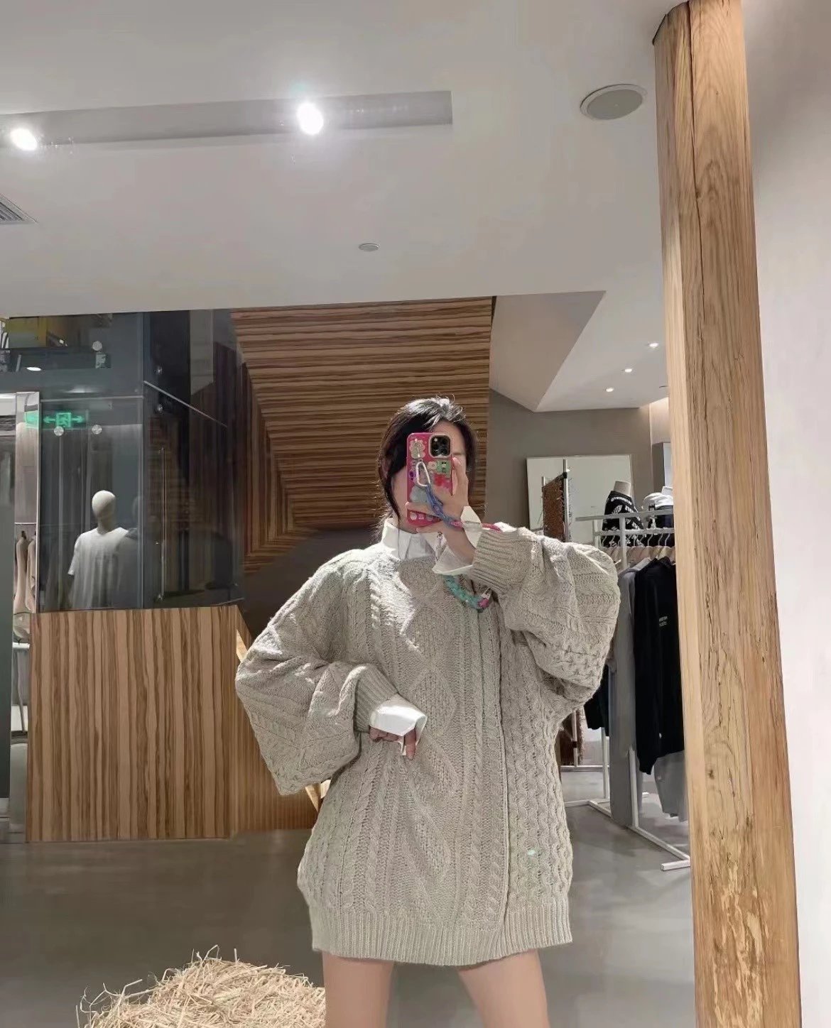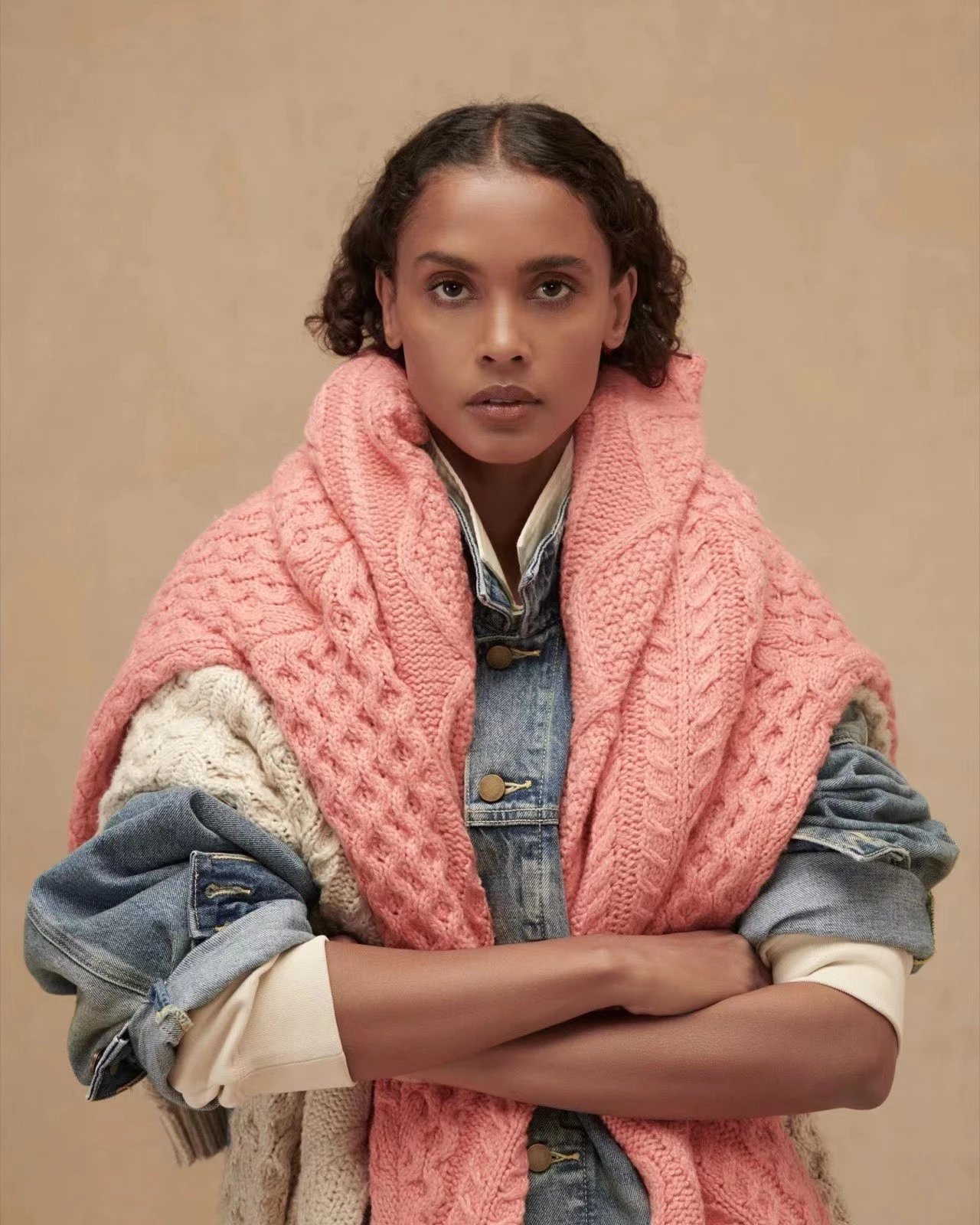 斜肩插肩袖加上OVERSIZE的版型设计,同样也是毛衣中比较费时费工的做法,再加上多种绞花工艺,整件衣服需要3个多小时才能完成。