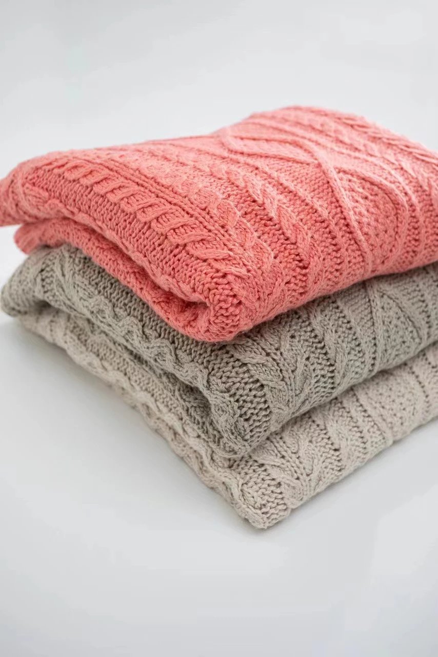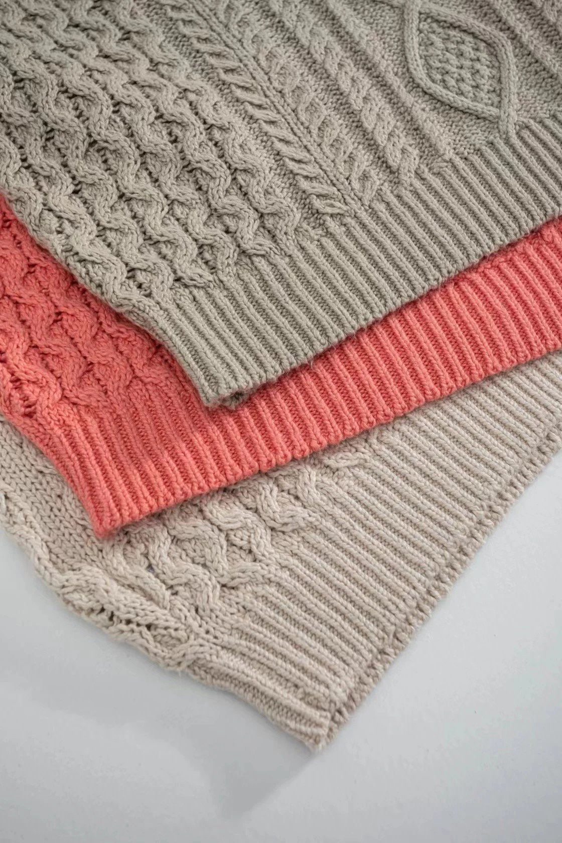 阿兰花织横机编织中最费时的针法之一,编织过程非常缓慢。阿兰花两侧分别排列了小绞花、大绞花、对绞花、交错绞花,整件衣服立体感非常的强烈,凹凸明显。