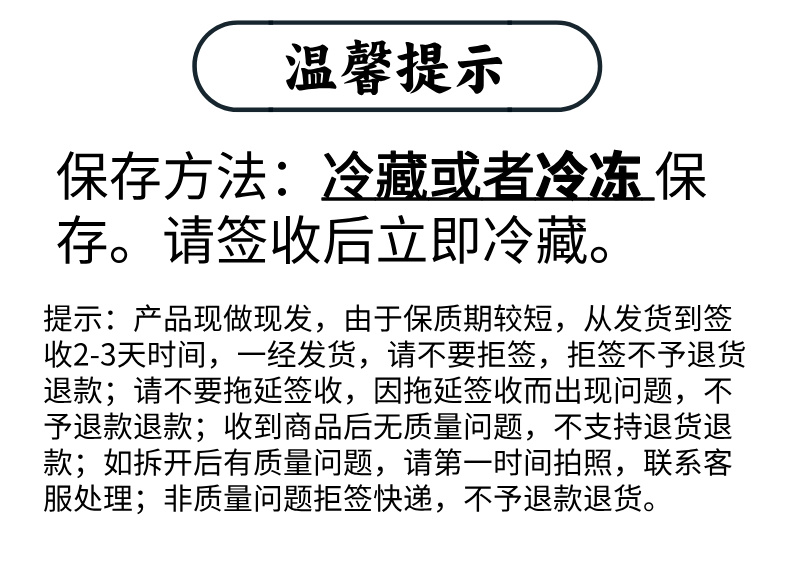 ②因生鲜产品具有特殊性和相关规定,下单时请一定认真确认收件信息,因客户原因导致转寄、延派、误派、口感问题等不在理赔范围,生鲜产品不支持拒收、退货,如遇包装受损等问题需签收反馈售后。