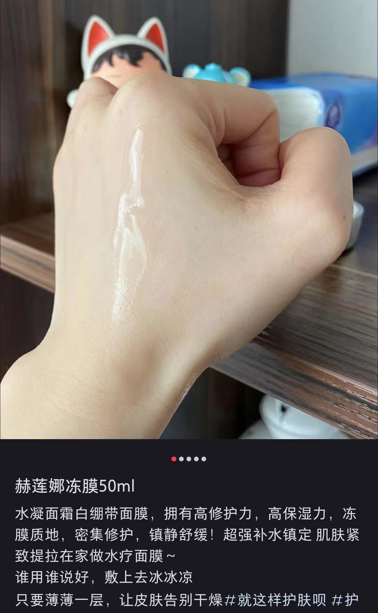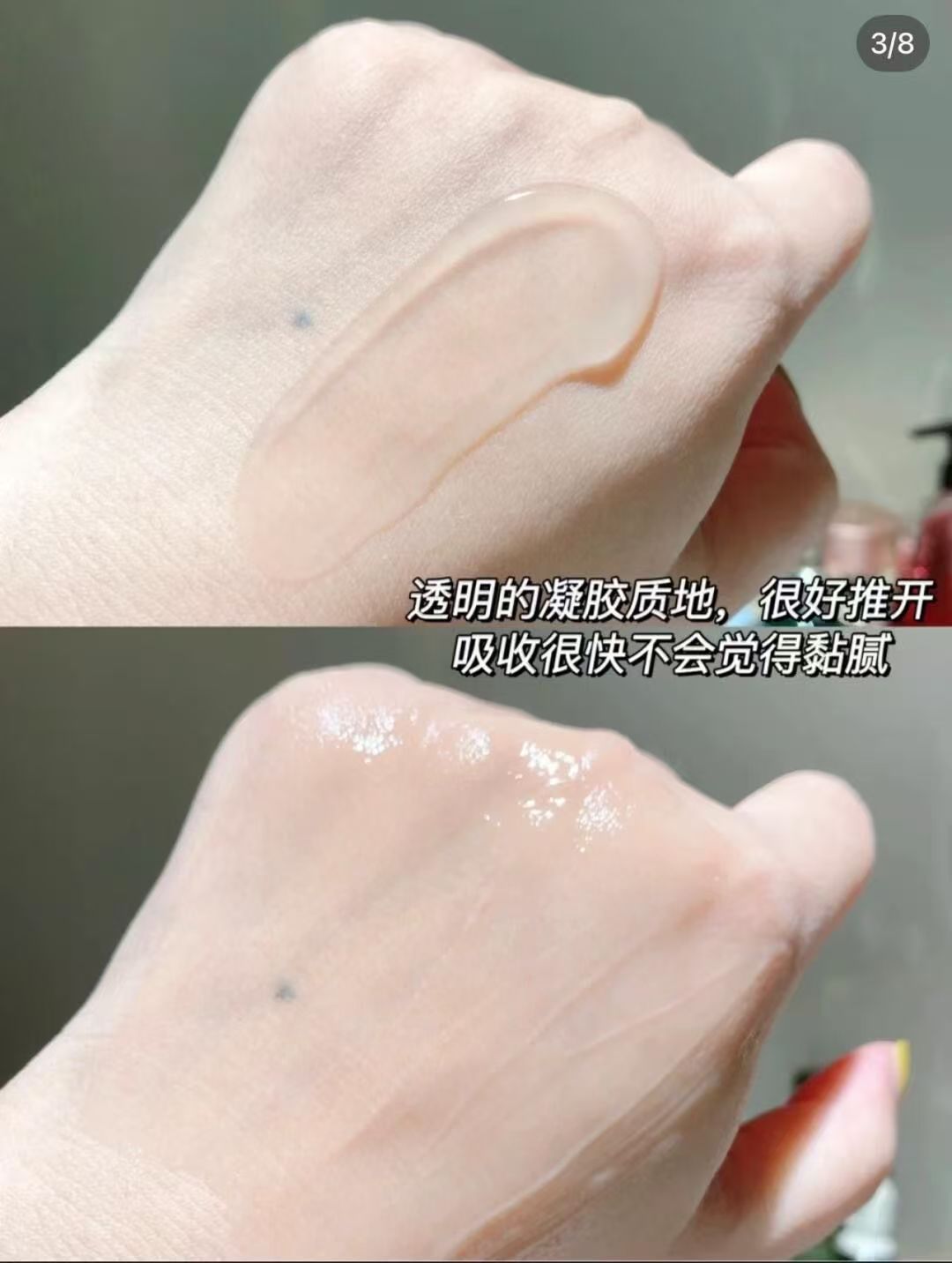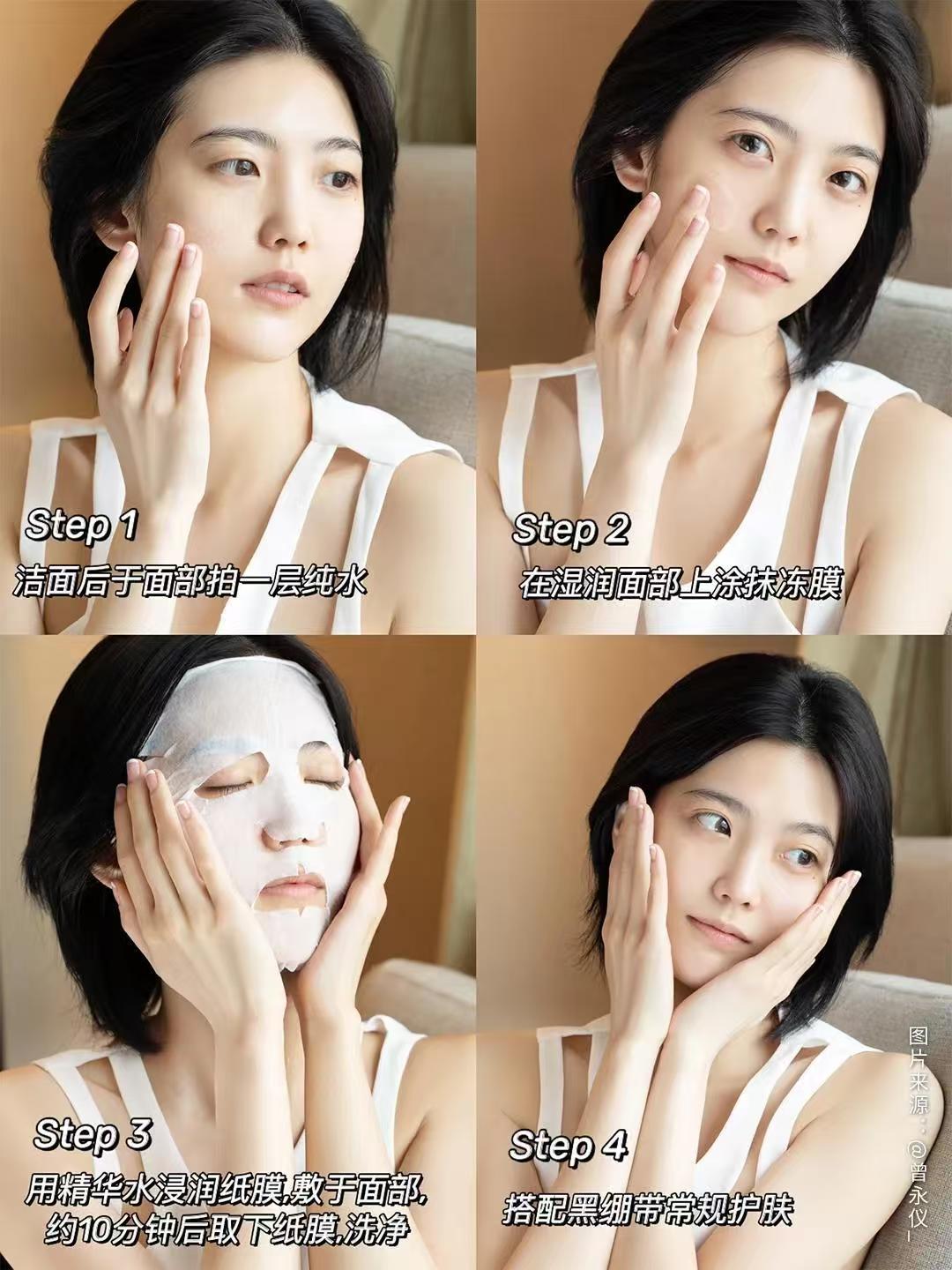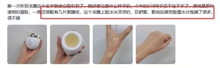 果冻质地,看着很治愈~上脸后会有微微的凉感,非常适合干皮敏感肌,再敷浸湿的面膜纸,辅助锁水留住养分~一周两次就还你胶原蛋白。