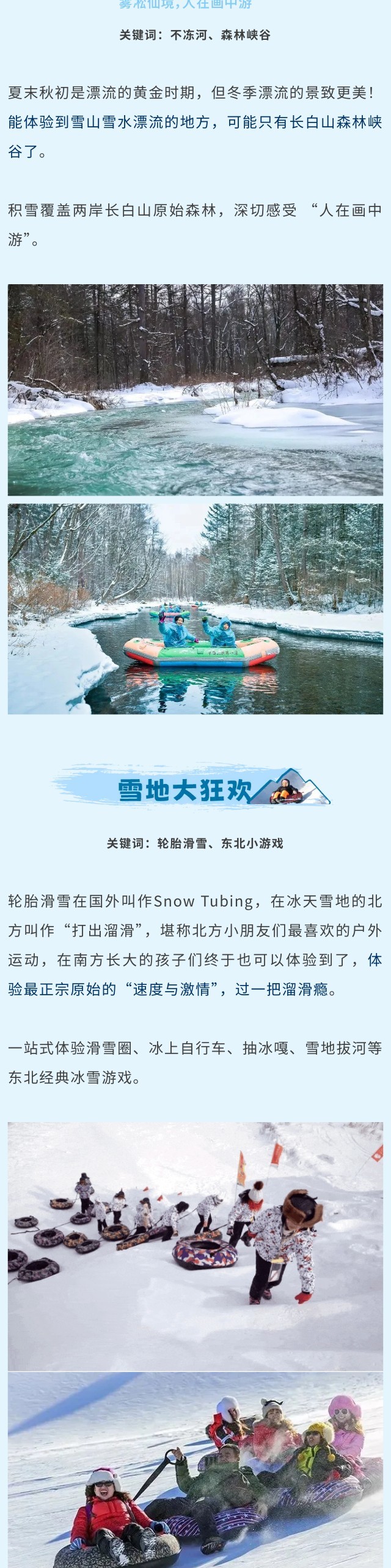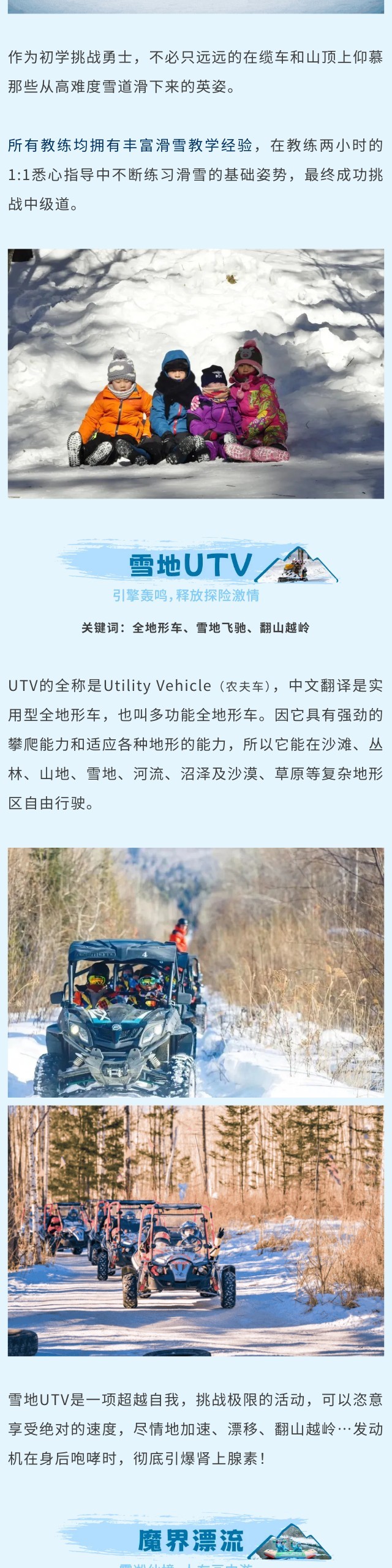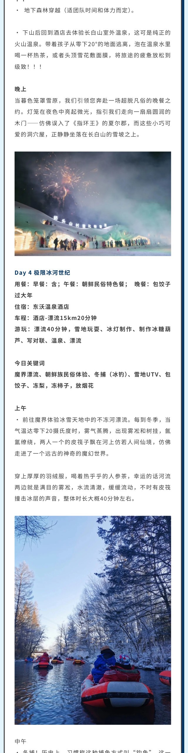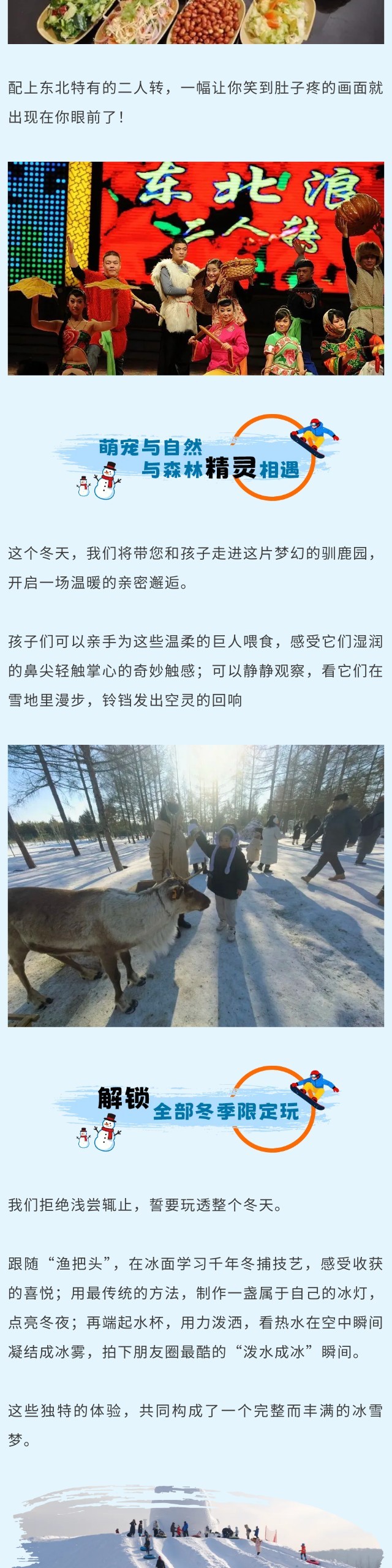 滑雪4小时(不含滑雪教练)、冬捕(不满15人则安排冬钓)、雪地穿越、马拉雪橇、雪地UTV:制作冰灯、冰糖葫芦,辣白菜,包饺子、放烟花、朝鲜族民俗 不冻河漂流,乐园套票:含滑雪圈、冰上自行车、抽冰嘎等雪地娱乐项目;驯鹿园喂食,围炉煮茶。