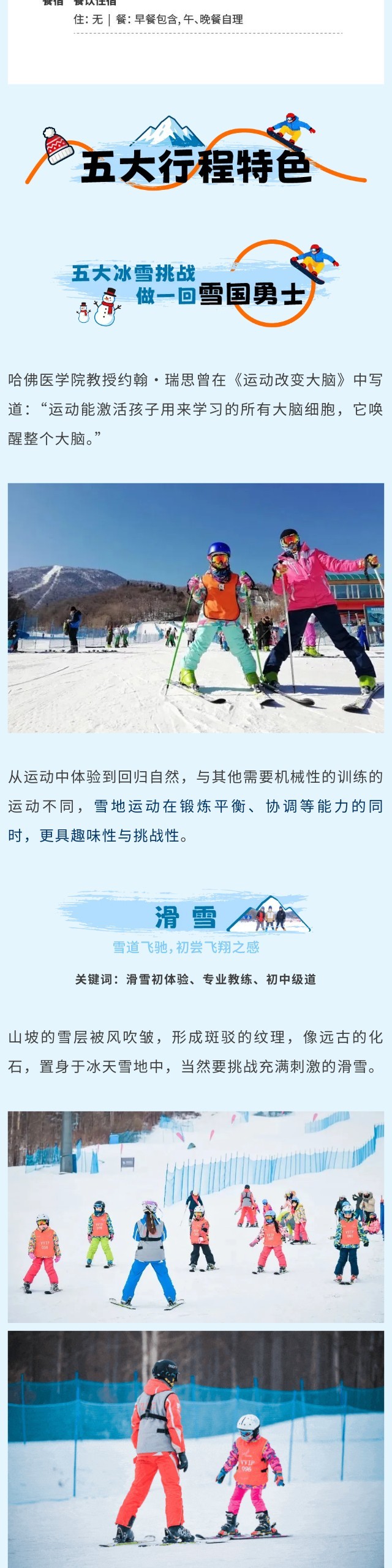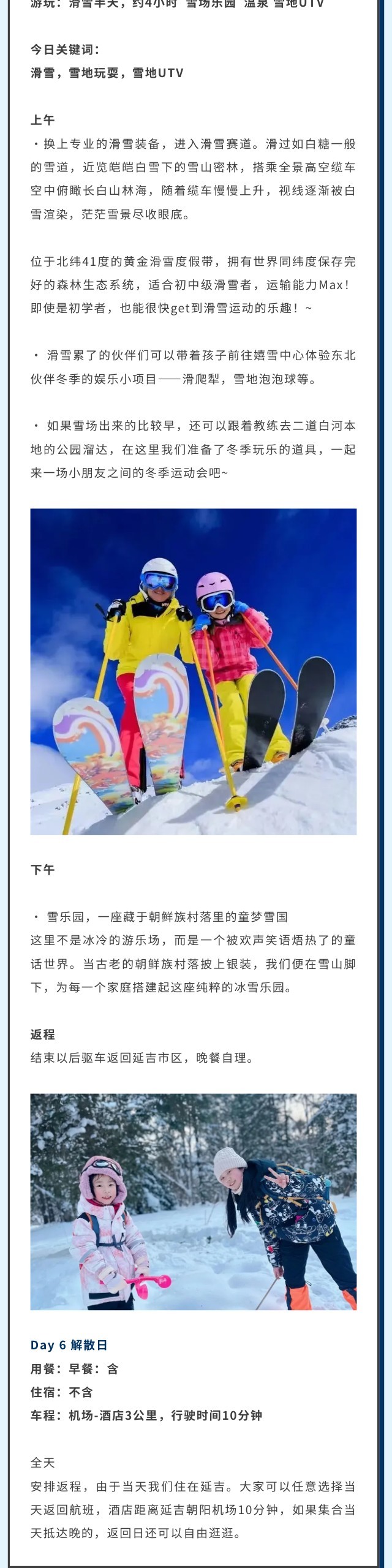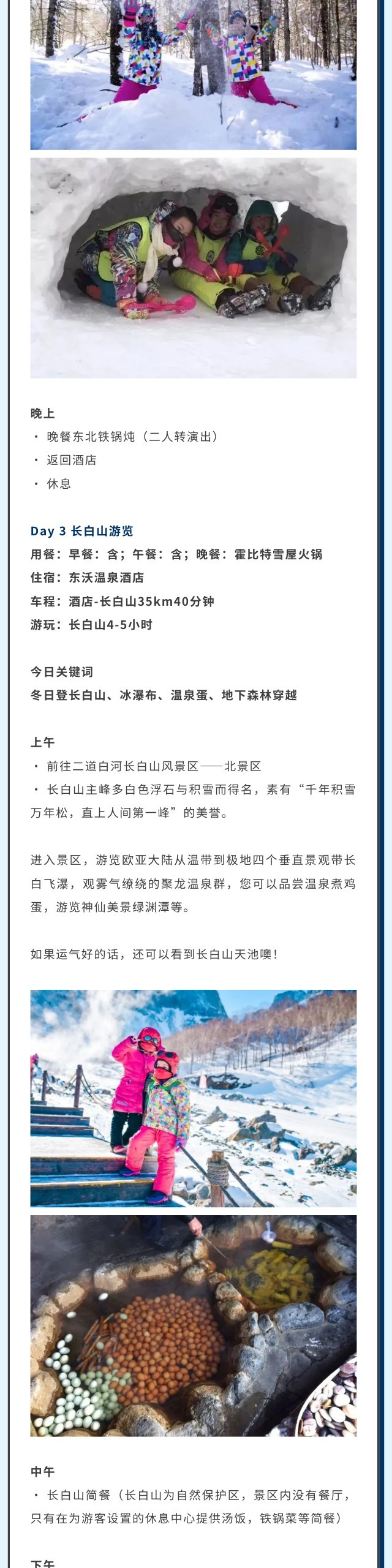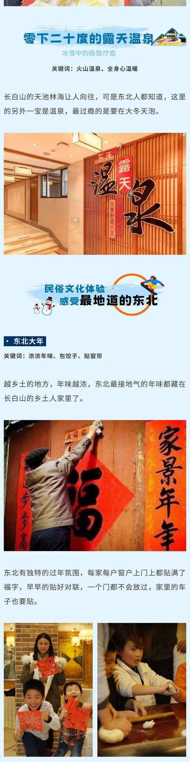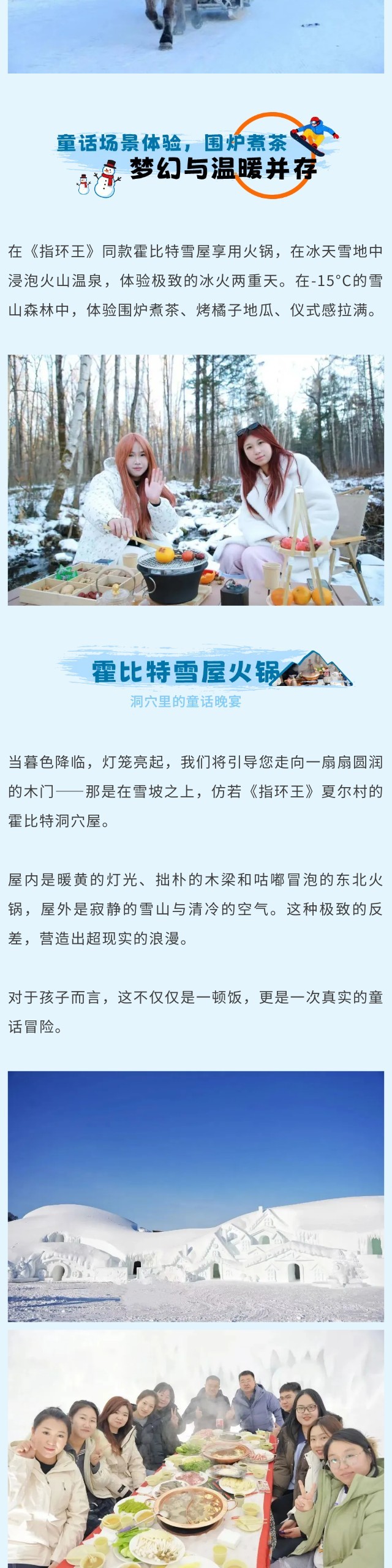滑雪4小时(不含滑雪教练)、冬捕(不满15人则安排冬钓)、雪地穿越、马拉雪橇、雪地UTV:制作冰灯、冰糖葫芦,辣白菜,包饺子、放烟花、朝鲜族民俗 不冻河漂流,乐园套票:含滑雪圈、冰上自行车、抽冰嘎等雪地娱乐项目;驯鹿园喂食,围炉煮茶。