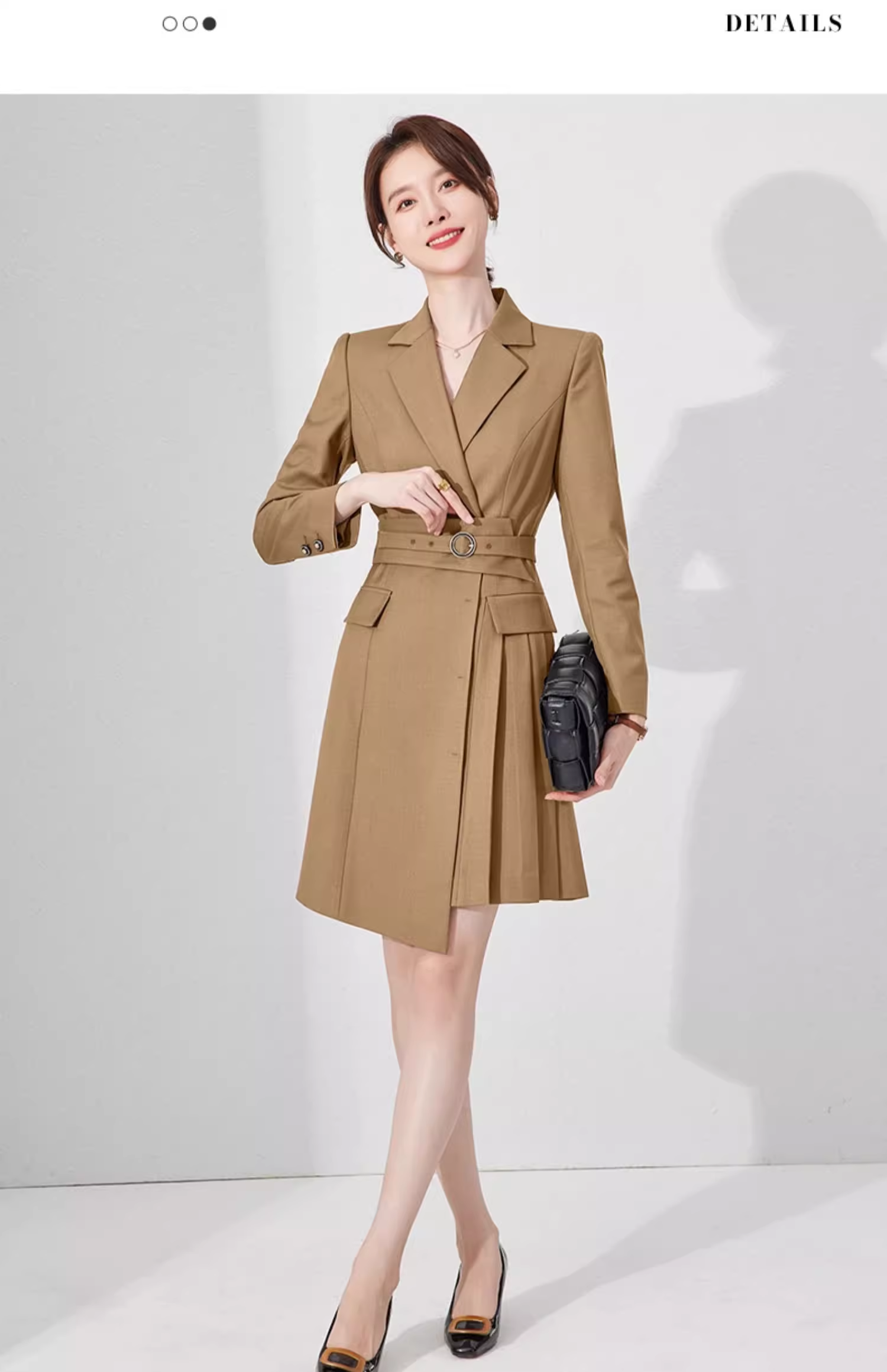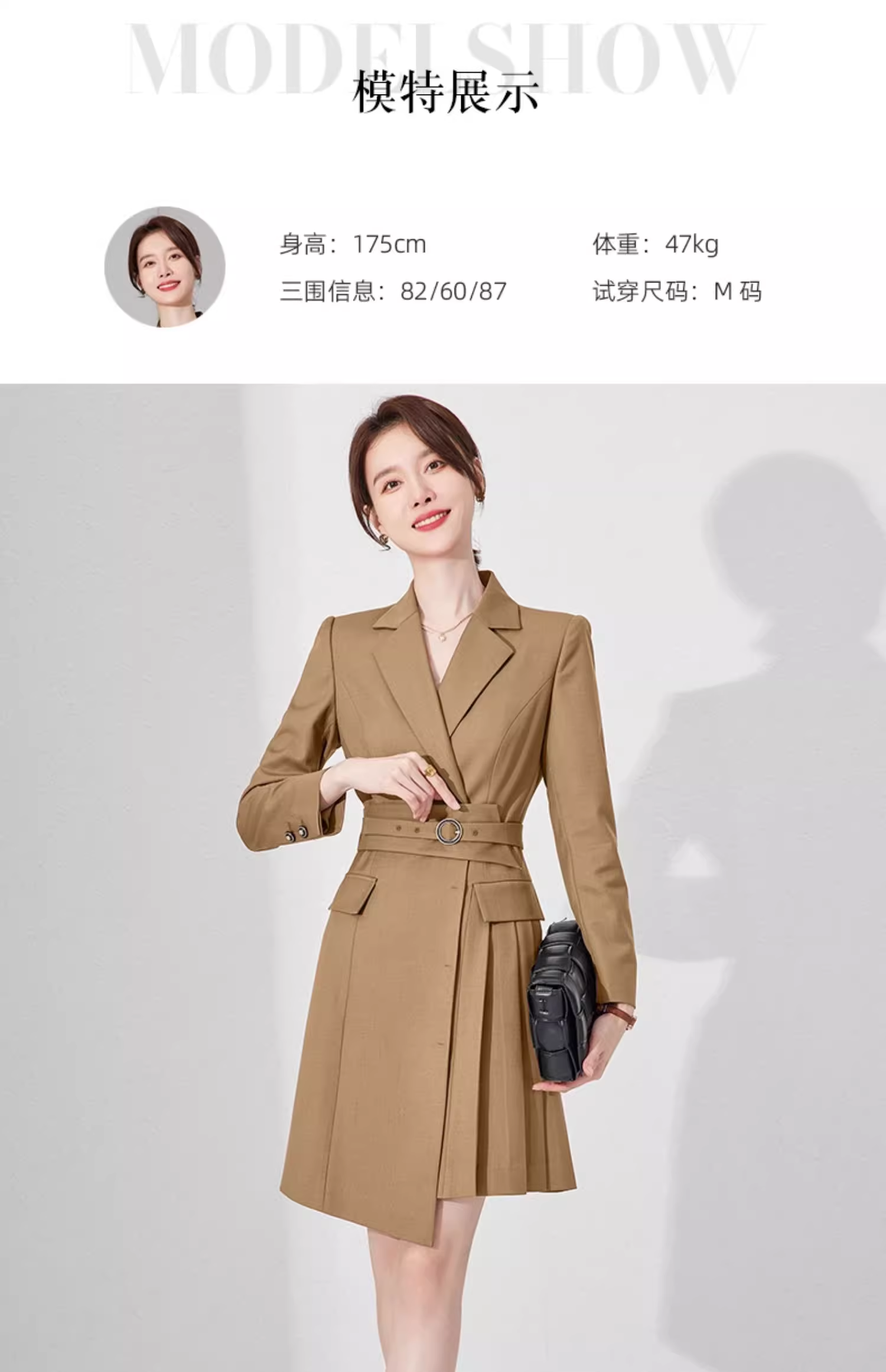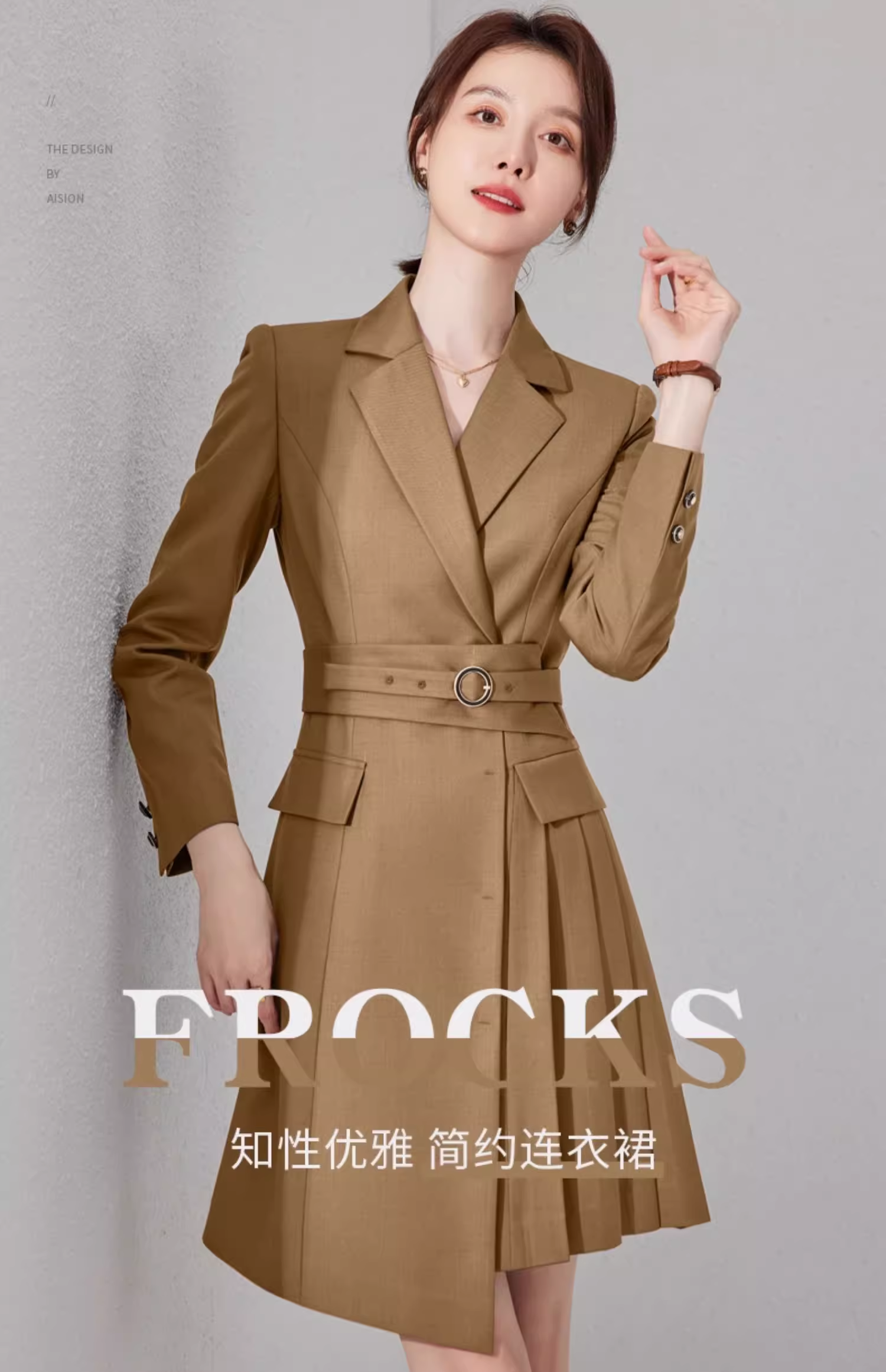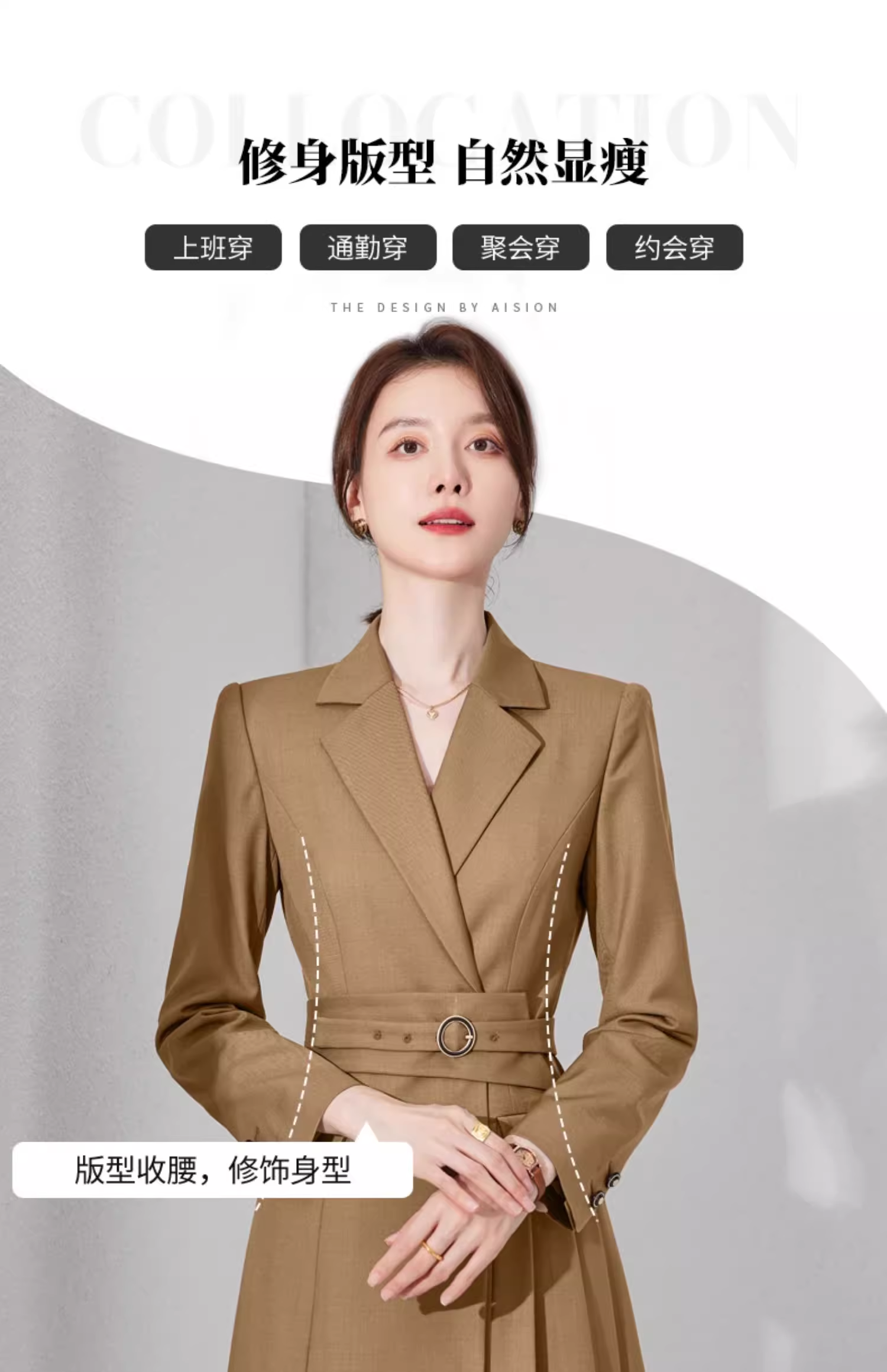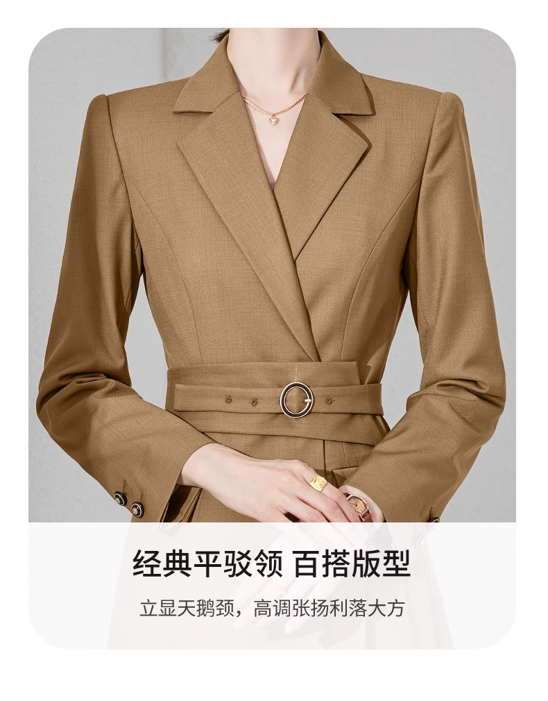 艾尚臣卡其色秋季长袖西装连衣裙时尚收腰女装高级感职场工作裙子