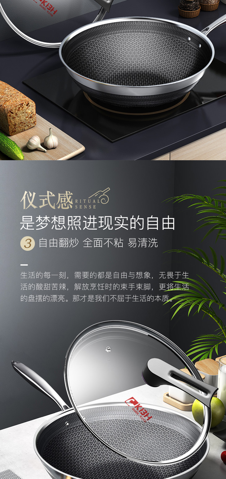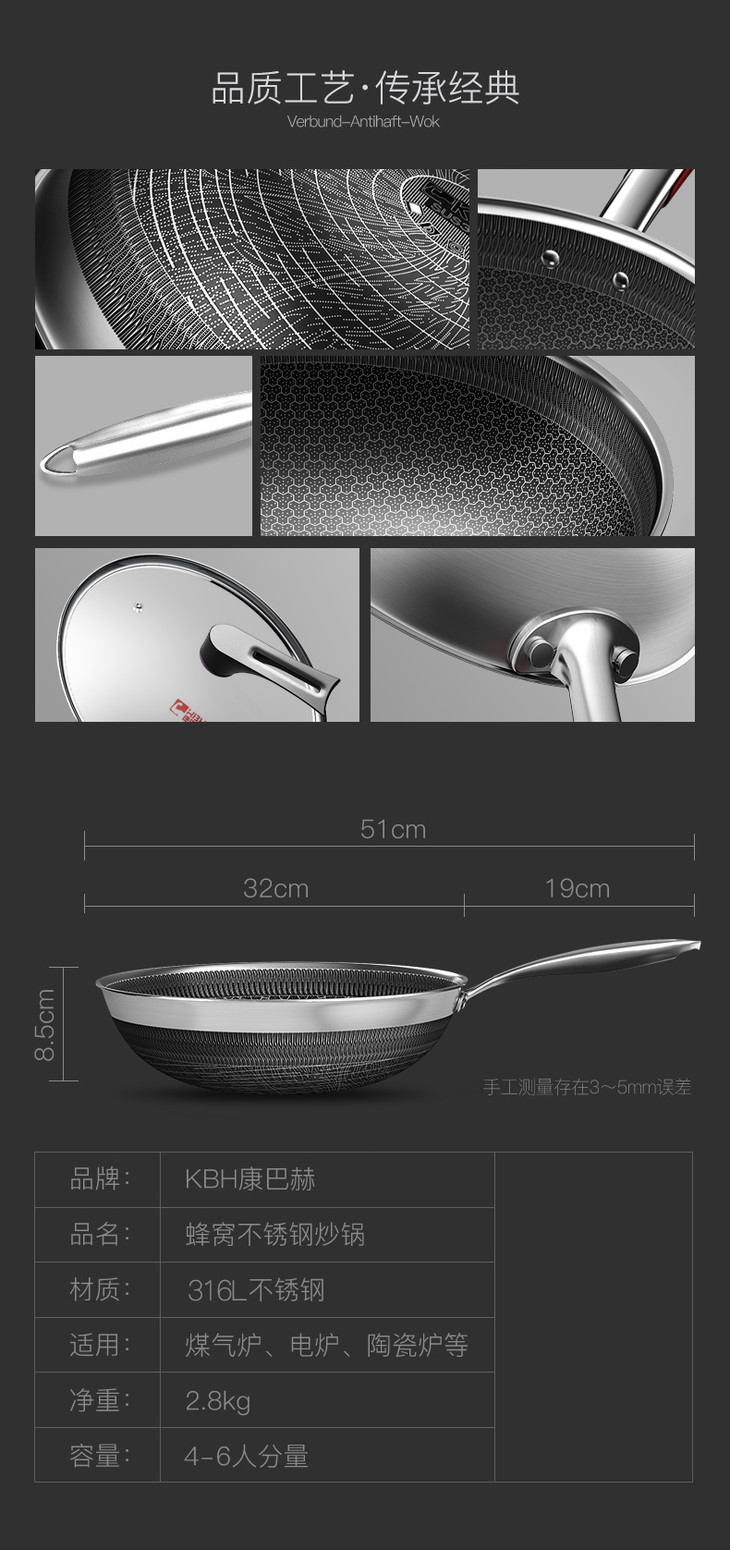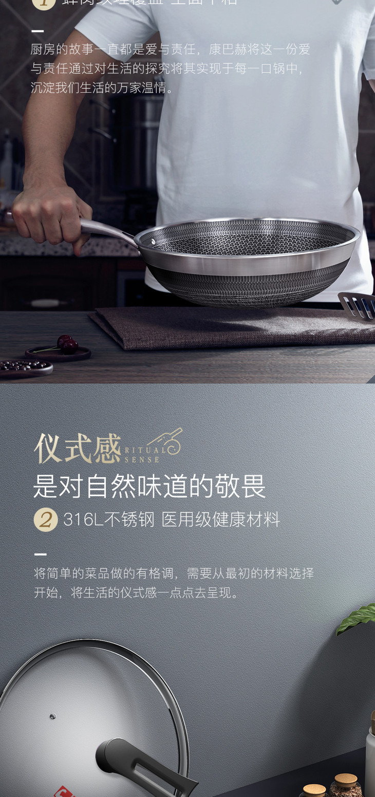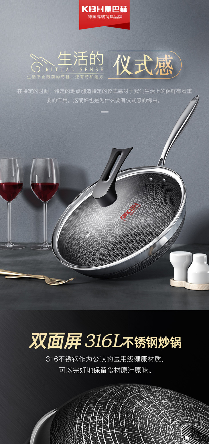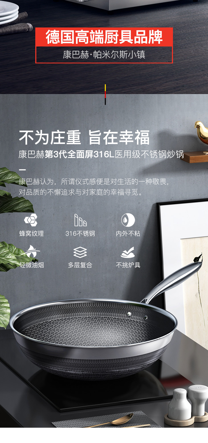 【包邮直发】康巴赫 CHC32A3第三代炒锅316L不锈钢炒锅少油烟不粘锅家用电磁炉燃气灶通用32cm