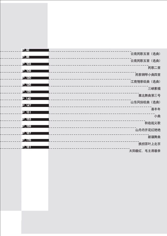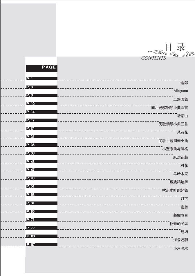 中国风格钢琴曲集共两册,本书是第二册,中级程度,相当于车尔尼作品299及299以上程度。选编内容集中在我国作曲家根据中国民歌、戏曲、歌舞音乐和民族器乐曲主题音调而创作的担忧浓郁民族风格的钢琴曲。这些作品从结构到音乐意境都远远超越了原母体材料。曲目包括《四川民歌钢琴小曲五首》《朴素的民风》《小河淌水》《三峡素描》《江南情景组曲》等。