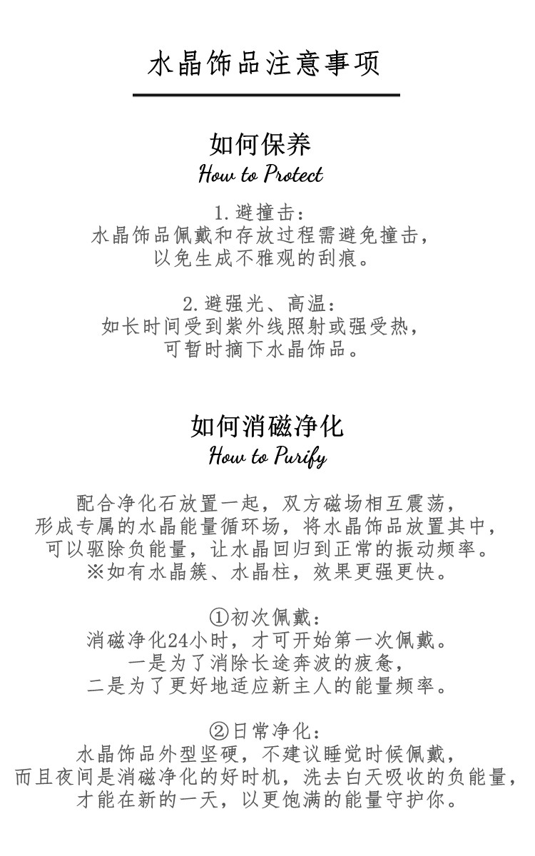 1、天然水晶,每块各有不同,有冰裂纹、杂质、色差等为正常现象,不影响美观和佩戴,以实物为准,敬请留意。