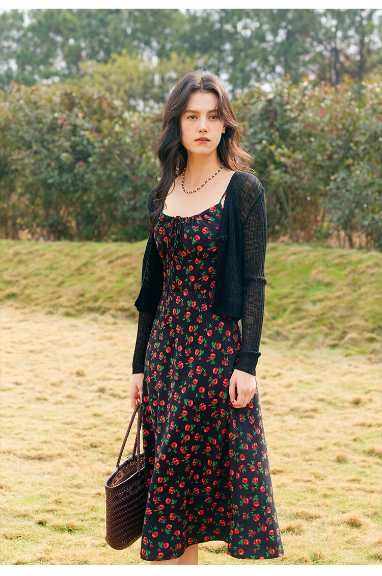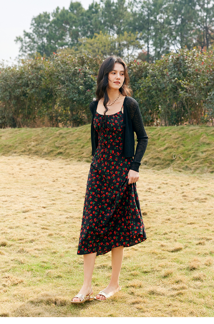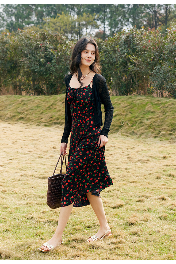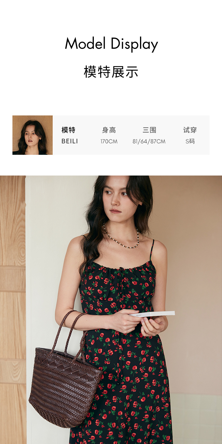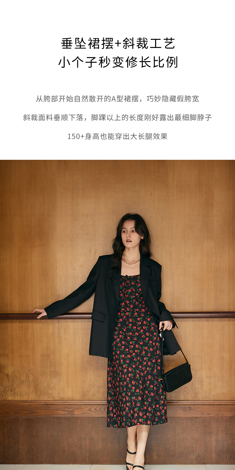 HeyDress原创玫瑰吊带连衣裙女夏季法式收腰浪漫海边度假印花裙子